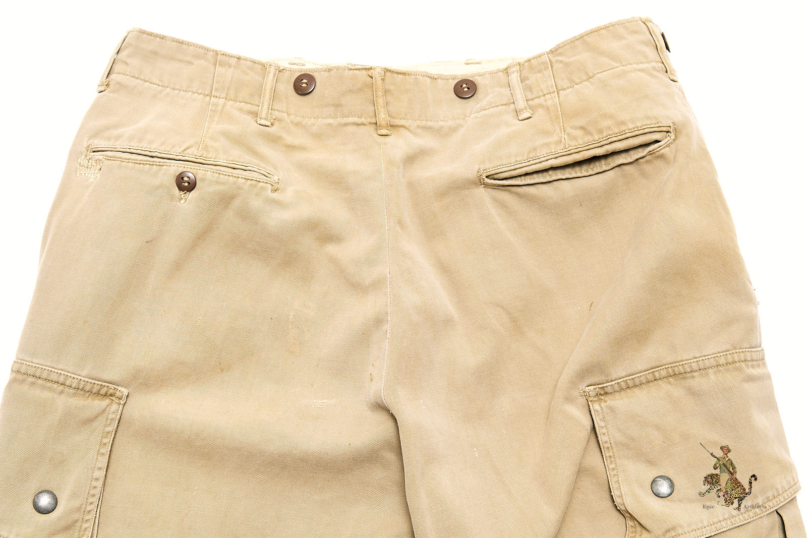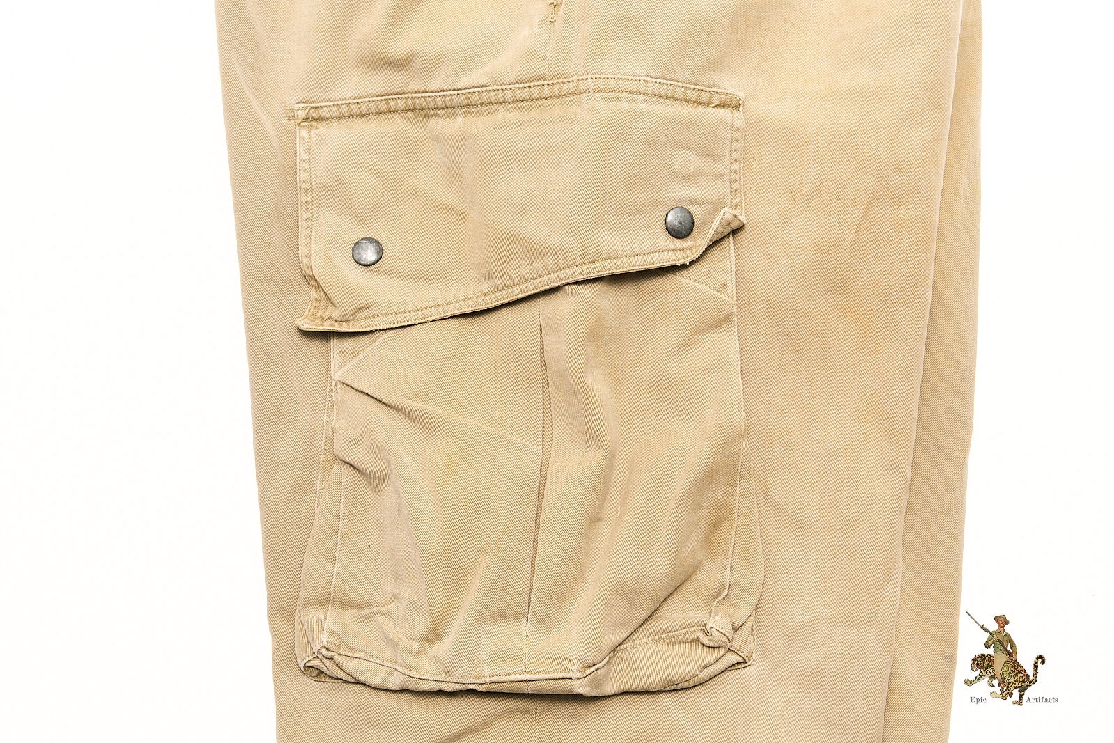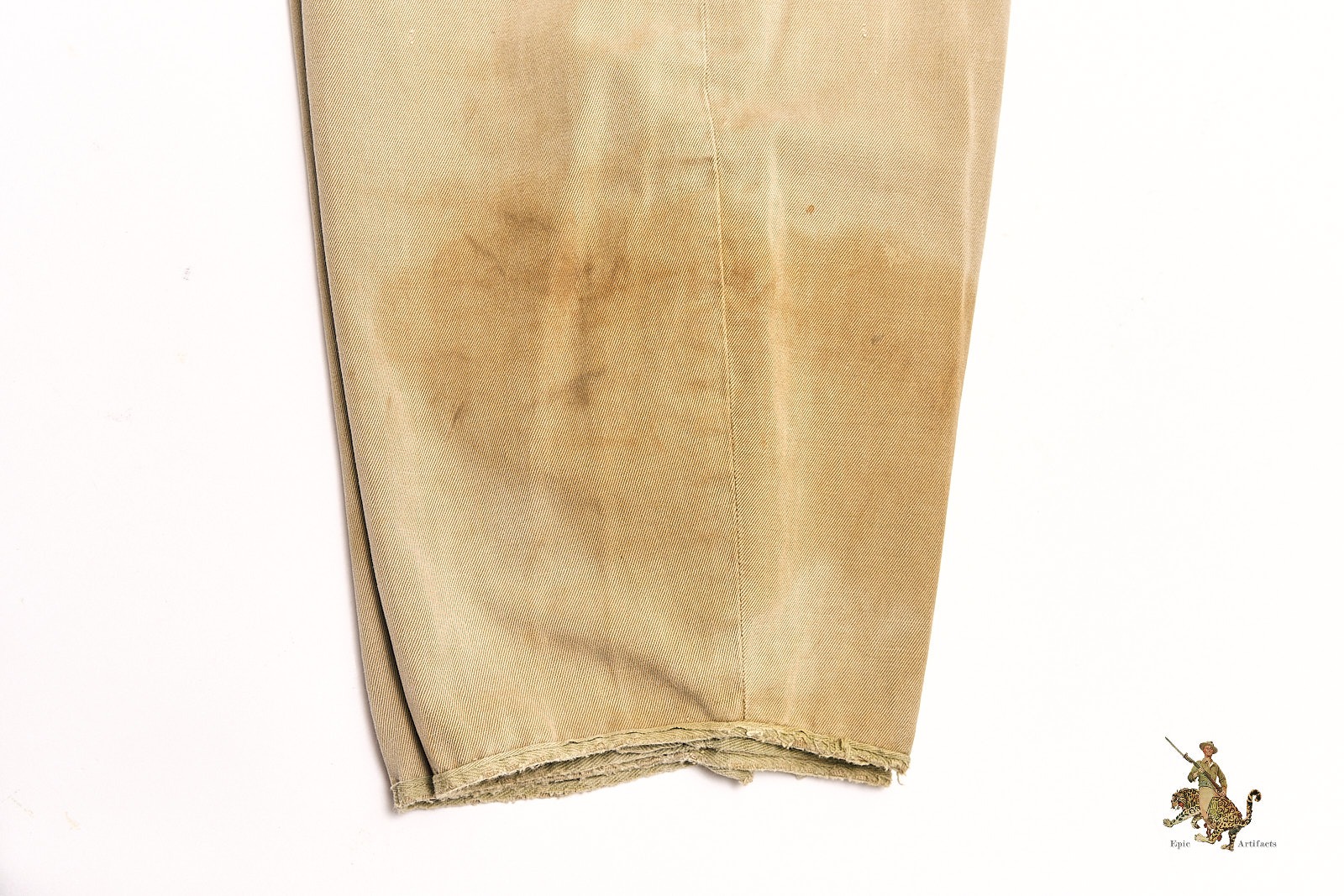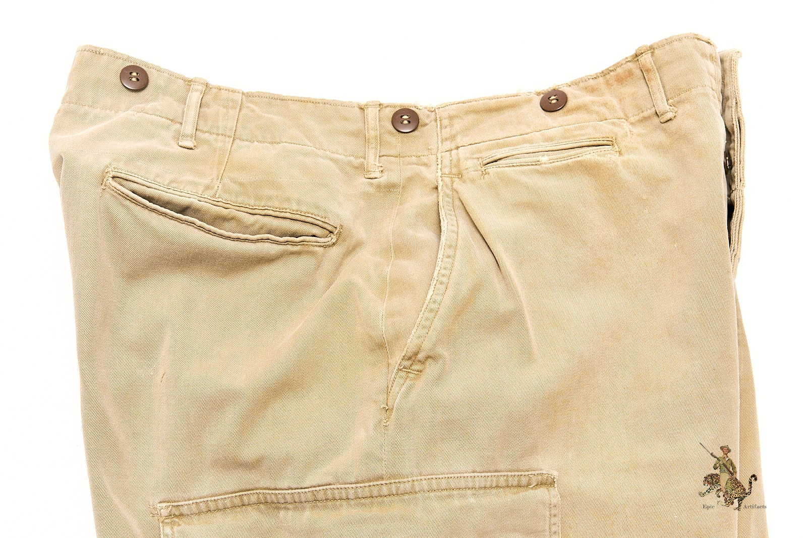 All buttons are present and appear original, including those at the fly and pocket flaps. Interior size markings remain legible along the waistline. The tag in the right pocket has faded with time, though its stitching remains intact. Light spotting and wear are evident throughout, with slightly darker discoloration at the lower left leg, consistent with field use. This is the standard-issue, non-reinforced version of the M1942 trousers—highly sought after for its early-war association with operations such as Sicily, Normandy, and Market Garden. A fine and authentic piece of U.S. Airborne combat uniform history.