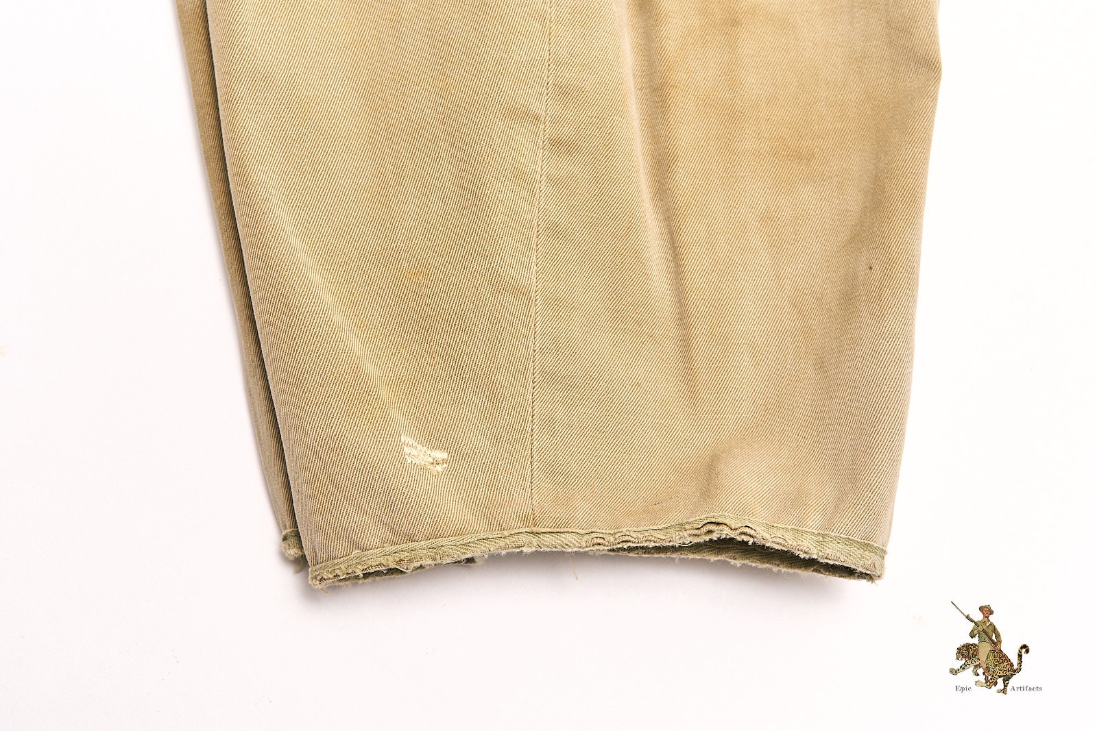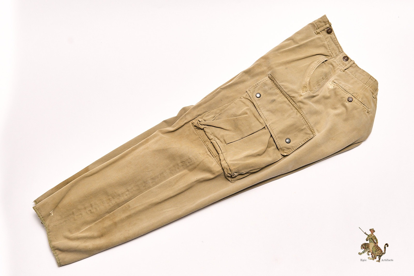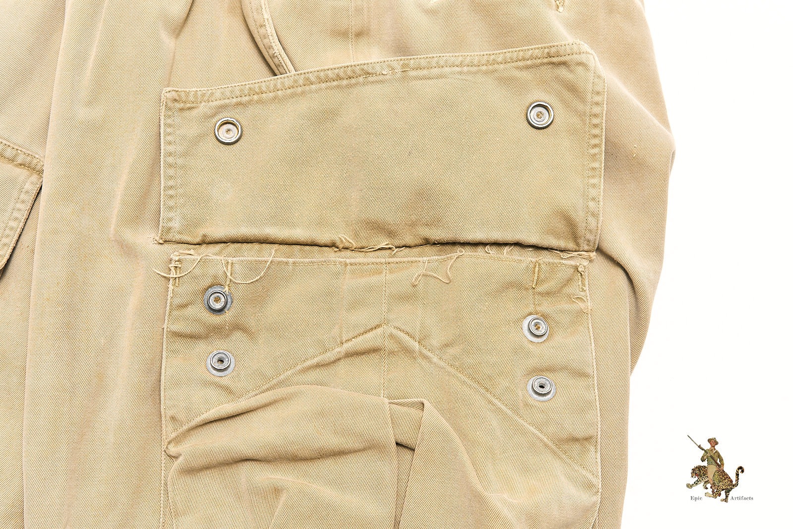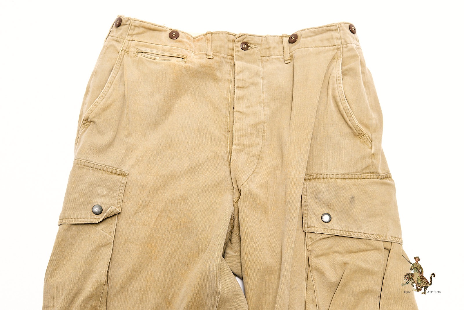 Product Description: A well-preserved and increasingly scarce example of the WWII U.S. Army M1942 Airborne Paratrooper Jump trousers, issued to members of the elite airborne divisions during early combat operations in Europe and the Mediterranean. Constructed of lightweight olive drab cotton, these trousers feature the classic high-waisted cut with cargo-style leg pockets and double-snap closures. This example measures 34″ at the waist, with a 29″ inseam and a 40″ overall length from waist to cuff.