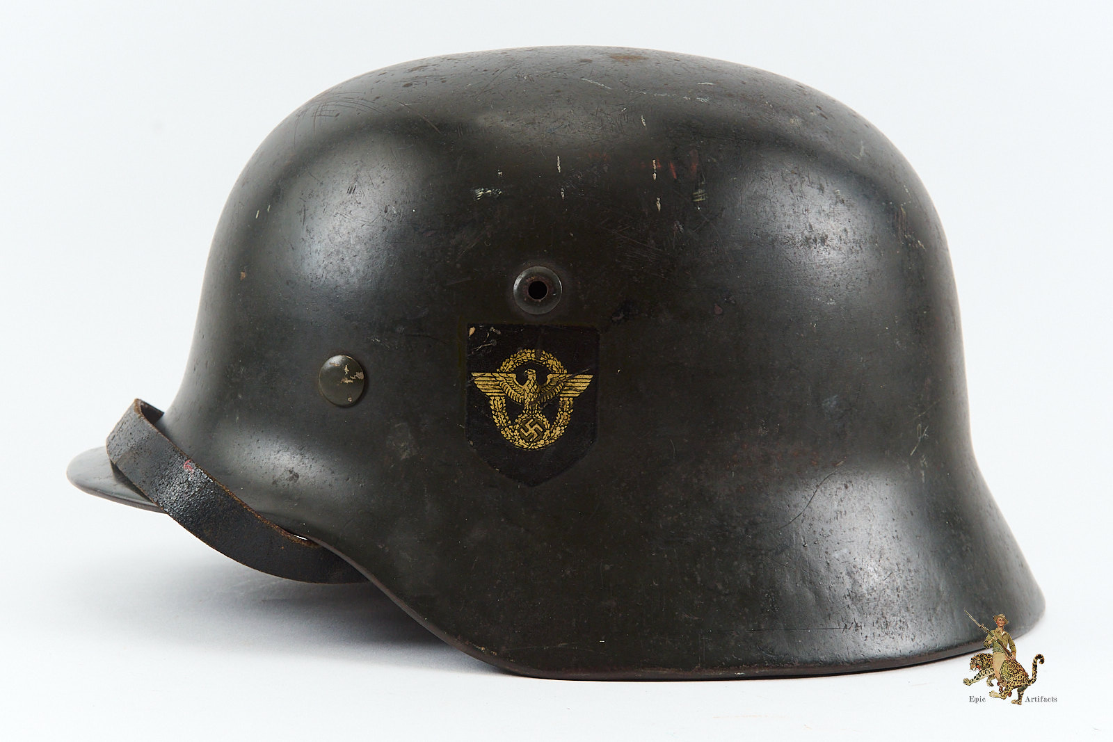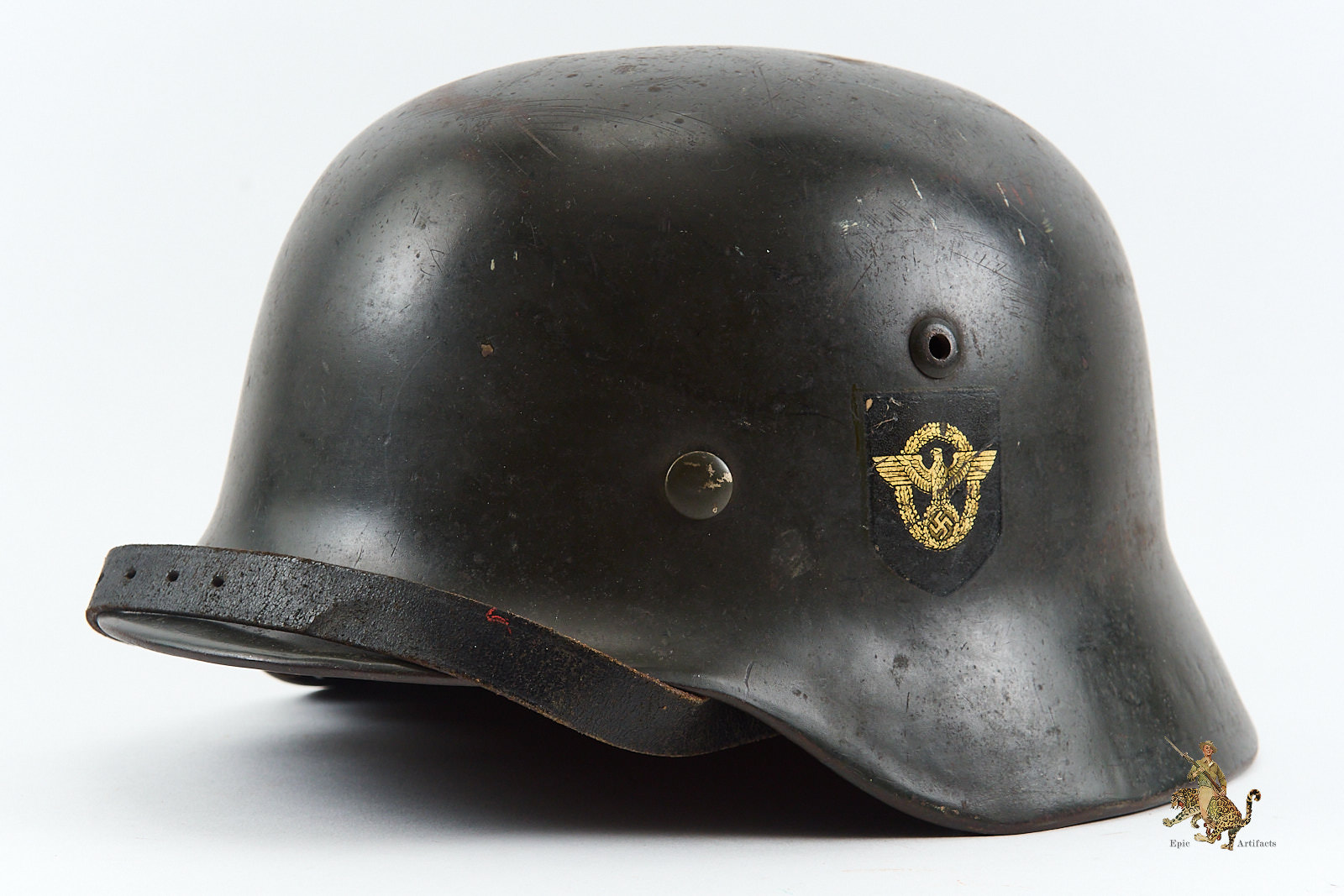 Product Description: This is an exceptional example of a German WWII M35 Double Decal Police Helmet—an untouched, factory-original piece that exemplifies top-tier condition and collector desirability. This helmet has not been reissued or restored in any way; it remains precisely as it left the Vereinigte Deutsche Nickelfabrik, in Schwerte factory in the 1930s, offering a rare opportunity to acquire a textbook prewar Police helmet in nearly pristine condition.