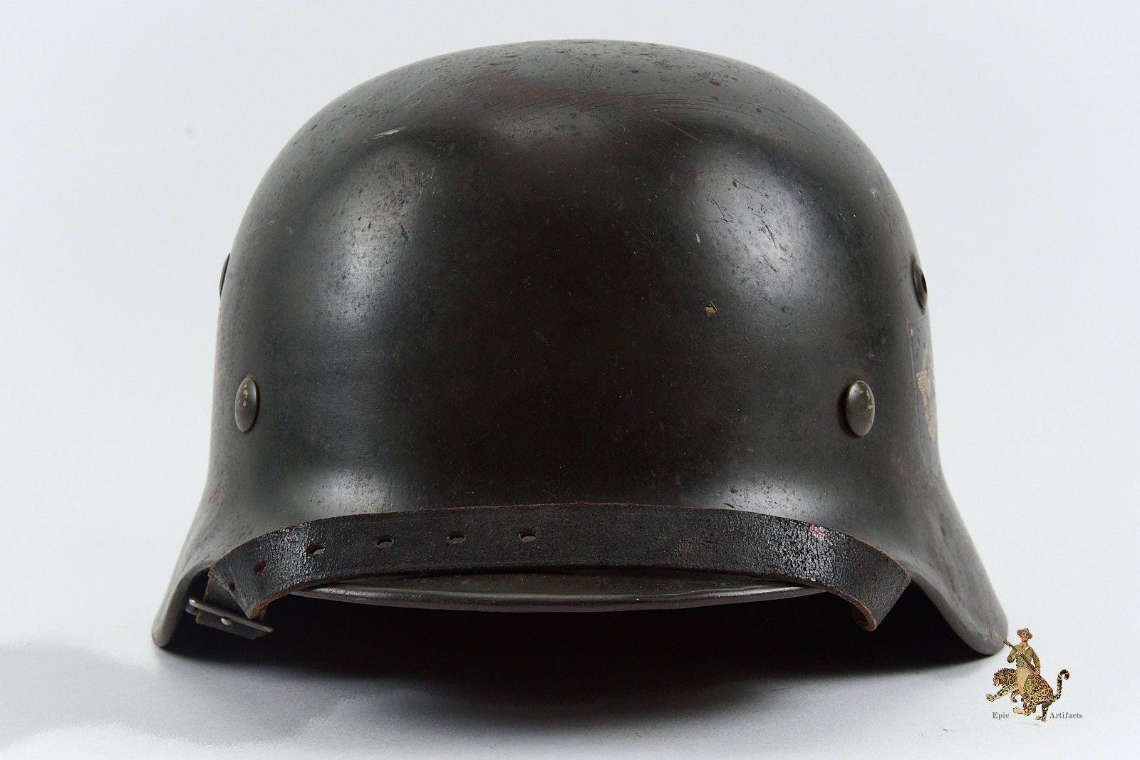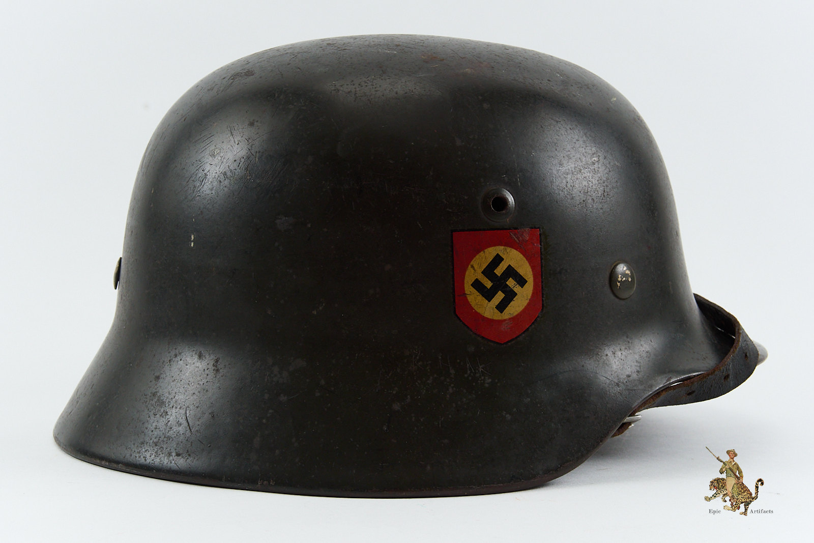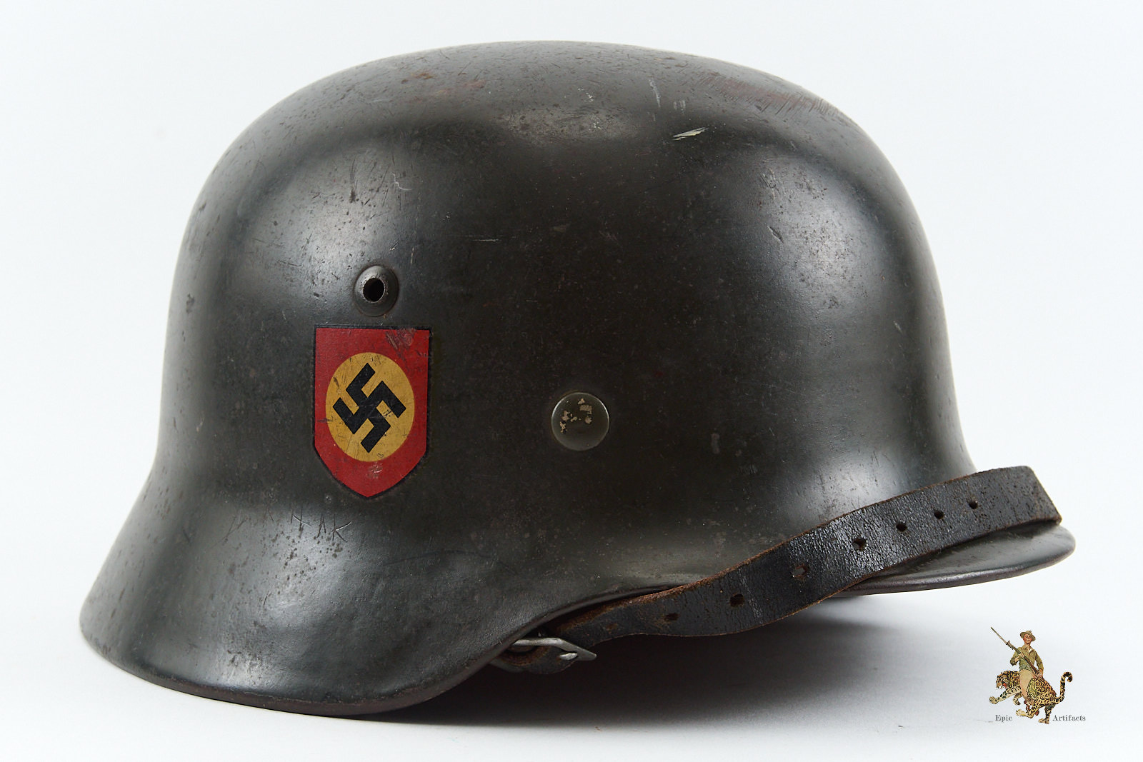 Historical Description: When the German Army first marched into war in 1914, it went to the front lines wearing the traditional “Picklehaube” helmets. The war soon developed to necessitate the need for an improved headgear to protect the wearer. The German Army developed the M16 helmet in 1915 and began issuing it in mass quantity to its fighting troops in 1916. The M16 underwent changes to bring about the next model, the M18. Both the M16 and M18 saw use by the German Army during WW1, as well as the interwar years by the Reichswehr and Freikorps. In 1931, a new liner system was developed. The M16 and M18 helmets were in mass supply right up to the time the Nazi Party took control of the German government. During Adolf Hitler’s rearming of the German military in the early 1930’s, the M16 and M18 helmets saw extensive refitting with the newer liner system, fresh paint, and the addition of a centralized decal system for the newly formed Wehrmacht’s respective branches. Decals were generally placed on each side of the helmet, one side being the branch and the other the national colors shield or party shield. In 1935, the M35 helmet was introduced. This new design was lighter and more streamlined than the older style helmets and is what the world now recognizes as the iconic helmet of the German Military. M35 helmets can most easily be identified from the separate rivet ventholes and rolled edges. With the outbreak of war, some changes were made to bring in a new model, the M40. The changes made to this new model was the use of a more matte field grey finish and the vent holes were now integral to the helmets shell. In 1940, the national colors decals and party shields were ordered to be removed. It should be noted that many M35 helmets were brought up to date by repainting them with the matte field grey finish and/or other modifications if necessary. These refitted helmets are what collectors now term “reissue helmets”. The next model helmet to evolve was the M42. The model M42 has the same features of the M40 with the exception of the edges of the helmet not being rolled and remain flared. This was to speed up production and lower cost as the war dragged on and the German economy began changing to a total war economy. In 1943 all decals were ordered to be removed from combat helmets.