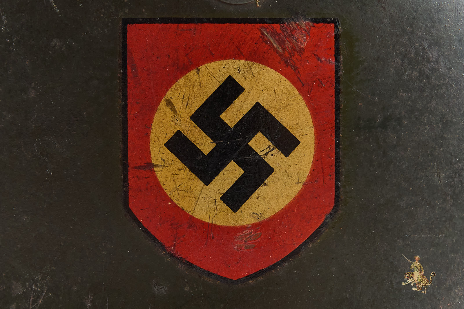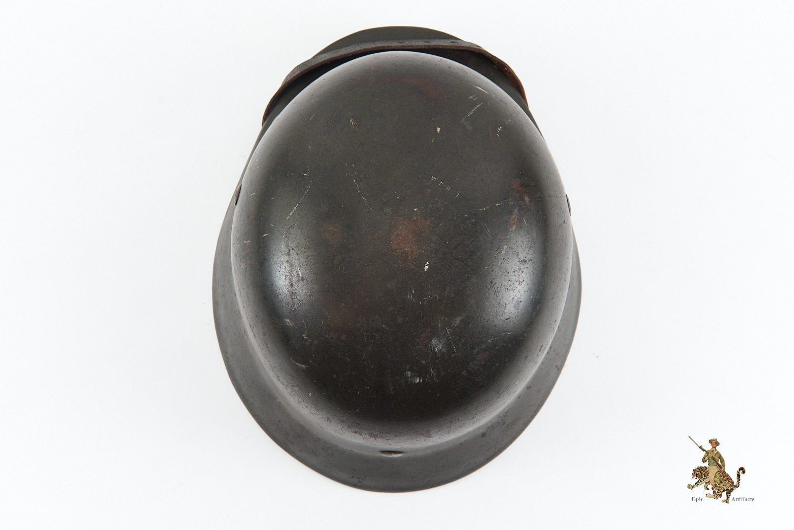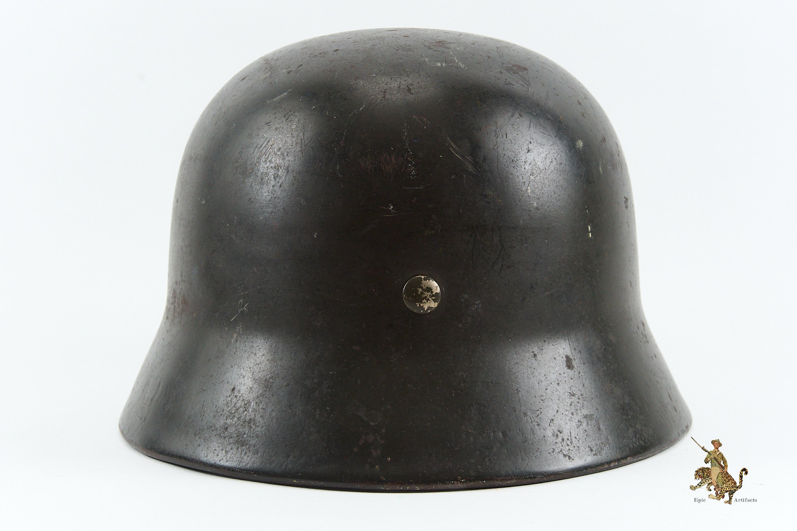 Historical Description: When the German Army first marched into war in 1914, it went to the front lines wearing the traditional “Picklehaube” helmets. The war soon developed to necessitate the need for an improved headgear to protect the wearer. The German Army developed the M16 helmet in 1915 and began issuing it in mass quantity to its fighting troops in 1916. The M16 underwent changes to bring about the next model, the M18. Both the M16 and M18 saw use by the German Army during WW1, as well as the interwar years by the Reichswehr and Freikorps. In 1931, a new liner system was developed. The M16 and M18 helmets were in mass supply right up to the time the Nazi Party took control of the German government. During Adolf Hitler’s rearming of the German military in the early 1930’s, the M16 and M18 helmets saw extensive refitting with the newer liner system, fresh paint, and the addition of a centralized decal system for the newly formed Wehrmacht’s respective branches. Decals were generally placed on each side of the helmet, one side being the branch and the other the national colors shield or party shield. In 1935, the M35 helmet was introduced. This new design was lighter and more streamlined than the older style helmets and is what the world now recognizes as the iconic helmet of the German Military. M35 helmets can most easily be identified from the separate rivet ventholes and rolled edges. With the outbreak of war, some changes were made to bring in a new model, the M40. The changes made to this new model was the use of a more matte field grey finish and the vent holes were now integral to the helmets shell. In 1940, the national colors decals and party shields were ordered to be removed. It should be noted that many M35 helmets were brought up to date by repainting them with the matte field grey finish and/or other modifications if necessary. These refitted helmets are what collectors now term “reissue helmets”. The next model helmet to evolve was the M42. The model M42 has the same features of the M40 with the exception of the edges of the helmet not being rolled and remain flared. This was to speed up production and lower cost as the war dragged on and the German economy began changing to a total war economy. In 1943 all decals were ordered to be removed from combat helmets.
