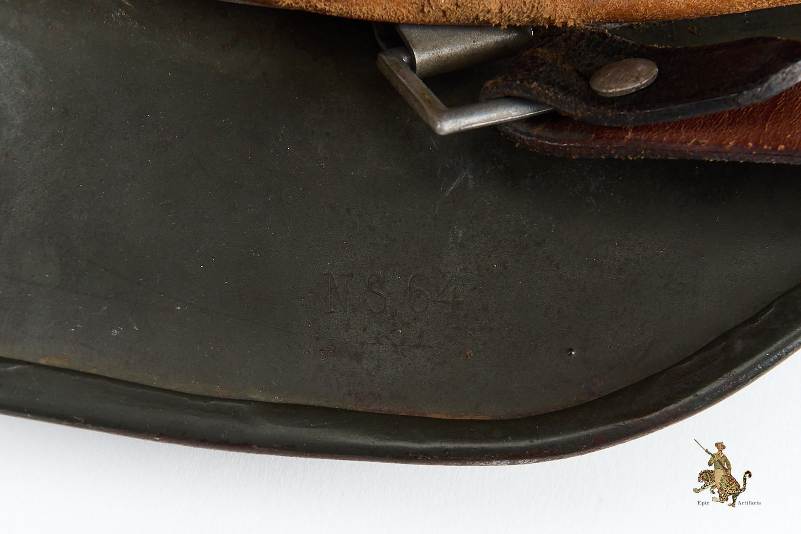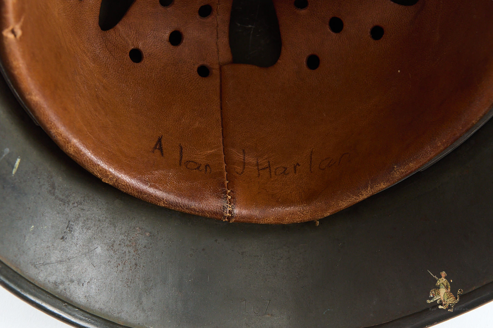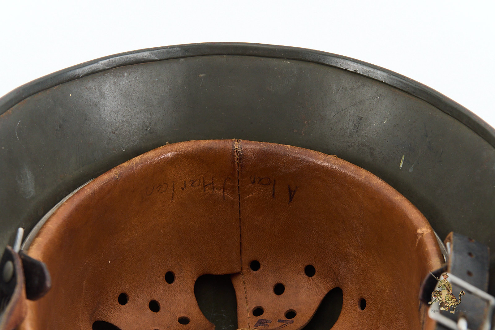 The interior is equally impressive. The helmet is fitted with its correct early reinforced aluminum liner band, which supports a beautiful, supple leather liner that shows only minimal wear and remains perfectly intact. The liner is size-stamped “57,” and has the name Alan J Harlan at the rear, possibly the veteran who brought the helmet back. The shell itself is marked “NS64” for Vereinigte Deutsche Nickelfabrik, in Schwerte, with the lot number “E167” stamped into the rear skirt.