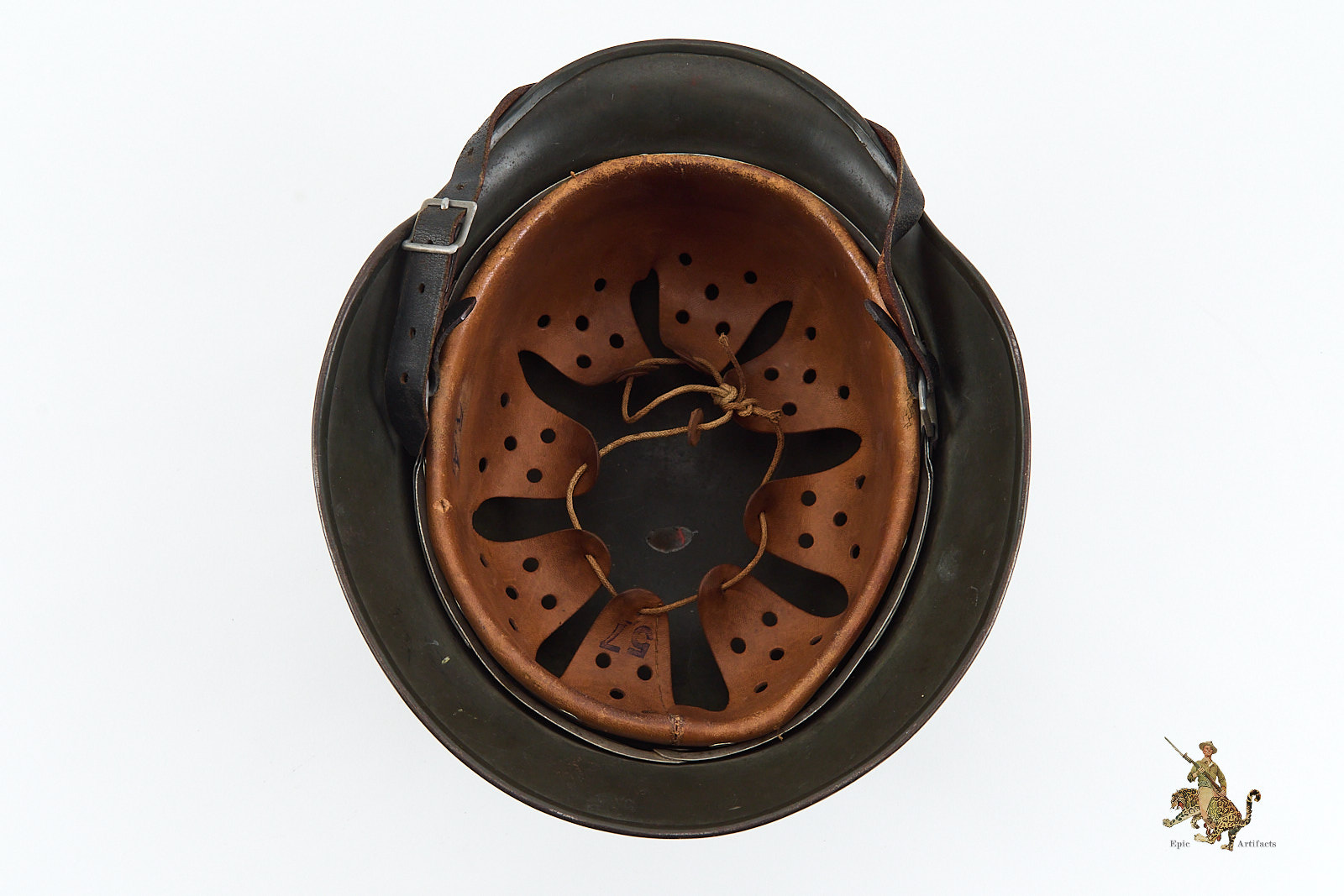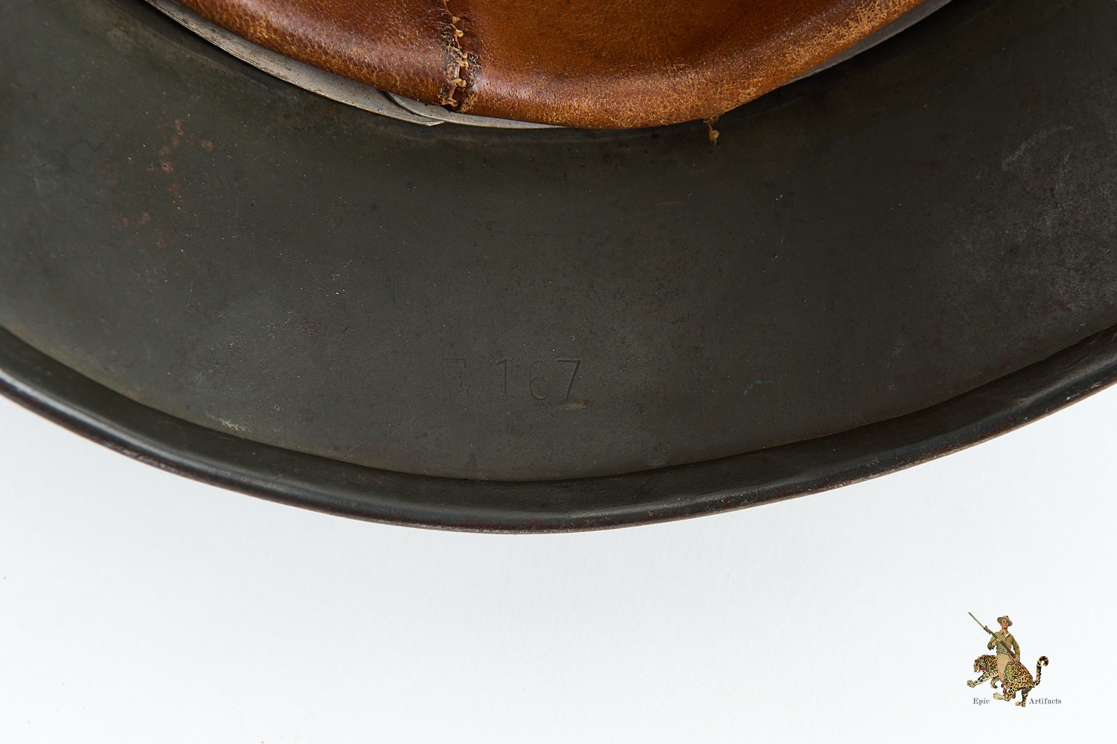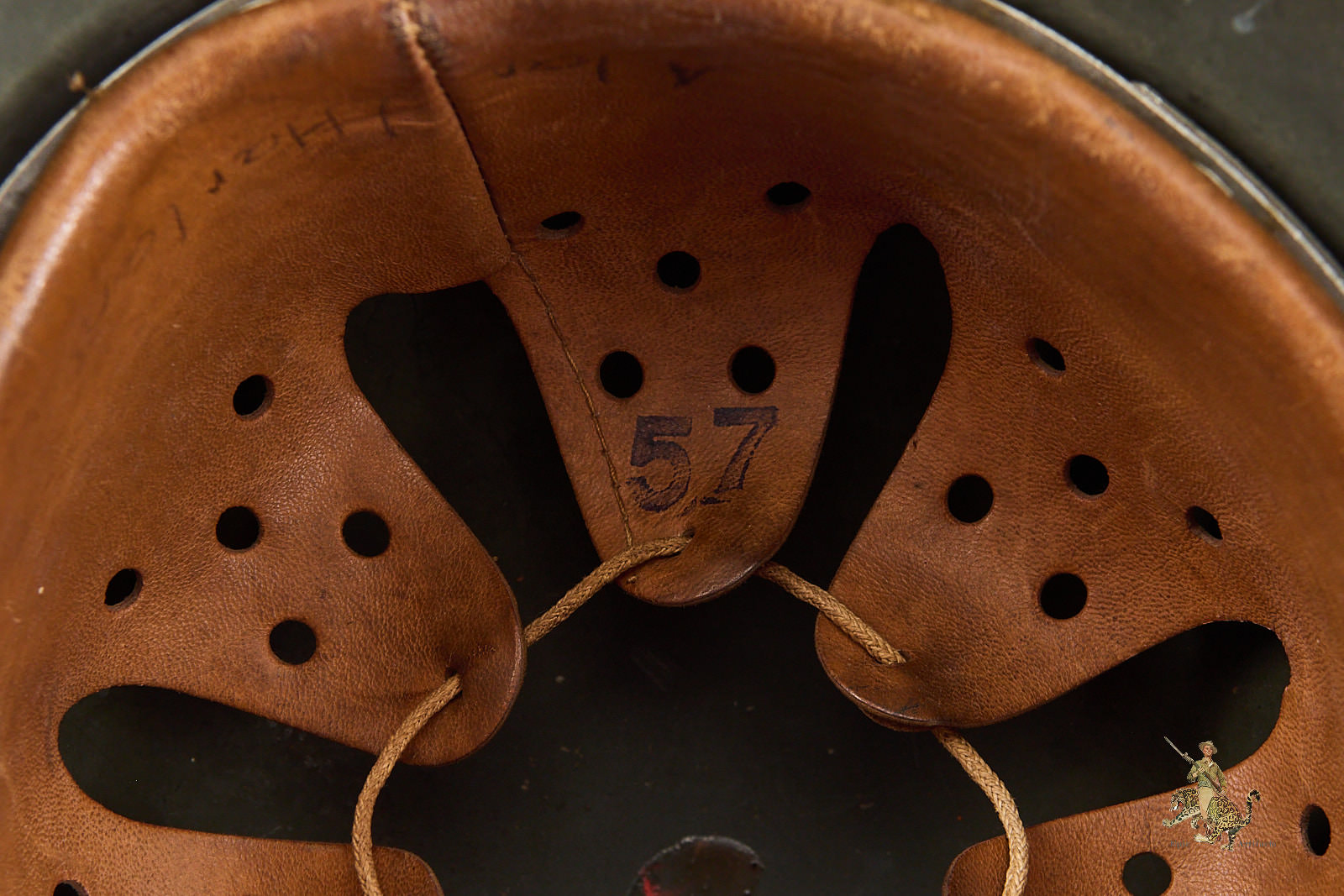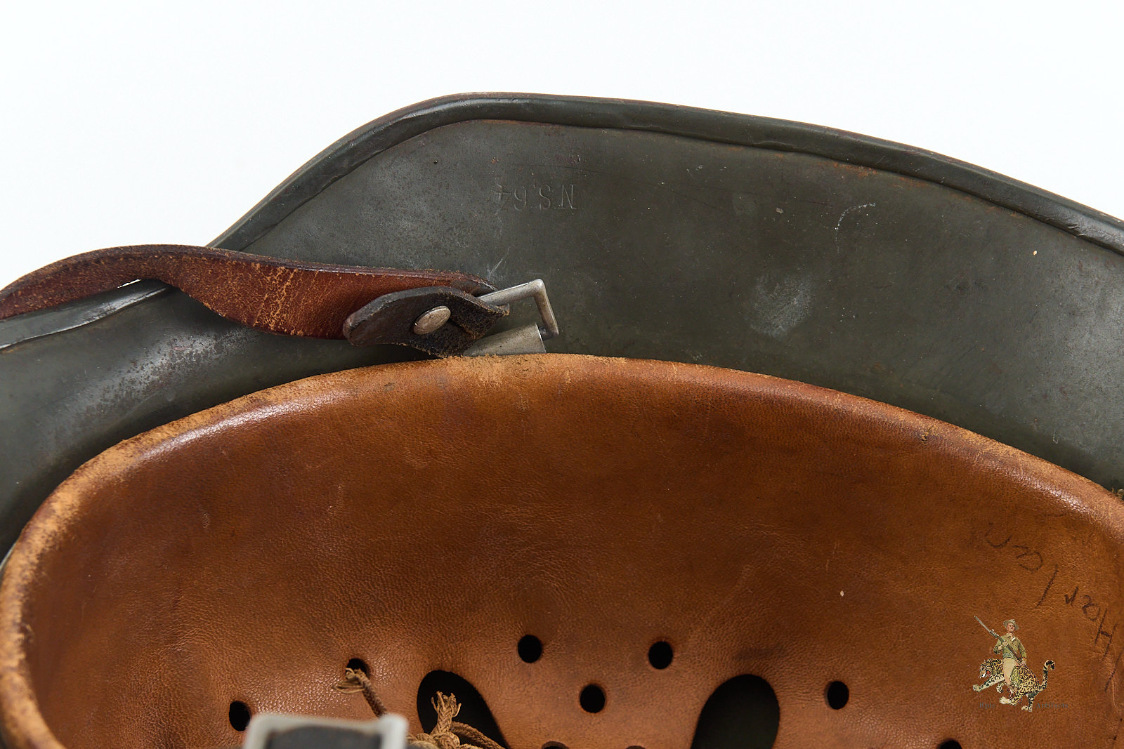 The interior is equally impressive. The helmet is fitted with its correct early reinforced aluminum liner band, which supports a beautiful, supple leather liner that shows only minimal wear and remains perfectly intact. The liner is size-stamped “57,” and has the name Alan J Harlan at the rear, possibly the veteran who brought the helmet back. The shell itself is marked “NS64” for Vereinigte Deutsche Nickelfabrik, in Schwerte, with the lot number “E167” stamped into the rear skirt.