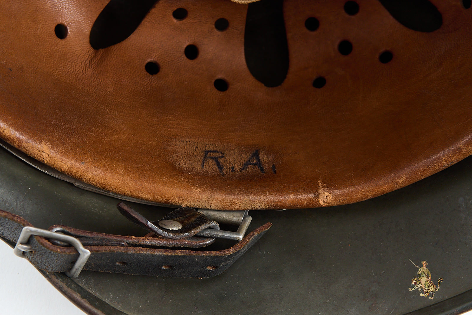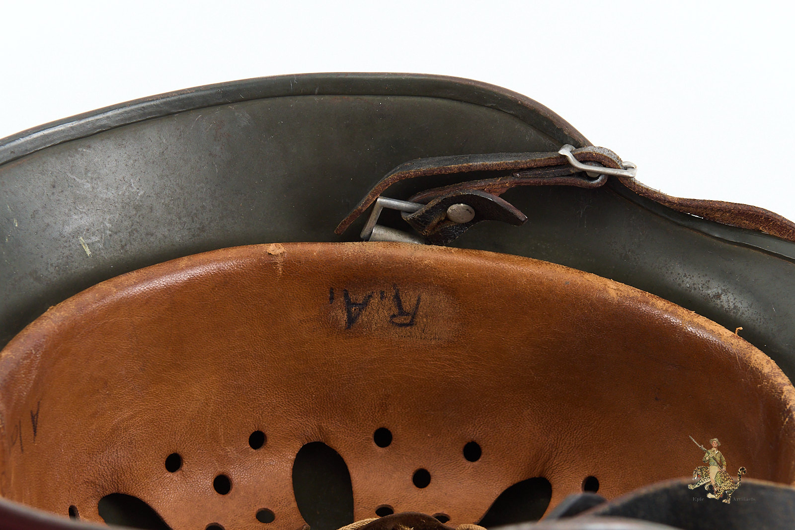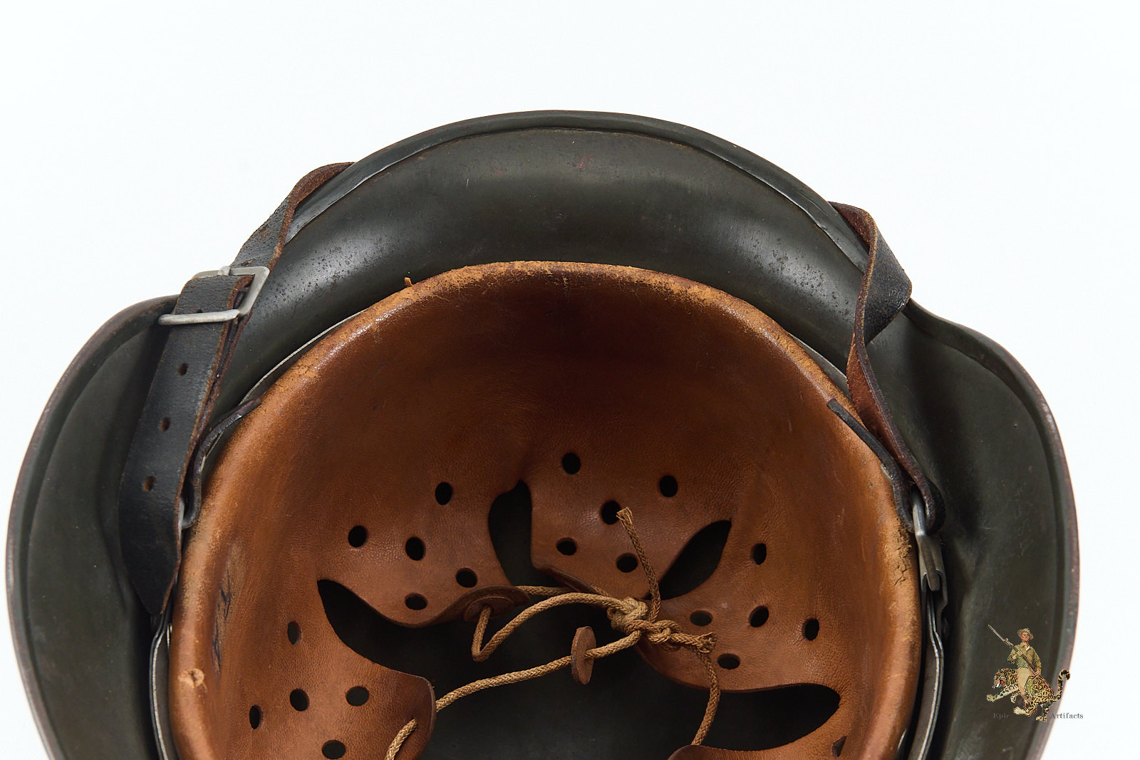 The chinstrap is full-length and remains attached to the original bales. It remains in excellent condition overall.