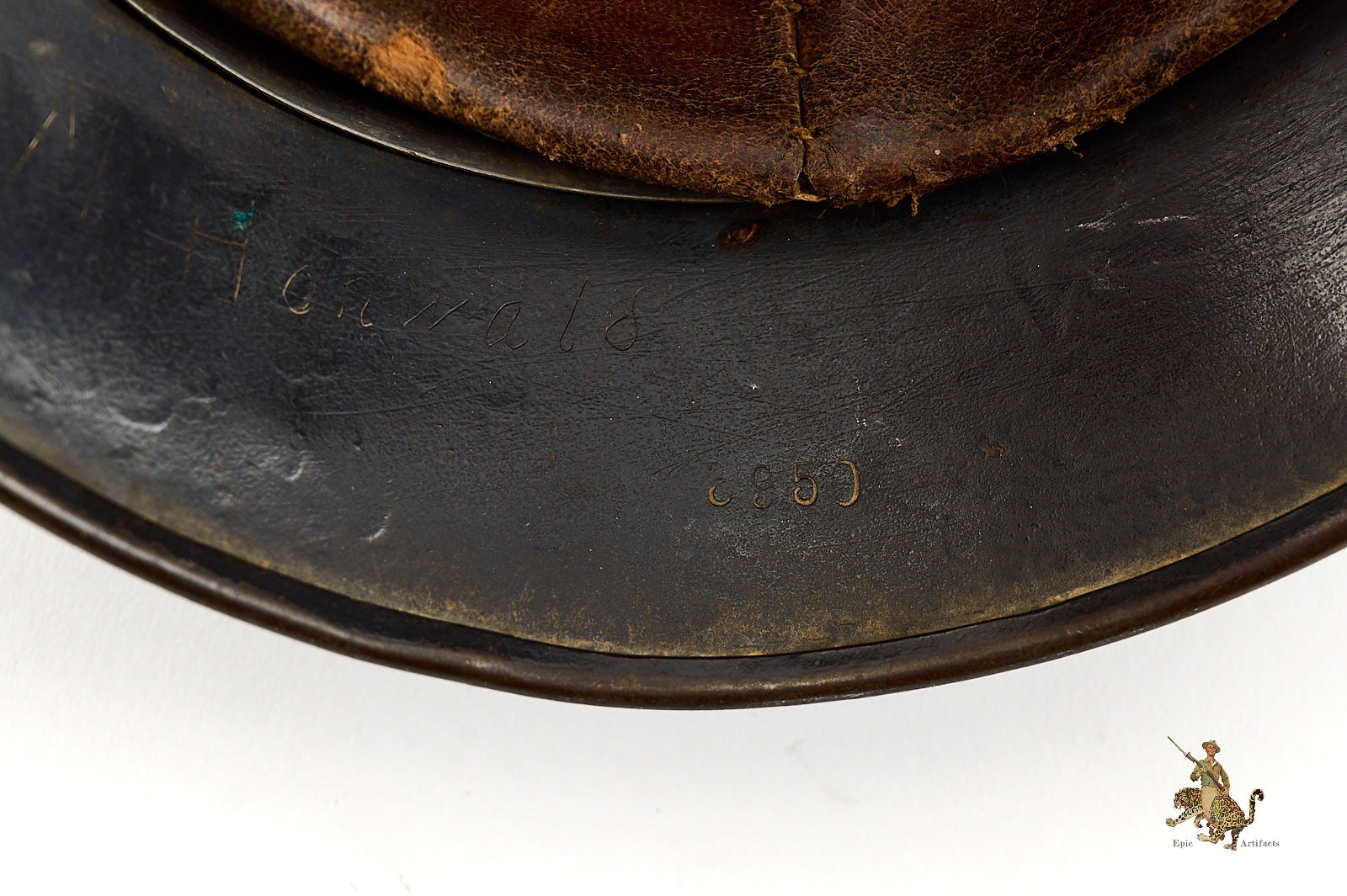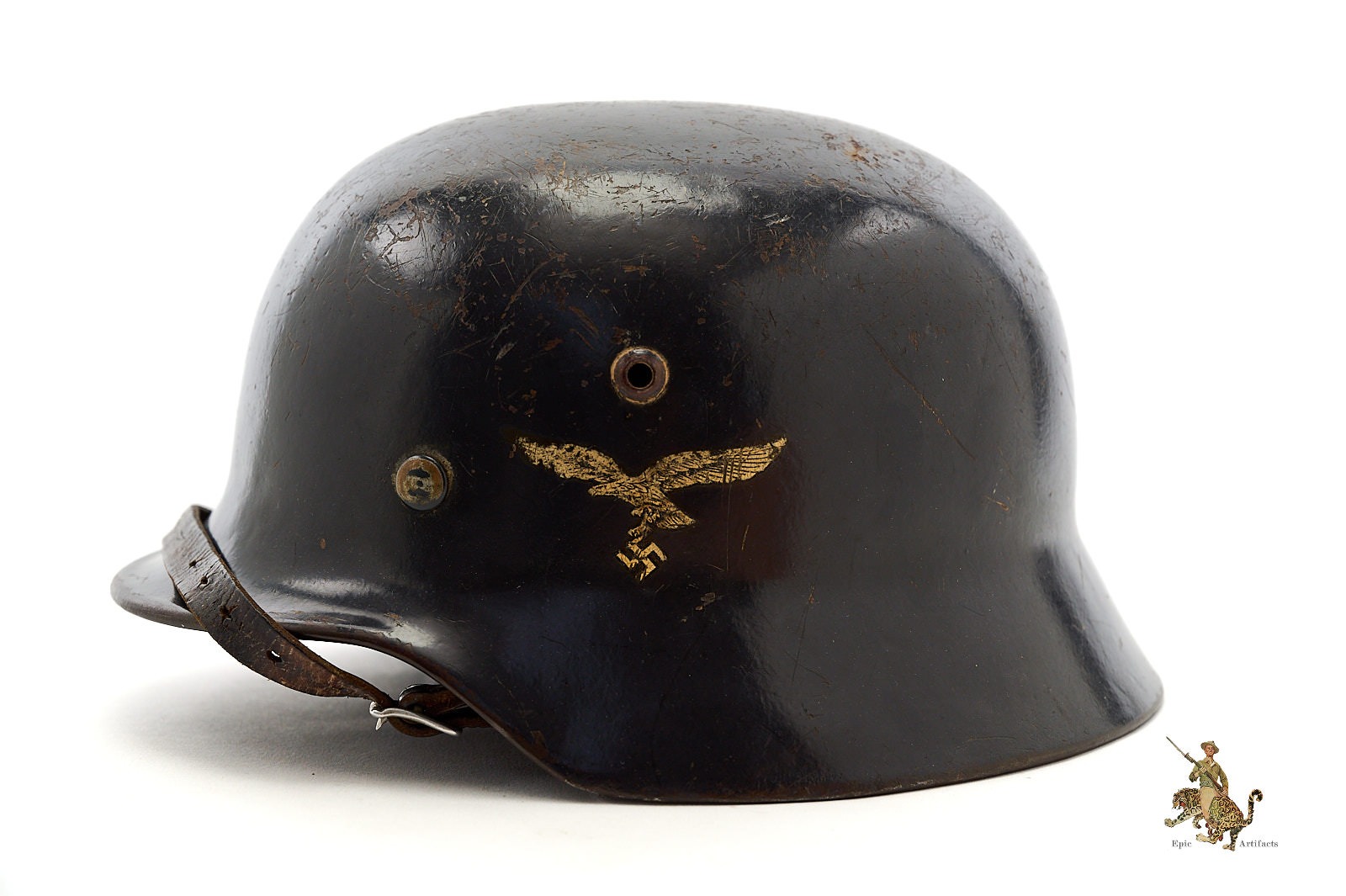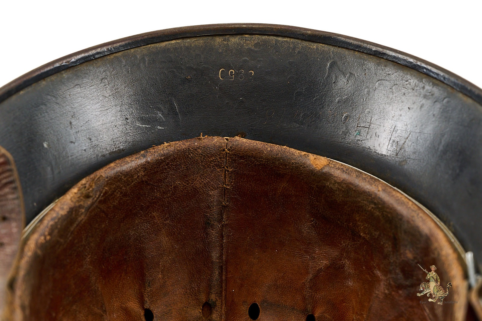 Product Description: This M35 Luftwaffe Double Decal Helmet – EF64 is a very attractive and appealing example of the classic prewar German Air Force helmet. The exterior retains most of the original factory applied smooth blue paint, with some wear throughout. There are scattered marks and an even patina, with a generally “combat worn” look. Both of the original decals are present, and are nicely preserved, with both the tricolor and the eagle rating about 65 percent intact. Inside, this M35 Luftwaffe Helmet Double Decal has a nice liner and complete chinstrap dated 1938. The liner band is a reinforced aluminum type which is correct for this era of production. The liner leather is complete, with some sweat discoloration and minor wear around the liner band. The drawstring is intact, and the split pins remain straight, with no indication this liner was ever removed. The steel skirt is size and maker stamped “EF64” and the lot number “3950” is stamped in the rear. The size 64 shell is nice, this was the most common wartime size. This helmet has great character and visual appeal, with a desirable, all-original, “been there” look. The condition rates as excellent.