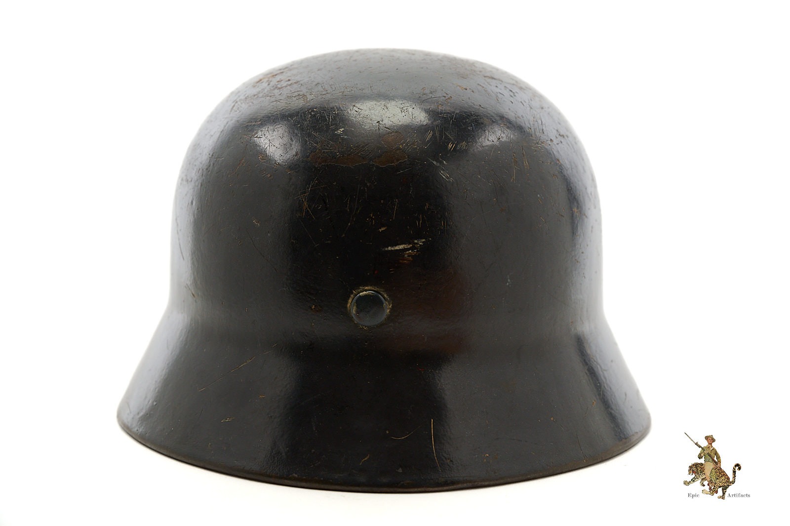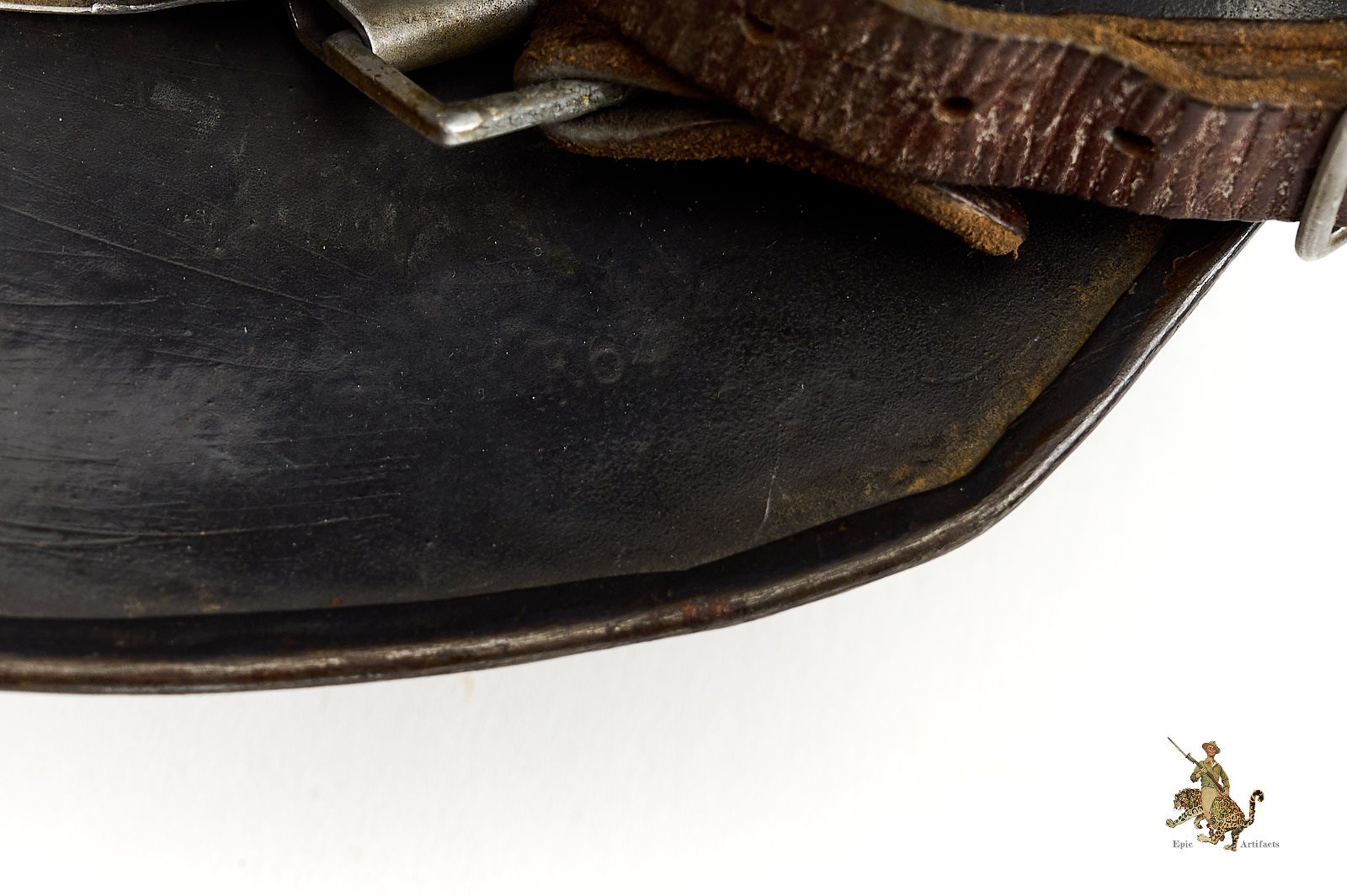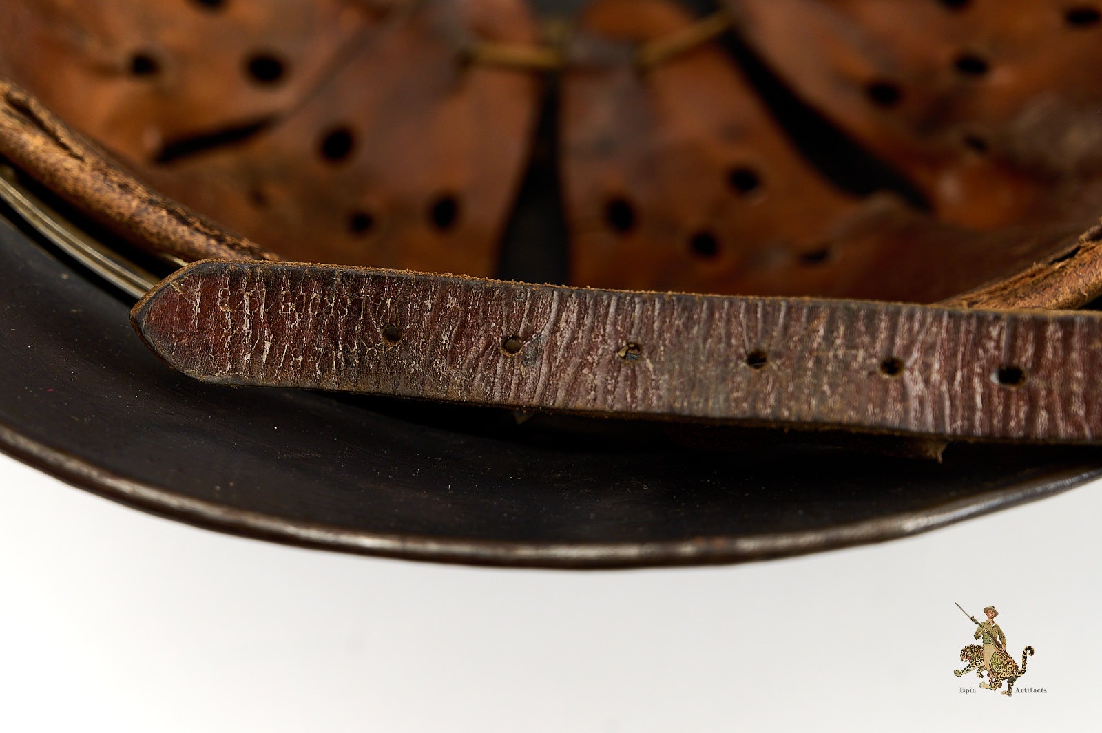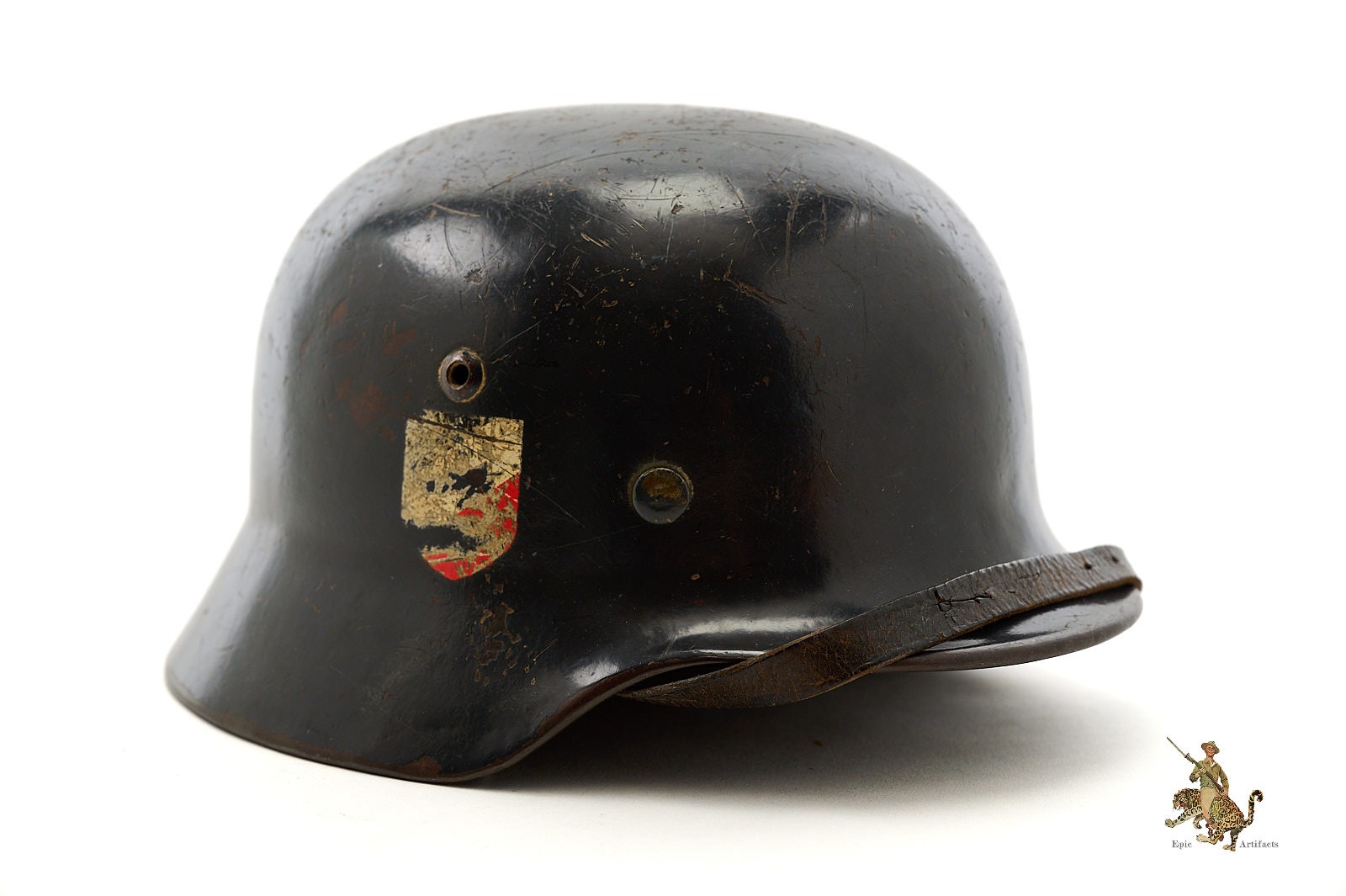 Historical Description: When the German Army first marched into war in 1914, it went to the front lines wearing the traditional “Picklehaube” helmets. The war soon developed to necessitate the need for an improved headgear to protect the wearer. The German Army developed the M16 helmet in 1915 and began issuing it in mass quantity to its fighting troops in 1916. The M16 underwent changes to bring about the next model, the M18. Both the M16 and M18 saw use by the German Army during WW1, as well as the interwar years by the Reichswehr and Freikorps. In 1931, a new liner system was developed. The M16 and M18 helmets were in mass supply right up to the time the Nazi Party took control of the German government. During Adolf Hitler’s rearming of the German military in the early 1930’s, the M16 and M18 helmets saw extensive refitting with the newer liner system, fresh paint, and the addition of a centralized decal system for the newly formed Wehrmacht’s respective branches. Decals were generally placed on each side of the helmet, one side being the branch and the other the national colors shield or party shield. In 1935, the M35 helmet was introduced. This new design was lighter and more streamlined than the older style helmets and is what the world now recognizes as the iconic helmet of the German Military. M35 helmets can most easily be identified from the separate rivet ventholes and rolled edges. With the outbreak of war, some changes were made to bring in a new model, the M40. The changes made to this new model was the use of a more matte field grey finish and the vent holes were now integral to the helmets shell. In 1940, the national colors decals and party shields were ordered to be removed. It should be noted that many M35 helmets were brought up to date by repainting them with the matte field grey finish and/or other modifications if necessary. These refitted helmets are what collectors now term “reissue helmets”. The next model helmet to evolve was the M42. The model M42 has the same features of the M40 with the exception of the edges of the helmet not being rolled and remain flared. This was to speed up production and lower cost as the war dragged on and the German economy began changing to a total war economy. In 1943 all decals were ordered to be removed from combat helmets.