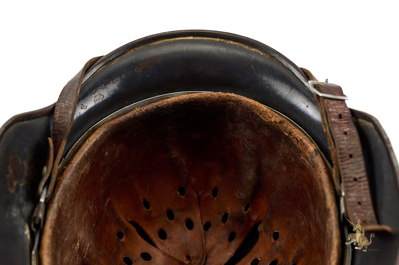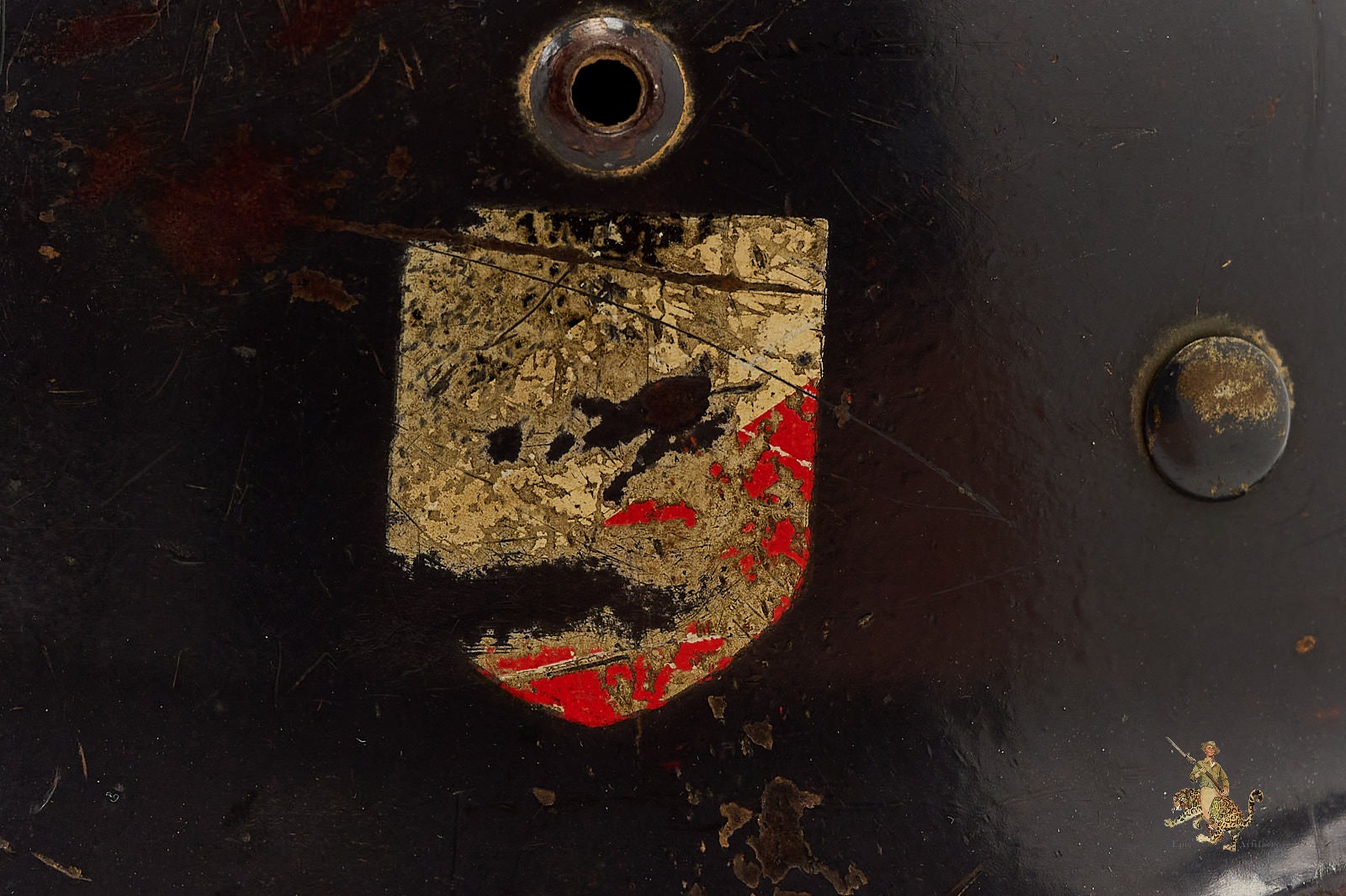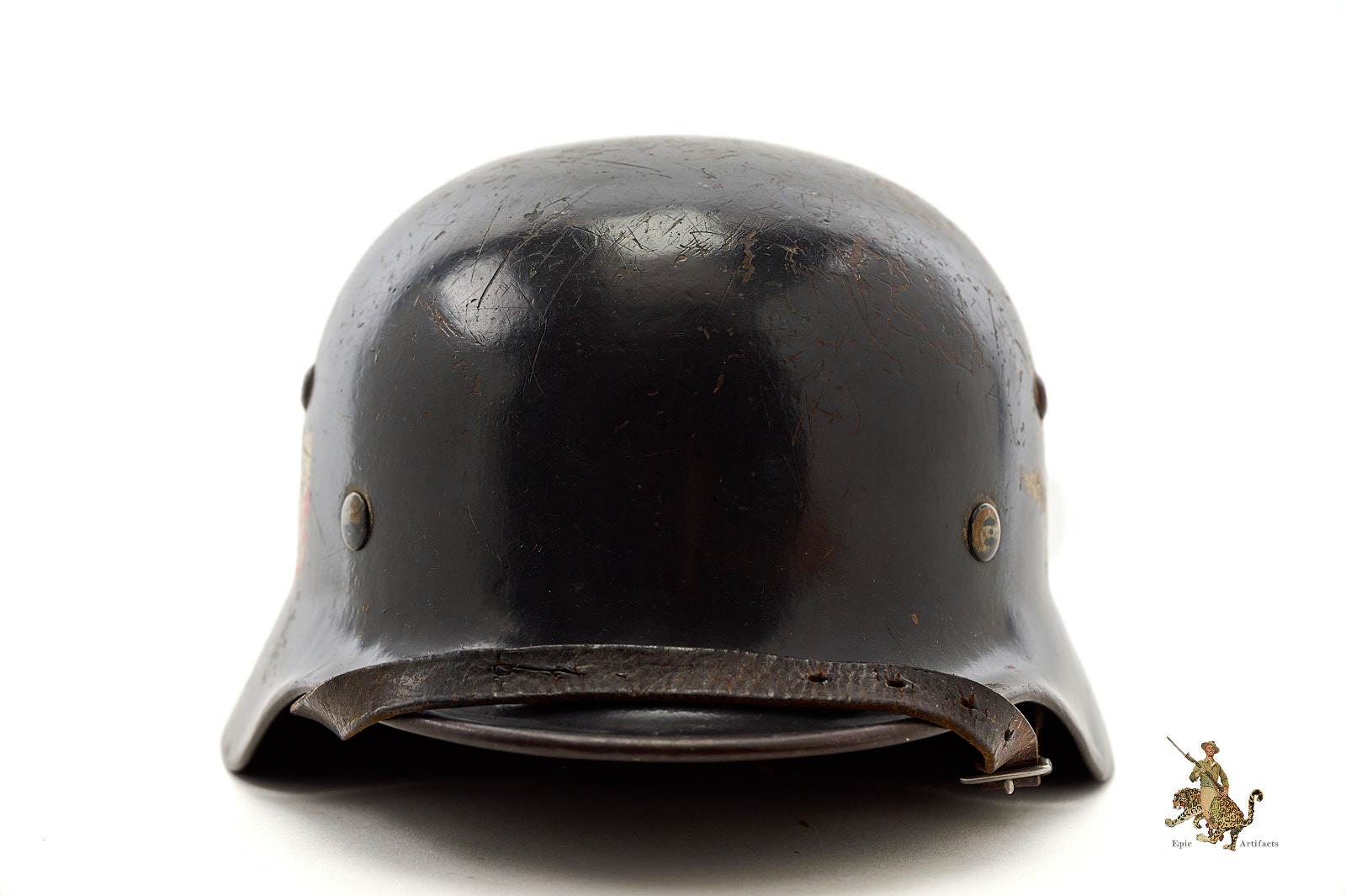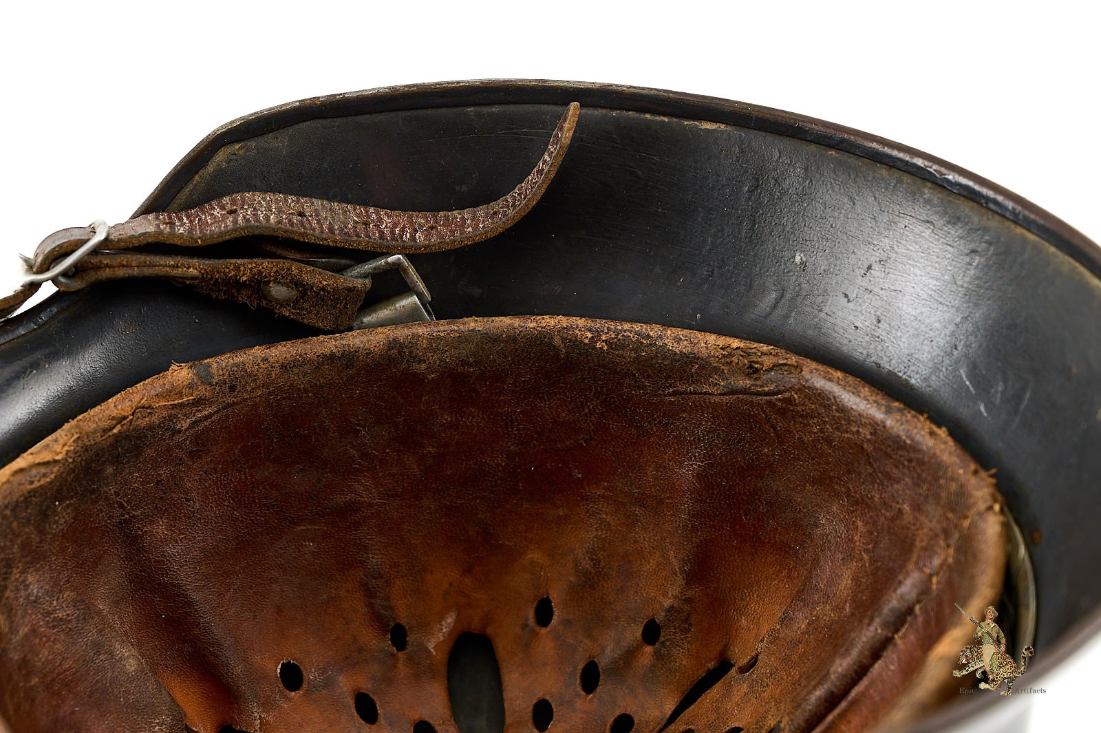 Historical Description: When the German Army first marched into war in 1914, it went to the front lines wearing the traditional “Picklehaube” helmets. The war soon developed to necessitate the need for an improved headgear to protect the wearer. The German Army developed the M16 helmet in 1915 and began issuing it in mass quantity to its fighting troops in 1916. The M16 underwent changes to bring about the next model, the M18. Both the M16 and M18 saw use by the German Army during WW1, as well as the interwar years by the Reichswehr and Freikorps. In 1931, a new liner system was developed. The M16 and M18 helmets were in mass supply right up to the time the Nazi Party took control of the German government. During Adolf Hitler’s rearming of the German military in the early 1930’s, the M16 and M18 helmets saw extensive refitting with the newer liner system, fresh paint, and the addition of a centralized decal system for the newly formed Wehrmacht’s respective branches. Decals were generally placed on each side of the helmet, one side being the branch and the other the national colors shield or party shield. In 1935, the M35 helmet was introduced. This new design was lighter and more streamlined than the older style helmets and is what the world now recognizes as the iconic helmet of the German Military. M35 helmets can most easily be identified from the separate rivet ventholes and rolled edges. With the outbreak of war, some changes were made to bring in a new model, the M40. The changes made to this new model was the use of a more matte field grey finish and the vent holes were now integral to the helmets shell. In 1940, the national colors decals and party shields were ordered to be removed. It should be noted that many M35 helmets were brought up to date by repainting them with the matte field grey finish and/or other modifications if necessary. These refitted helmets are what collectors now term “reissue helmets”. The next model helmet to evolve was the M42. The model M42 has the same features of the M40 with the exception of the edges of the helmet not being rolled and remain flared. This was to speed up production and lower cost as the war dragged on and the German economy began changing to a total war economy. In 1943 all decals were ordered to be removed from combat helmets.