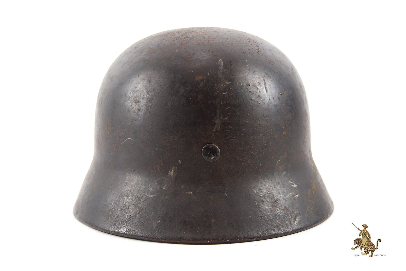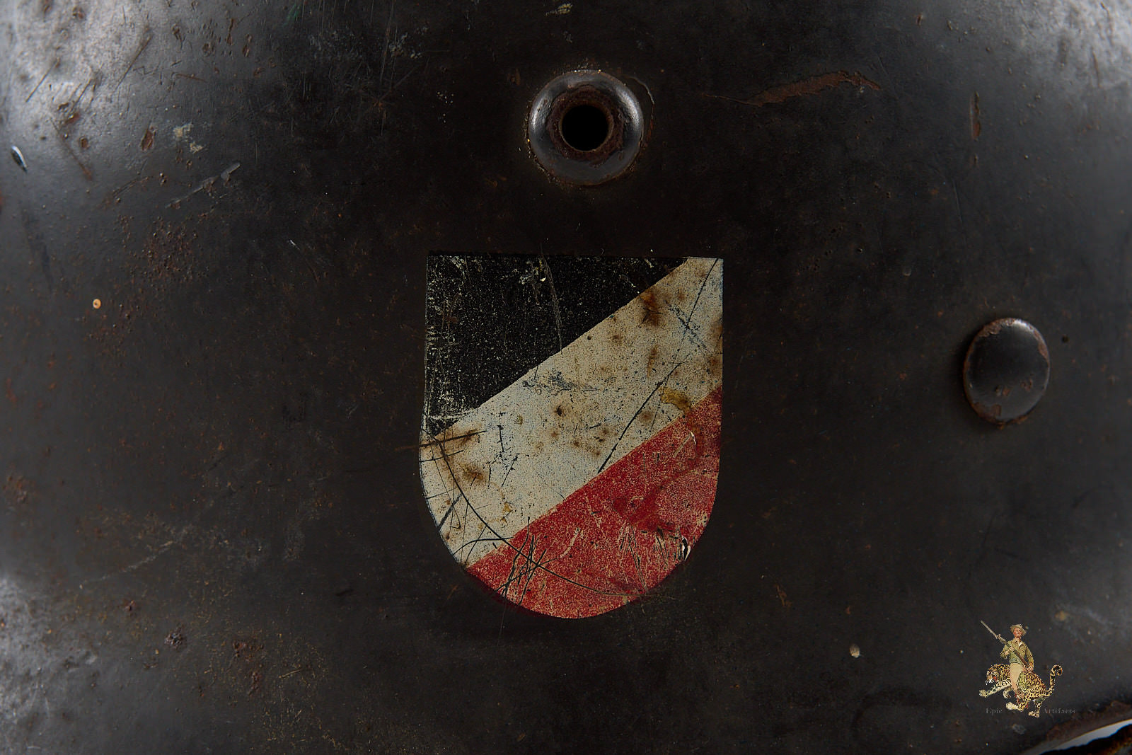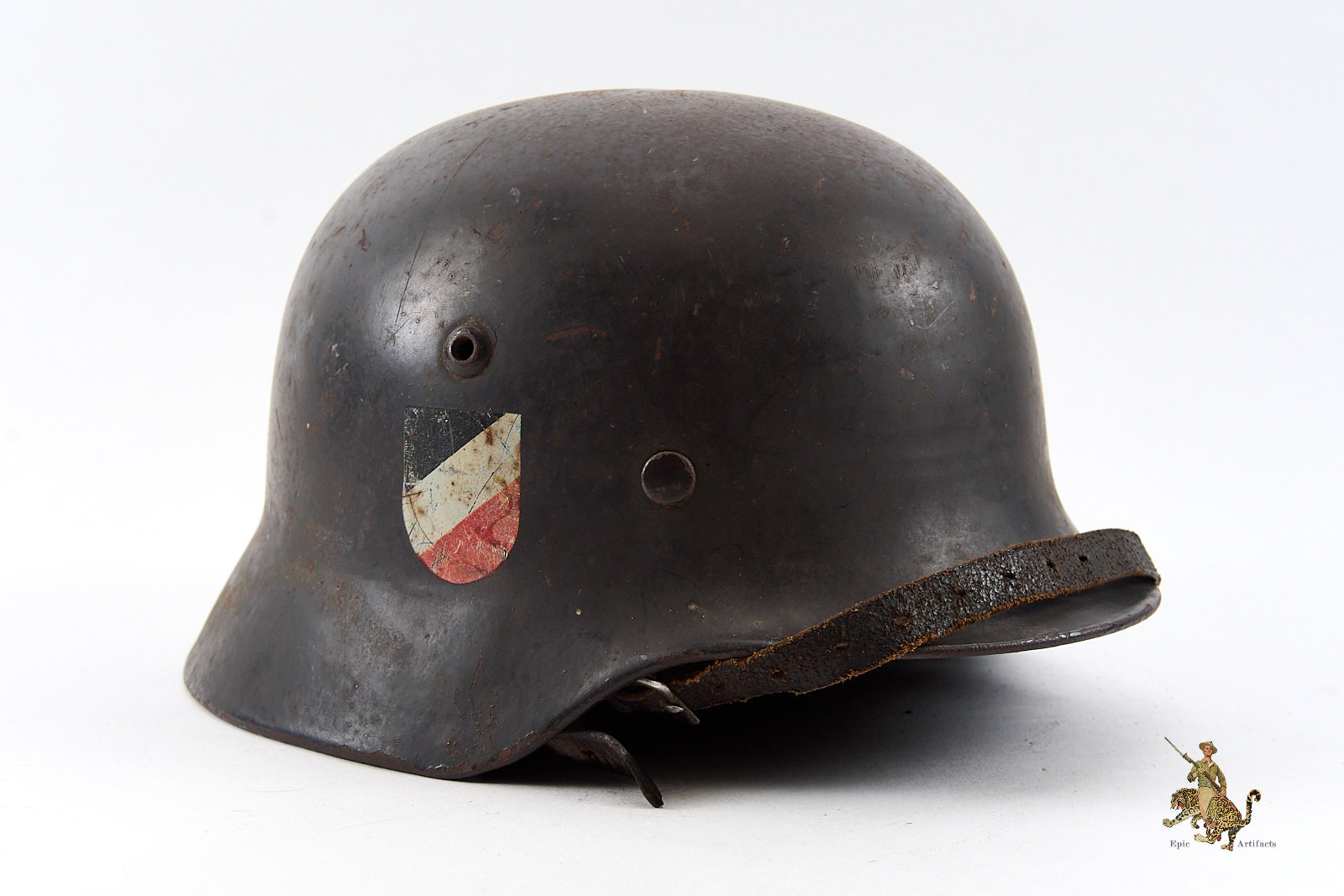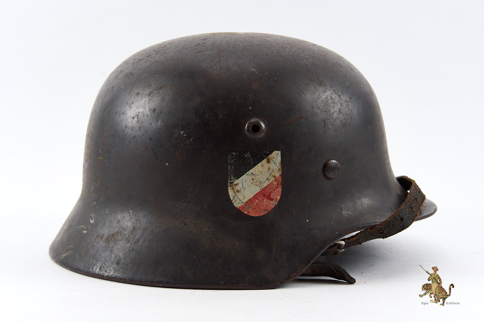 Historical Description: When the German Army first marched into war in 1914, it went to the front lines wearing the traditional “Picklehaube” helmets. The war soon developed to necessitate the need for an improved headgear to protect the wearer. The German Army developed the M16 helmet in 1915 and began issuing it in mass quantity to its fighting troops in 1916. The M16 underwent changes to bring about the next model, the M18. Both the M16 and M18 saw use by the German Army during WW1, as well as the interwar years by the Reichswehr and Freikorps. In 1931, a new liner system was developed. The M16 and M18 helmets were in mass supply right up to the time the Nazi Party took control of the German government. During Adolf Hitler’s rearming of the German military in the early 1930’s, the M16 and M18 helmets saw extensive refitting with the newer liner system, fresh paint, and the addition of a centralized decal system for the newly formed Wehrmacht’s respective branches. Decals were generally placed on each side of the helmet, one side being the branch and the other the national colors shield or party shield. In 1935, the M35 helmet was introduced. This new design was lighter and more streamlined than the older style helmets and is what the world now recognizes as the iconic helmet of the German Military. M35 helmets can most easily be identified from the separate rivet ventholes and rolled edges. With the outbreak of war, some changes were made to bring in a new model, the M40. The changes made to this new model was the use of a more matte field grey finish and the vent holes were now integral to the helmets shell. In 1940, the national colors decals and party shields were ordered to be removed. It should be noted that many M35 helmets were brought up to date by repainting them with the matte field grey finish and/or other modifications if necessary. These refitted helmets are what collectors now term “reissue helmets”. The next model helmet to evolve was the M42. The model M42 has the same features of the M40 with the exception of the edges of the helmet not being rolled and remain flared. This was to speed up production and lower cost as the war dragged on and the German economy began changing to a total war economy. In 1943 all decals were ordered to be removed from combat helmets.