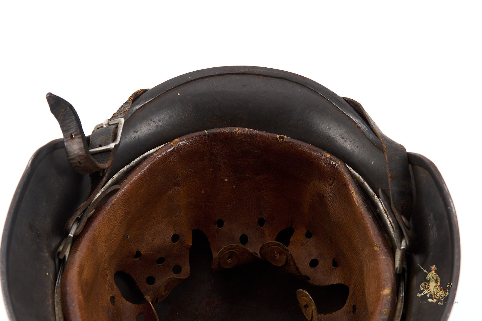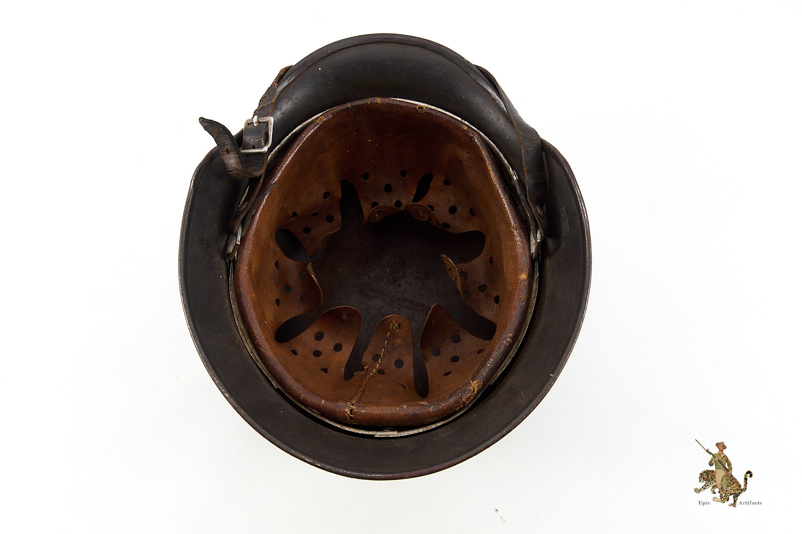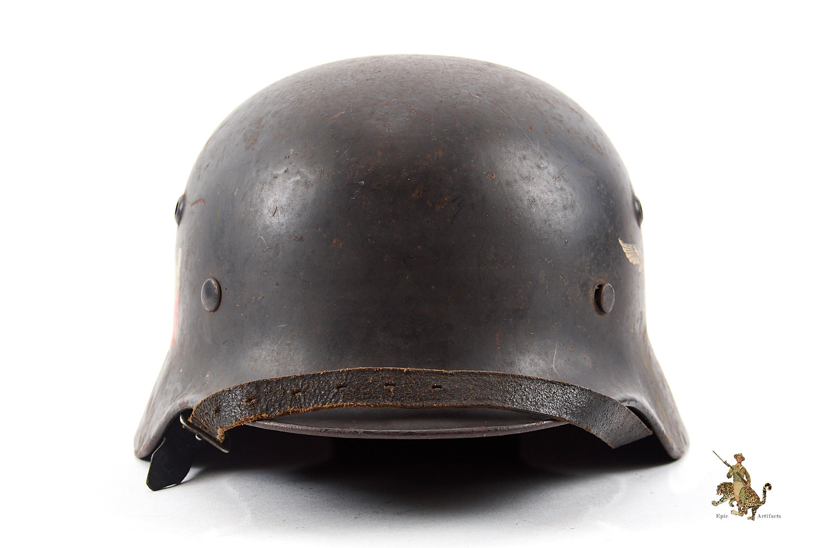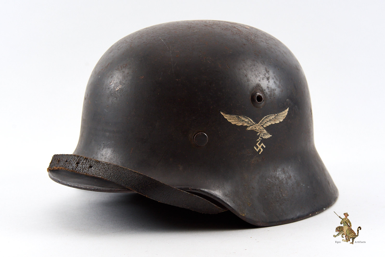 Historical Description: When the German Army first marched into war in 1914, it went to the front lines wearing the traditional “Picklehaube” helmets. The war soon developed to necessitate the need for an improved headgear to protect the wearer. The German Army developed the M16 helmet in 1915 and began issuing it in mass quantity to its fighting troops in 1916. The M16 underwent changes to bring about the next model, the M18. Both the M16 and M18 saw use by the German Army during WW1, as well as the interwar years by the Reichswehr and Freikorps. In 1931, a new liner system was developed. The M16 and M18 helmets were in mass supply right up to the time the Nazi Party took control of the German government. During Adolf Hitler’s rearming of the German military in the early 1930’s, the M16 and M18 helmets saw extensive refitting with the newer liner system, fresh paint, and the addition of a centralized decal system for the newly formed Wehrmacht’s respective branches. Decals were generally placed on each side of the helmet, one side being the branch and the other the national colors shield or party shield. In 1935, the M35 helmet was introduced. This new design was lighter and more streamlined than the older style helmets and is what the world now recognizes as the iconic helmet of the German Military. M35 helmets can most easily be identified from the separate rivet ventholes and rolled edges. With the outbreak of war, some changes were made to bring in a new model, the M40. The changes made to this new model was the use of a more matte field grey finish and the vent holes were now integral to the helmets shell. In 1940, the national colors decals and party shields were ordered to be removed. It should be noted that many M35 helmets were brought up to date by repainting them with the matte field grey finish and/or other modifications if necessary. These refitted helmets are what collectors now term “reissue helmets”. The next model helmet to evolve was the M42. The model M42 has the same features of the M40 with the exception of the edges of the helmet not being rolled and remain flared. This was to speed up production and lower cost as the war dragged on and the German economy began changing to a total war economy. In 1943 all decals were ordered to be removed from combat helmets.