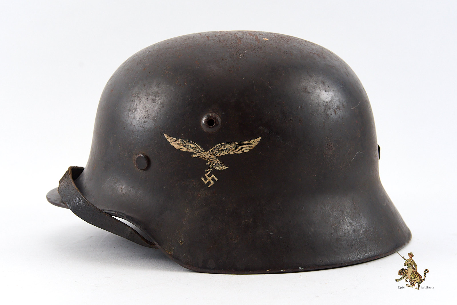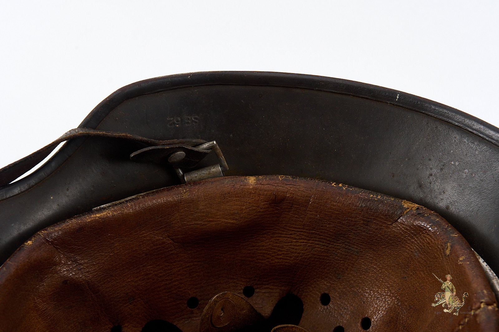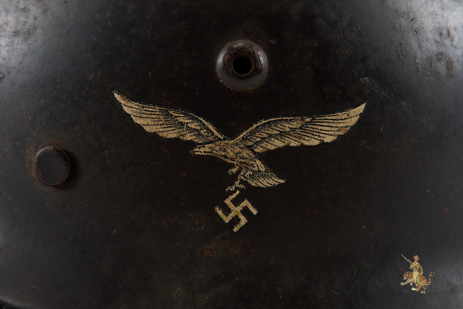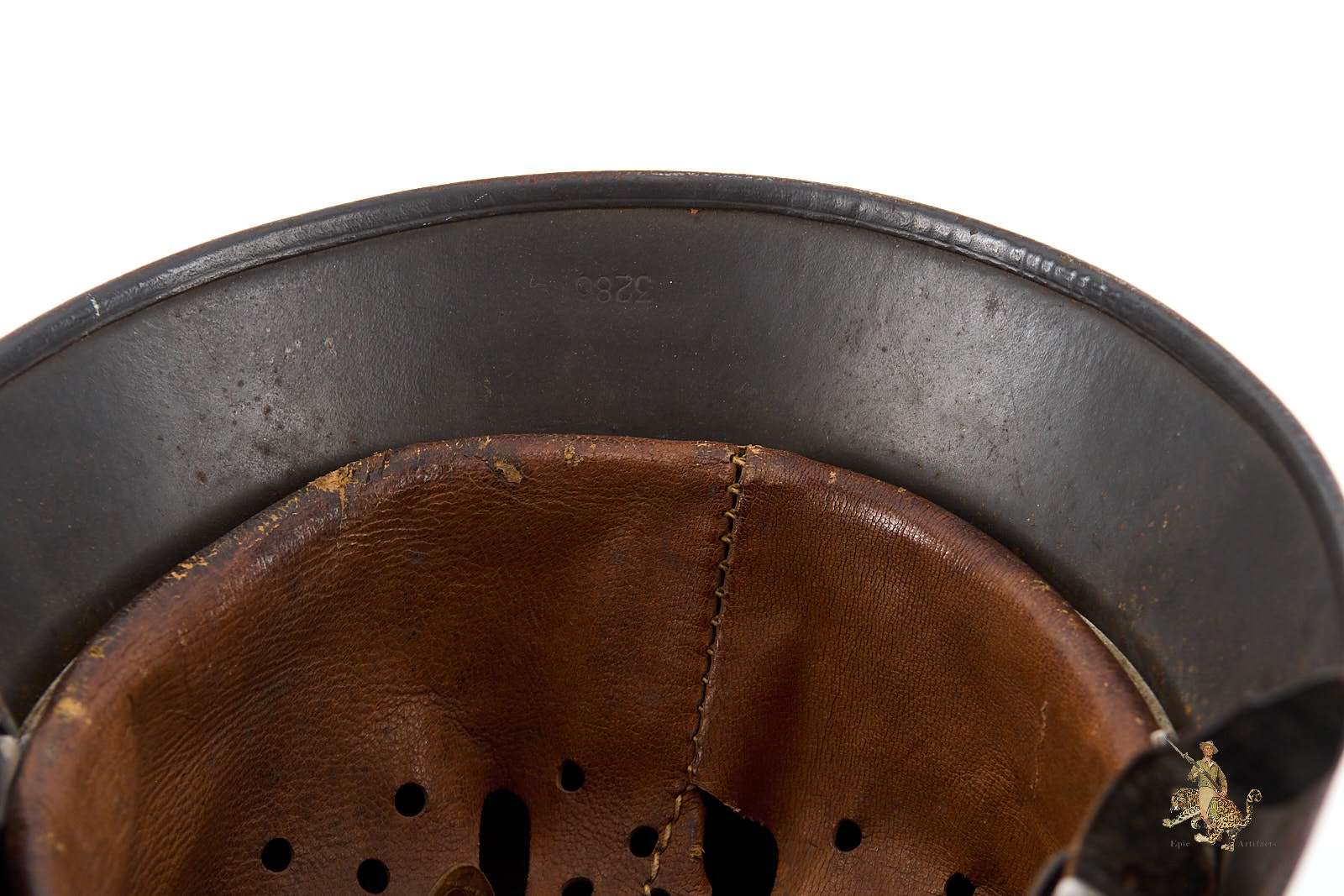 Product Description: This M35 Luftwaffe Double Decal Helmet, size SE62, is a very attractive and honest example of the classic prewar German Air Force helmet, displaying strong originality and desirable character throughout. The exterior retains the majority of its original factory-applied smooth Luftwaffe blue paint, showing scattered service wear and an even, natural patina that gives the helmet a convincing and appealing “combat-worn” appearance.
