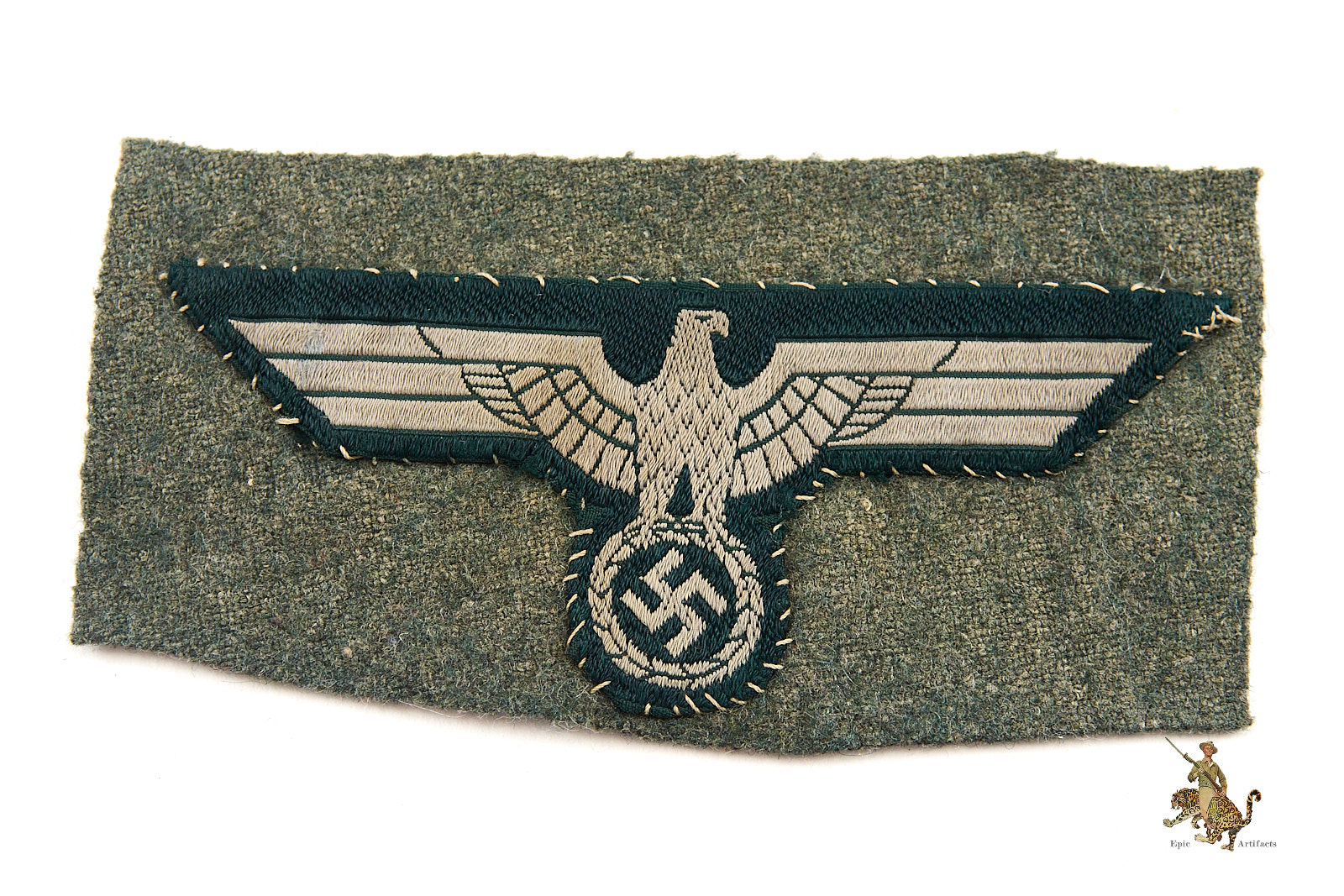 Historical Description: The German Armed Forces (Wehrmacht), as formed in 1935, and as they existed until the end of World War 2, consisted of the Army (Heer), the Air Force (Luftwaffe) and the Navy (Kriegsmarine). The Waffen-SS fell under the command of the Wehrmacht during the war. Each of these branches of service had a unique eagle design that was worn on both the formal dress and parade uniforms, and the field uniforms, of the members of that branch. These eagles were worn on soft headgear, including service and field caps, as well as on the uniform jacket. In the Heer, the Luftwaffe, and the Kriegsmarine, this eagle was worn on the chest of the tunic; collectors have termed these “breast eagles.” The Heer and the Luftwaffe generally used the same eagle style, though variations in color of the eagle or the backing distinguish between the two. The Luftwaffe used their own flying eagle emblem. The Waffen-SS sleeve eagle (and cap eagle) had wings that came to a distinctive tapered point. The cap, breast and sleeve eagles used by the various military branches were manufactured in many variations. There were machine-woven and machine embroidered versions, usually used by officers and NCOs. Hand-embroidered bullion wire eagles were typically for officers. There were metal eagles, for caps, or for uniforms that were intended to have detachable insignia. There were even eagles embroidered on camouflage fabric, intended for use on special field uniforms. There were also eagles in specific colors for use on tropical uniforms. Some of these eagles were mass-produced and are still common today. Others were, and are, very rare.