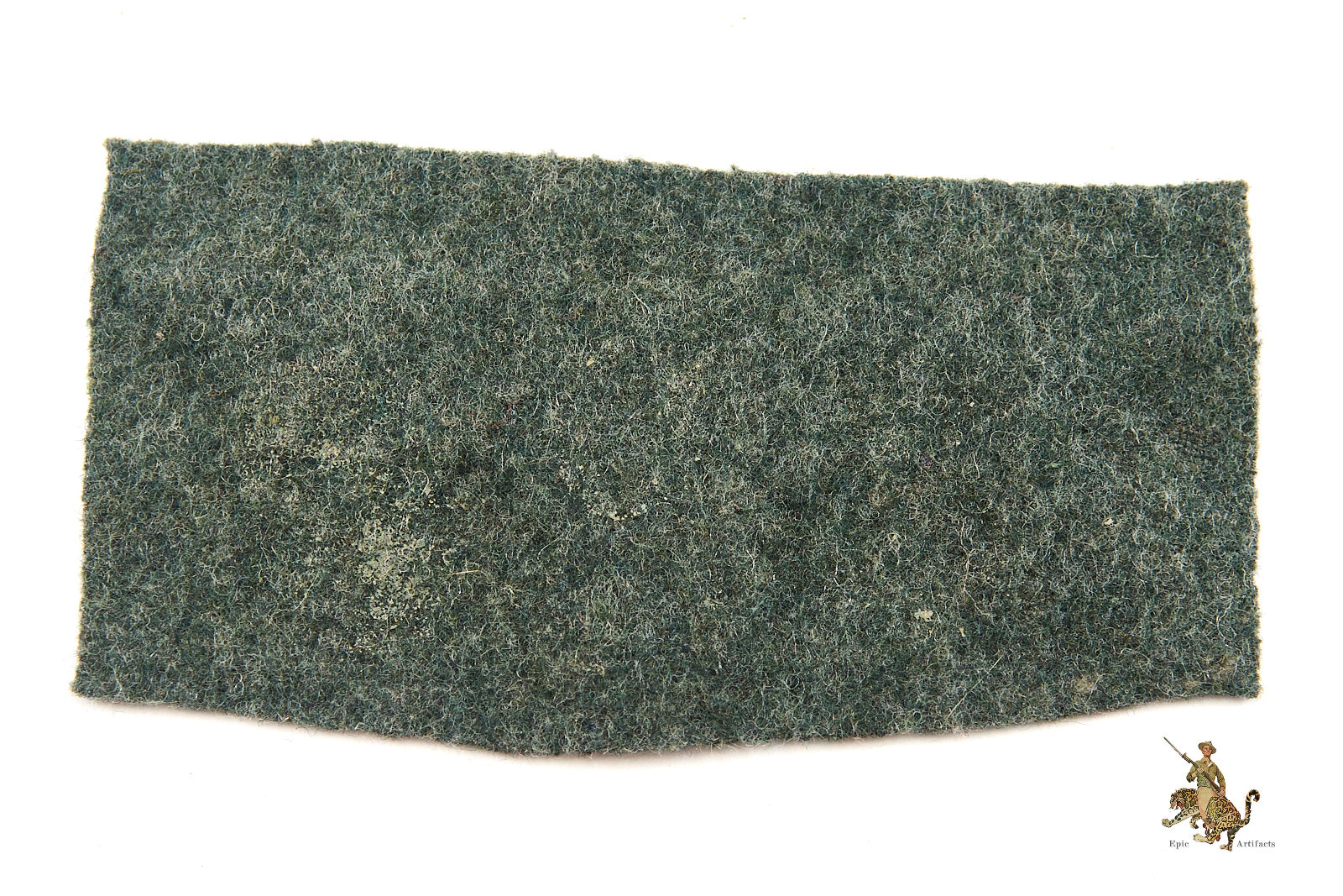 Product Description: This M36 Heer BeVo Breast Eagle Cutoff is a unique and very attractive piece. The Army breast eagle is of the pattern introduced in 1936. It’s Bevo, machine woven construction, with a blue gray German Army eagle and swastika emblem, on an emerald green rayon backing. This eagle has been neatly folded and machine sewn to a piece of typical wartime Feldgrau (field gray) wool that has been cut off of a uniform tunic. It appears that this was an eagle that was hand stitched to a tunic, and then very neatly cut off; the folding and stitching style are correct for wartime factory application on enlisted issue tunics. The reverse of this interesting piece shows the bobbin thread from the straight attachment stitching. There are no moth nips or thinning to this piece. The bevo eagle shows some discoloration from age and wear. The condition of this M36 Heer Breast Eagle is excellent +.
