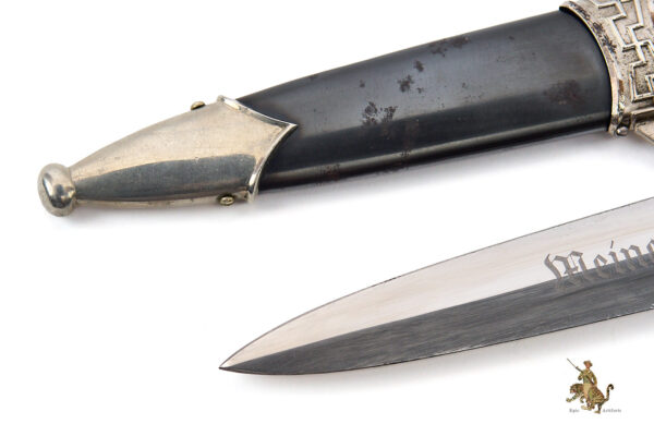 Historical Description: The Model 1933 (M33) SS dagger was first serviceable dagger produced for the SS. The design was derived from a 16th century Swiss hunting dagger called the “Holbein”. The M33 SS Dagger was worn by all ranks within the SS. Becoming a member of the SS was held in high respect during the Third Reich, and their daggers became a symbolic piece within its ranks. Every year on November 9th, the new SS men would pledge their full allegiance to the Führer (Adolf Hitler) in front of the Feldherrnhalle monument in Munich and receive their dagger as a symbol of that oath. The inscription on the blade “Mein Ehre Heißt Treue”, which translates to “My Honor is Loyalty”, was the motto of the SS.