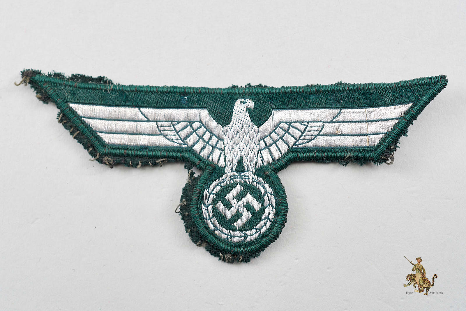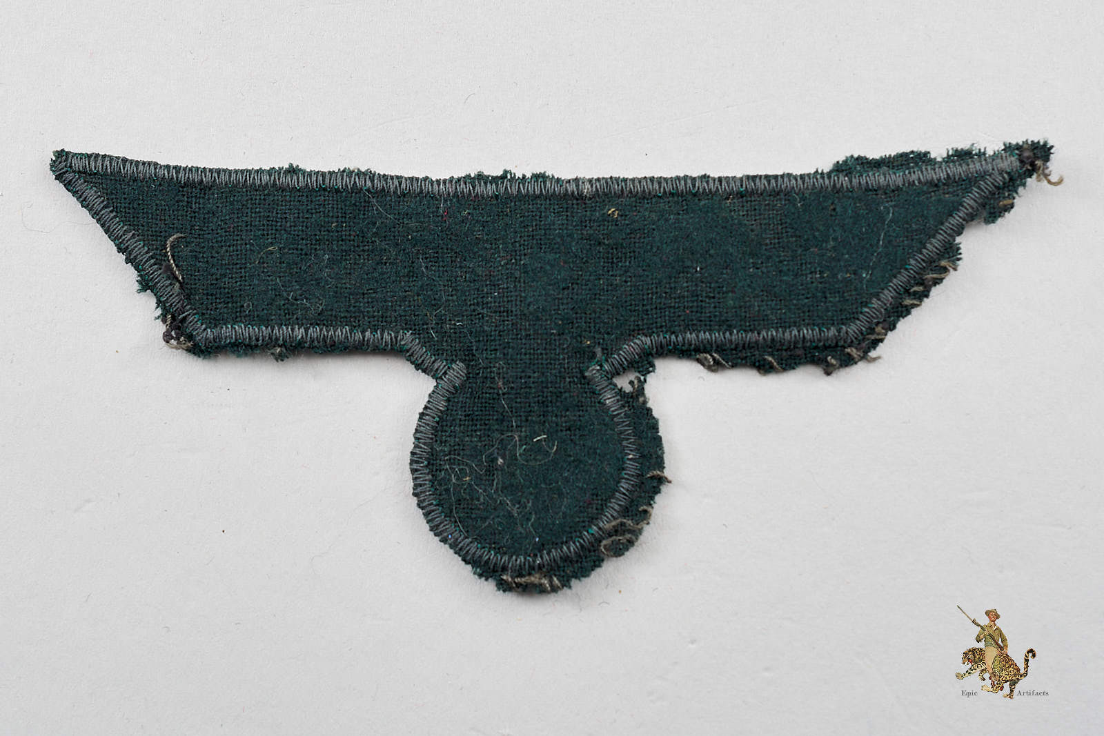 Historical Description: The German Armed Forces (Wehrmacht), as formed in 1935, and as they existed until the end of World War 2, consisted of the Army (Heer), the Air Force (Luftwaffe) and the Navy (Kriegsmarine). The Waffen-SS fell under the command of the Wehrmacht during the war. Each of these branches of service had a unique eagle design that was worn on both the formal dress and parade uniforms, and the field uniforms, of the members of that branch. These eagles were worn on soft headgear, including service and field caps, as well as on the uniform jacket. In the Heer, the Luftwaffe, and the Kriegsmarine, this eagle was worn on the chest of the tunic; collectors have termed these “breast eagles.” The Heer and the Luftwaffe generally used the same eagle style, though variations in color of the eagle or the backing distinguish between the two. The Luftwaffe used their own flying eagle emblem. The Waffen-SS sleeve eagle (and cap eagle) had wings that came to a distinctive tapered point. The cap, breast and sleeve eagles used by the various military branches were manufactured in many variations. There were machine-woven and machine embroidered versions, usually used by officers and NCOs. Hand-embroidered bullion wire eagles were typically for officers. There were metal eagles, for caps, or for uniforms that were intended to have detachable insignia. There were even eagles embroidered on camouflage fabric, intended for use on special field uniforms. There were also eagles in specific colors for use on tropical uniforms. Some of these eagles were mass-produced and are still common today. Others were, and are, very rare.