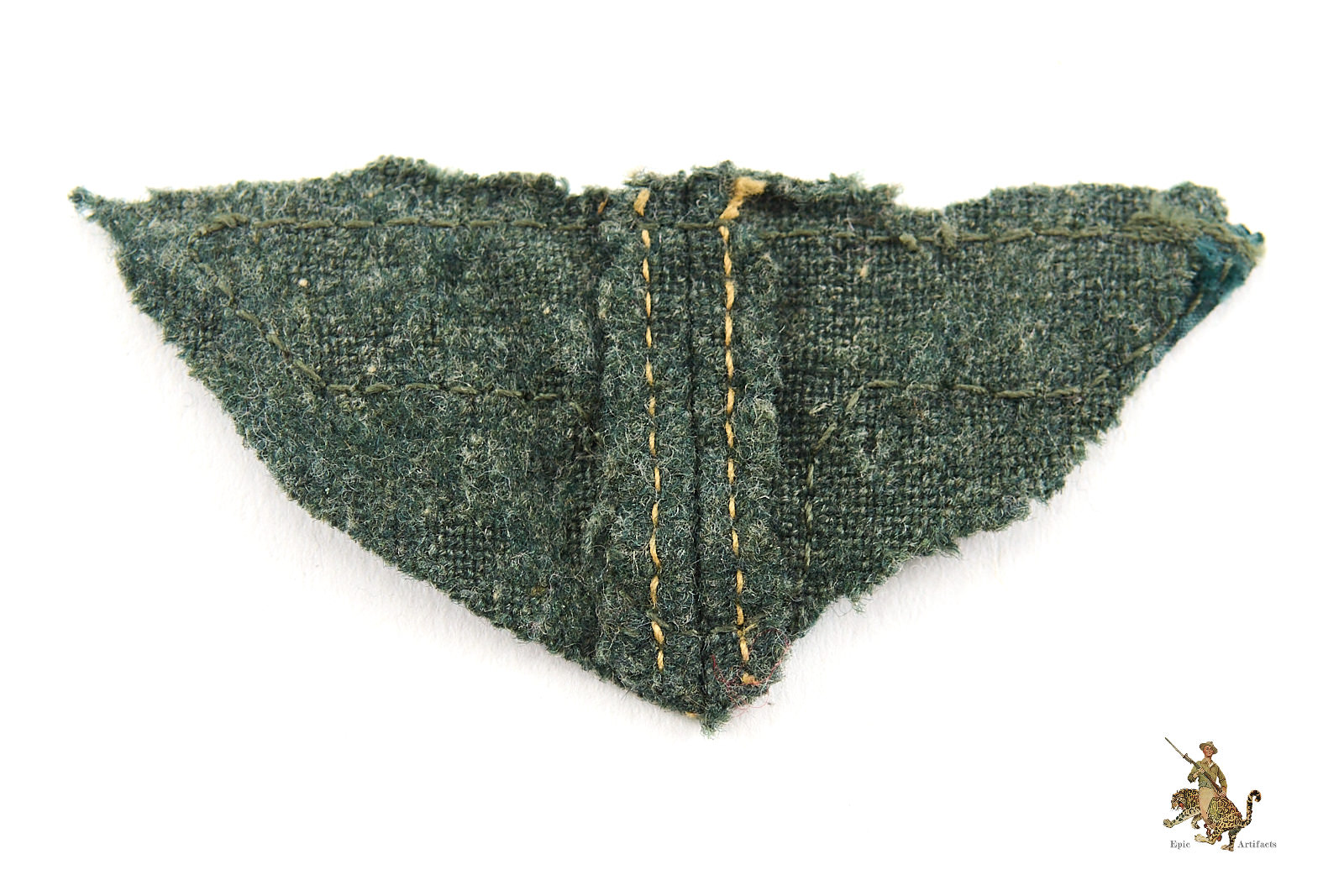 Product Description: This M36 Heer Cap Eagle executed in gray thread on field emerald green backing attached to feldgray wool and is machine stitched. This piece measures approximately 3″ across and was intended for wear on the Army overseas cap. The eagle remains crisp, but the border weave shows some staining and pinholes as shown. This M39 Heer Cap Eagle Cutoff is a well-preserved example overall, retaining strong visual appeal and character consistent with wartime production and is in excellent condition.