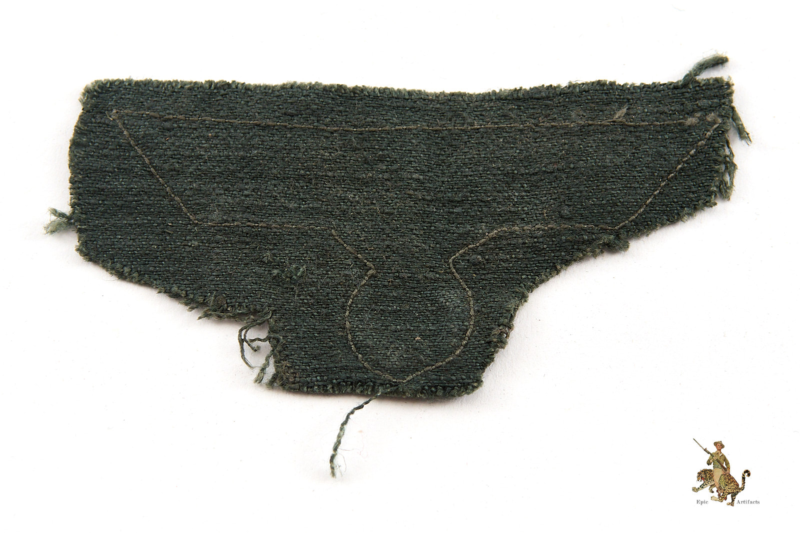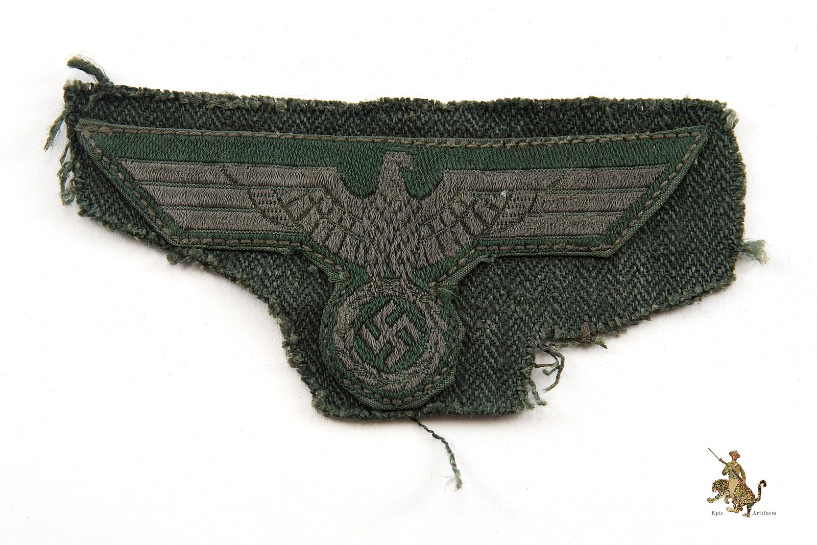 Historical Description: The German Armed Forces (Wehrmacht), as formed in 1935, and as they existed until the end of World War 2, consisted of the Army (Heer), the Air Force (Luftwaffe) and the Navy (Kriegsmarine). The Waffen-SS fell under the command of the Wehrmacht during the war. Each of these branches of service had a unique eagle design that was worn on both the formal dress and parade uniforms, and the field uniforms, of the members of that branch. These eagles were worn on soft headgear, including service and field caps, as well as on the uniform jacket. In the Heer, the Luftwaffe, and the Kriegsmarine, this eagle was worn on the chest of the tunic; collectors have termed these “breast eagles.” The Heer and the Luftwaffe generally used the same eagle style, though variations in color of the eagle or the backing distinguish between the two. The Luftwaffe used their own flying eagle emblem. The Waffen-SS sleeve eagle (and cap eagle) had wings that came to a distinctive tapered point. The cap, breast and sleeve eagles used by the various military branches were manufactured in many variations. There were machine-woven and machine embroidered versions, usually used by officers and NCOs. Hand-embroidered bullion wire eagles were typically for officers. There were metal eagles, for caps, or for uniforms that were intended to have detachable insignia. There were even eagles embroidered on camouflage fabric, intended for use on special field uniforms. There were also eagles in specific colors for use on tropical uniforms. Some of these eagles were mass-produced, and are still common today; others were and are very rare.</