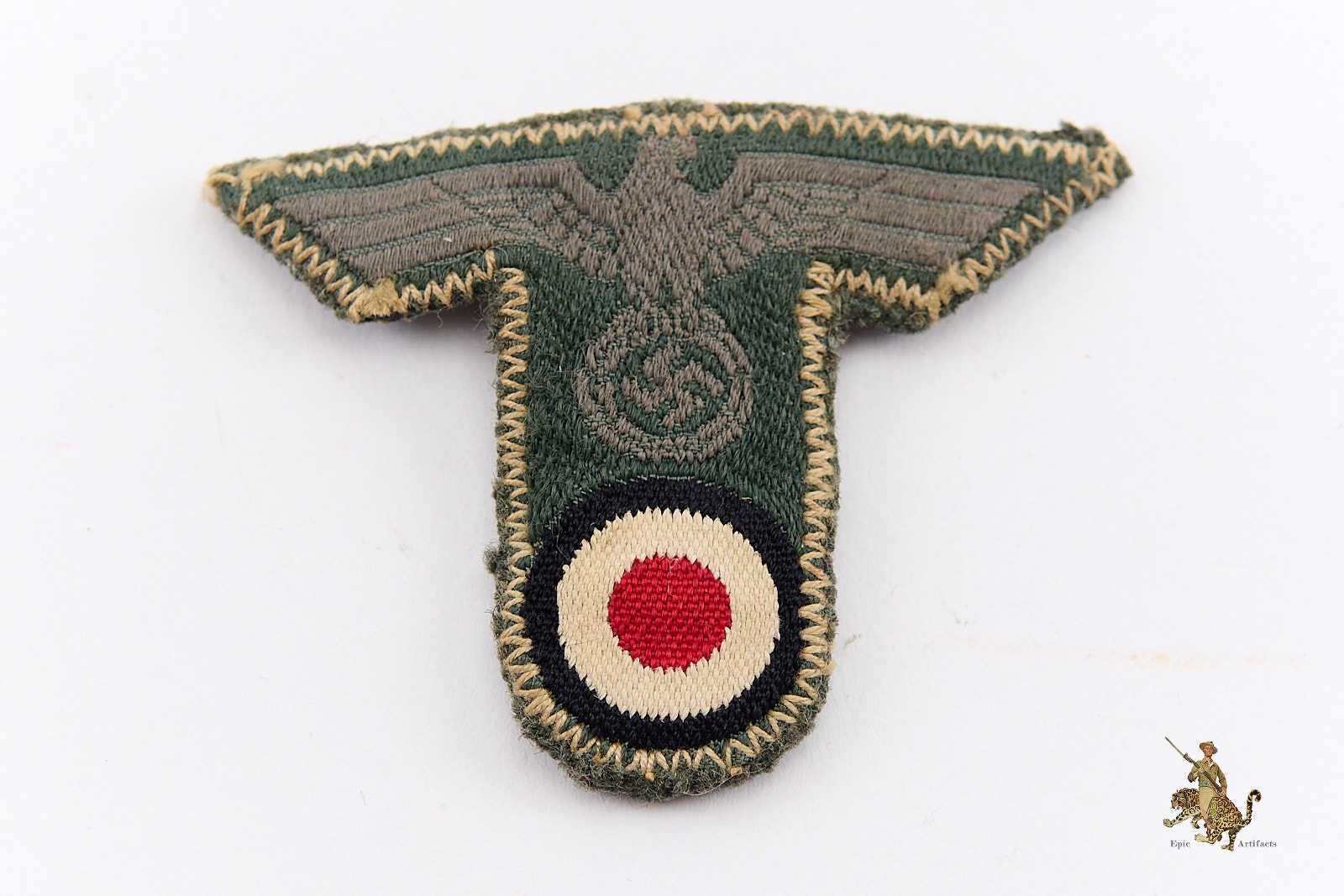 Historical Description:  German cloth cap eagles were a standard insignia worn on military headgear across all branches of the German armed forces during the Third Reich (1933–1945). Featuring the national eagle clutching a swastika, these emblems symbolized authority and allegiance to the regime. They were typically worn on side caps (Feldmützen) and visored caps (Schirmmützen), produced in various forms such as machine-woven (BeVo), embroidered, or printed, depending on the branch, rank, and production period. Each service had its own color scheme—silver-gray on field gray for the Heer, white on blue-gray for the Luftwaffe, golden-yellow on dark blue for the Kriegsmarine, and white or gray on black or field gray for the Waffen-SS.