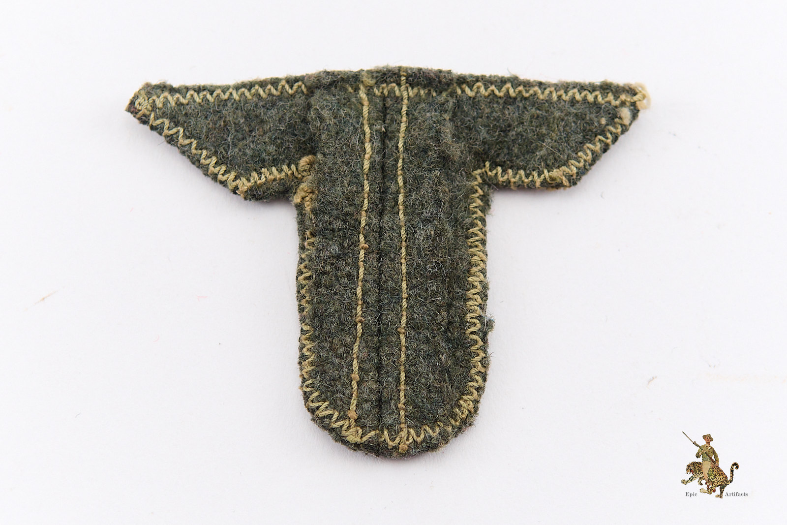Product Description:  A fine example of the M40 Heer BeVo T-Eagle Cap Insignia – Cutoff, originally designed for wear on the Bergmütze (mountain cap) issued to Gebirgsjäger troops. Woven in flat, machine-embroidered rayon thread on a dark green backing, this eagle follows the early T-shaped pattern, often referred to as the standard issue for M40 caps.