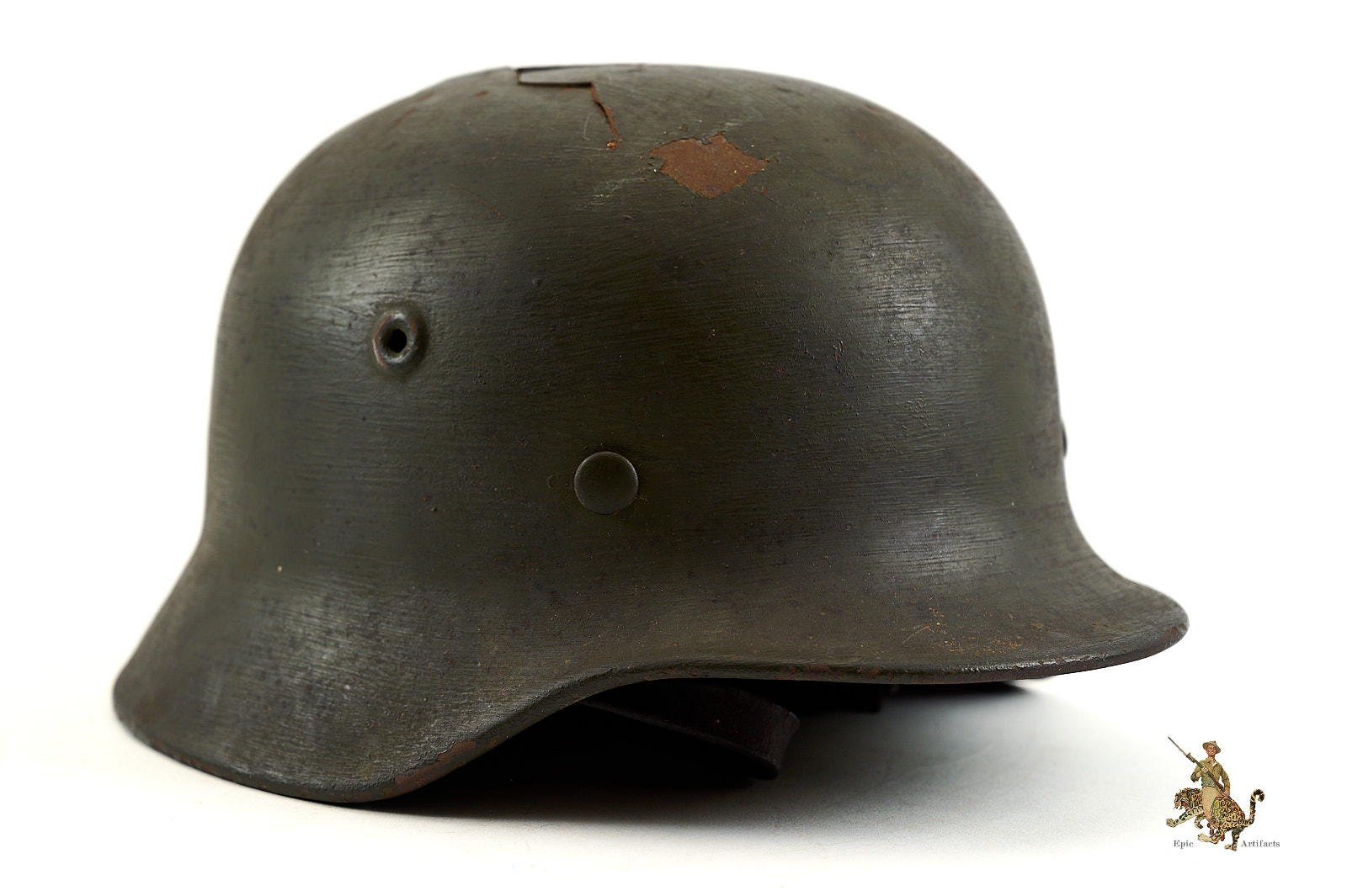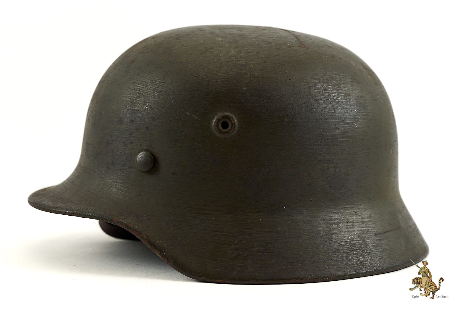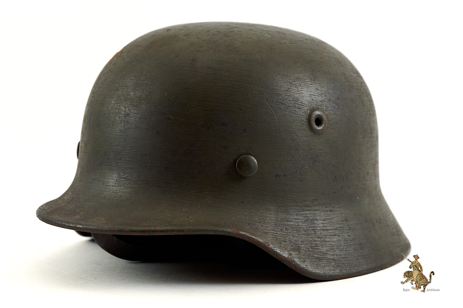 Historical Description: When the German Army first marched into war in 1914, it went to the front lines wearing the traditional “Picklehaube” helmets. The war soon developed to necessitate the need for an improved headgear to protect the wearer. The German Army developed the M16 helmet in 1915 and began issuing it in mass quantity to its fighting troops in 1916. The M16 underwent changes to bring about the next model, the M18. Both the M16 and M18 saw use by the German Army during WW1, as well as the interwar years by the Reichswehr and Freikorps. In 1931, a new liner system was developed. The M16 and M18 helmets were in mass supply right up to the time the Nazi Party took control of the German government. During Adolf Hitler’s rearming of the German military in the early 1930’s, the M16 and M18 helmets saw extensive refitting with the newer liner system, fresh paint, and the addition of a centralized decal system for the newly formed Wehrmacht’s respective branches. Decals were generally placed on each side of the helmet, one side being the branch and the other the national colors shield or party shield. In 1935, the M35 helmet was introduced. This new design was lighter and more streamlined than the older style helmets and is what the world now recognizes as the iconic helmet of the German Military. M35 helmets can most easily be identified from the separate rivet ventholes and rolled edges. With the outbreak of war, some changes were made to bring in a new model, the M40. The changes made to this new model was the use of a more matte field grey finish and the vent holes were now integral to the helmets shell. In 1940, the national colors decals and party shields were ordered to be removed. It should be noted that many M35 helmets were brought up to date by repainting them with the matte field grey finish and/or other modifications if necessary. These refitted helmets are what collectors now term “reissue helmets”. The next model helmet to evolve was the M42. The model M42 has the same features of the M40 with the exception of the edges of the helmet not being rolled and remain flared. This was to speed up production and lower cost as the war dragged on and the German economy began changing to a total war economy. In 1943 all decals were ordered to be removed from combat helmets.