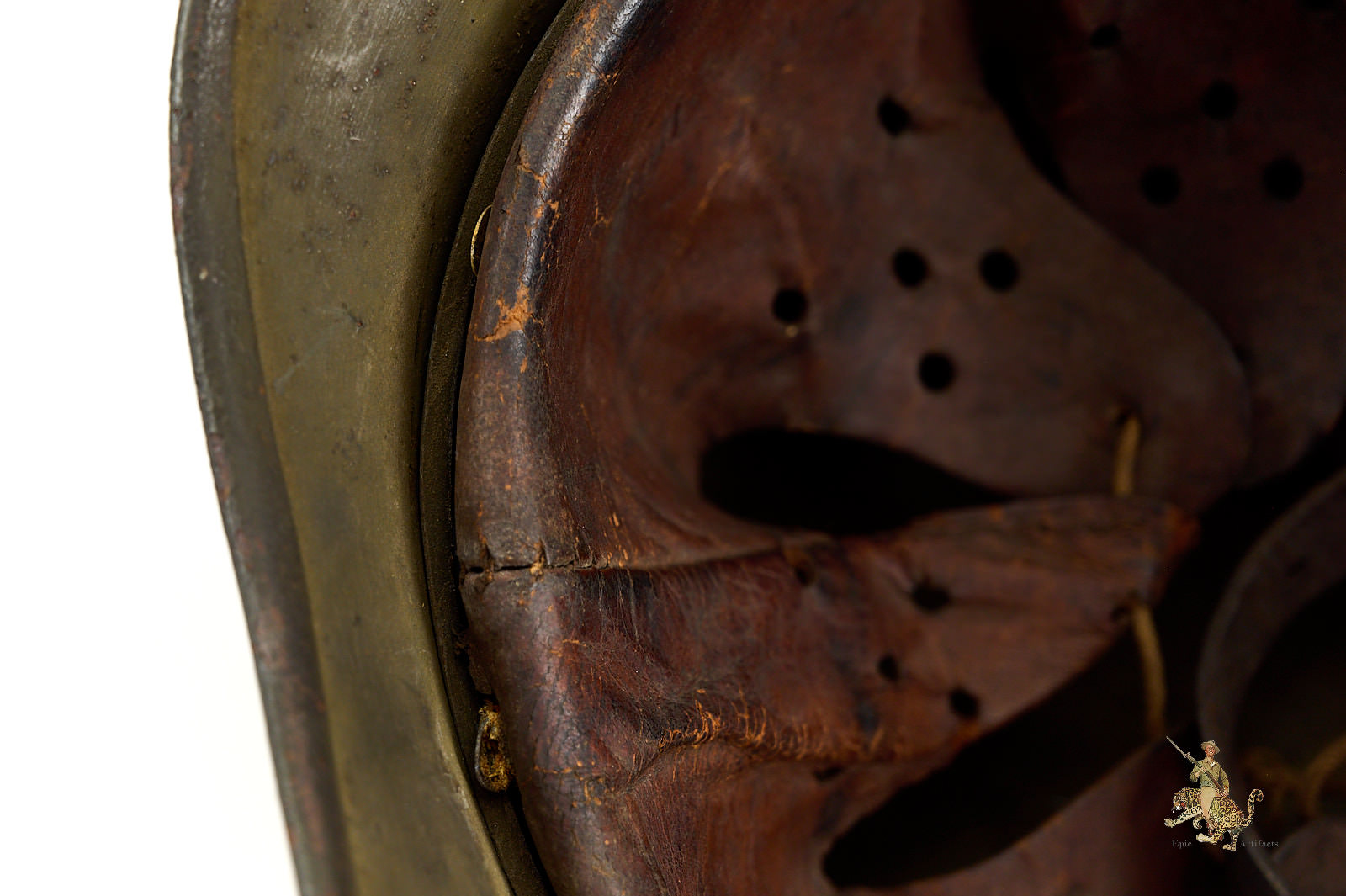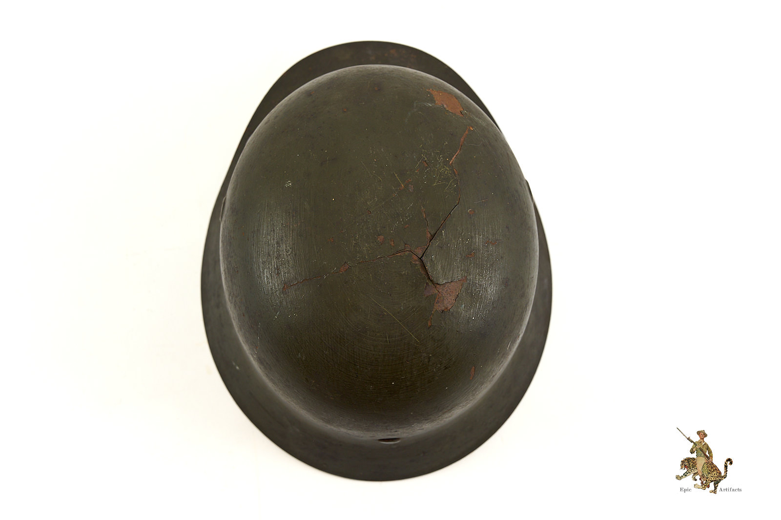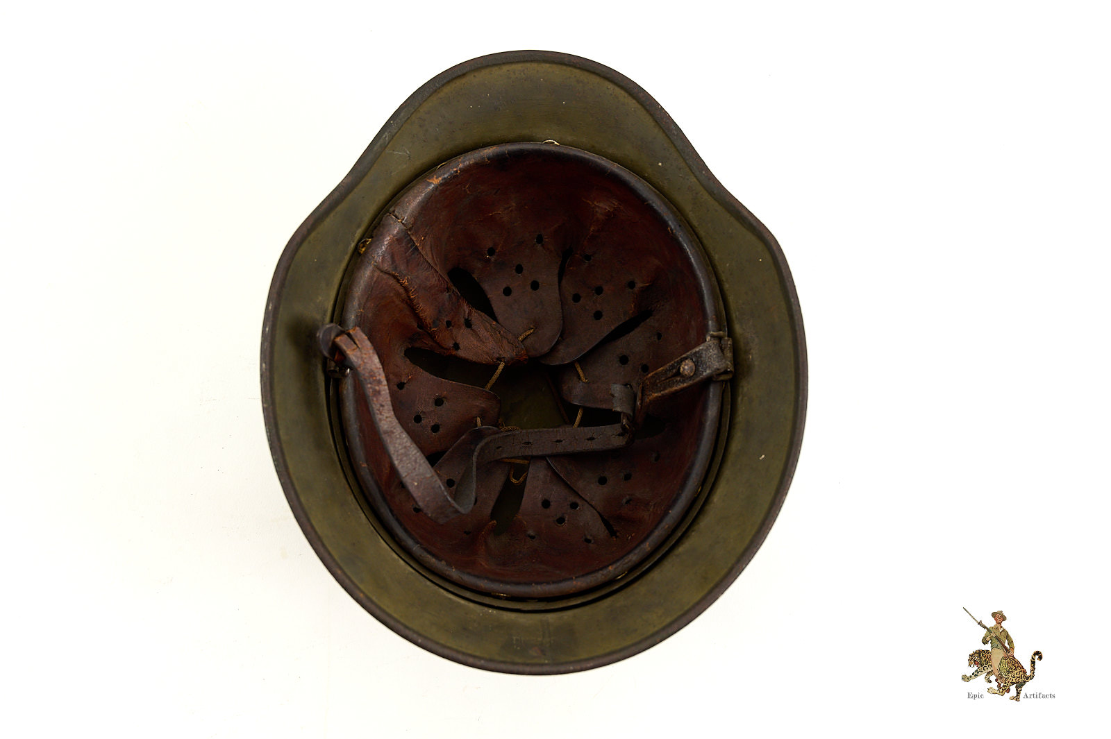 Historical Description: When the German Army first marched into war in 1914, it went to the front lines wearing the traditional “Picklehaube” helmets. The war soon developed to necessitate the need for an improved headgear to protect the wearer. The German Army developed the M16 helmet in 1915 and began issuing it in mass quantity to its fighting troops in 1916. The M16 underwent changes to bring about the next model, the M18. Both the M16 and M18 saw use by the German Army during WW1, as well as the interwar years by the Reichswehr and Freikorps. In 1931, a new liner system was developed. The M16 and M18 helmets were in mass supply right up to the time the Nazi Party took control of the German government. During Adolf Hitler’s rearming of the German military in the early 1930’s, the M16 and M18 helmets saw extensive refitting with the newer liner system, fresh paint, and the addition of a centralized decal system for the newly formed Wehrmacht’s respective branches. Decals were generally placed on each side of the helmet, one side being the branch and the other the national colors shield or party shield. In 1935, the M35 helmet was introduced. This new design was lighter and more streamlined than the older style helmets and is what the world now recognizes as the iconic helmet of the German Military. M35 helmets can most easily be identified from the separate rivet ventholes and rolled edges. With the outbreak of war, some changes were made to bring in a new model, the M40. The changes made to this new model was the use of a more matte field grey finish and the vent holes were now integral to the helmets shell. In 1940, the national colors decals and party shields were ordered to be removed. It should be noted that many M35 helmets were brought up to date by repainting them with the matte field grey finish and/or other modifications if necessary. These refitted helmets are what collectors now term “reissue helmets”. The next model helmet to evolve was the M42. The model M42 has the same features of the M40 with the exception of the edges of the helmet not being rolled and remain flared. This was to speed up production and lower cost as the war dragged on and the German economy began changing to a total war economy. In 1943 all decals were ordered to be removed from combat helmets.