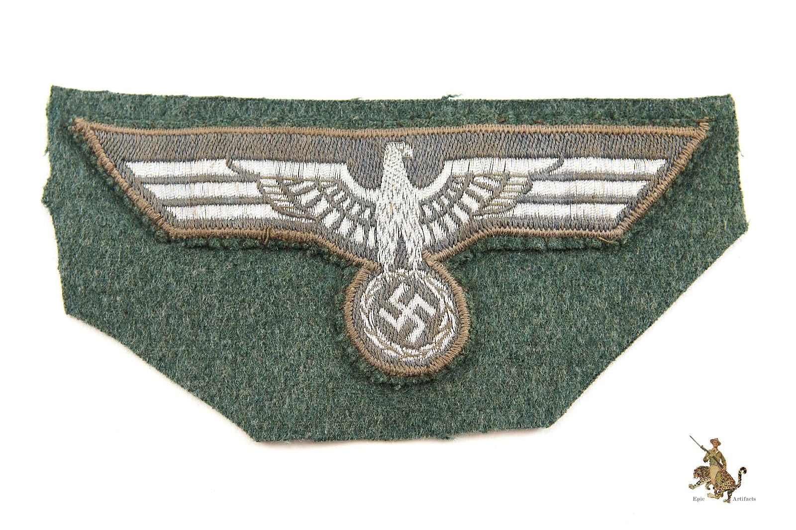 Historical Description: The German Armed Forces (Wehrmacht), as formed in 1935, and as they existed until the end of World War 2, consisted of the Army (Heer), the Air Force (Luftwaffe) and the Navy (Kriegsmarine). The Waffen-SS fell under the command of the Wehrmacht during the war. Each of these branches of service had a unique eagle design that was worn on both the formal dress and parade uniforms, and the field uniforms, of the members of that branch. These eagles were worn on soft headgear, including service and field caps, as well as on the uniform jacket. In the Heer, the Luftwaffe, and the Kriegsmarine, this eagle was worn on the chest of the tunic; collectors have termed these “breast eagles.” The Heer and the Luftwaffe generally used the same eagle style, though variations in color of the eagle or the backing distinguish between the two. The Luftwaffe used their own flying eagle emblem. The Waffen-SS sleeve eagle (and cap eagle) had wings that came to a distinctive tapered point. The cap, breast and sleeve eagles used by the various military branches were manufactured in many variations. There were machine-woven and machine embroidered versions, usually used by officers and NCOs. Hand-embroidered bullion wire eagles were typically for officers. There were metal eagles, for caps, or for uniforms that were intended to have detachable insignia. There were even eagles embroidered on camouflage fabric, intended for use on special field uniforms. There were also eagles in specific colors for use on tropical uniforms. Some of these eagles were mass-produced and are still common today. Others were, and are, very rare.