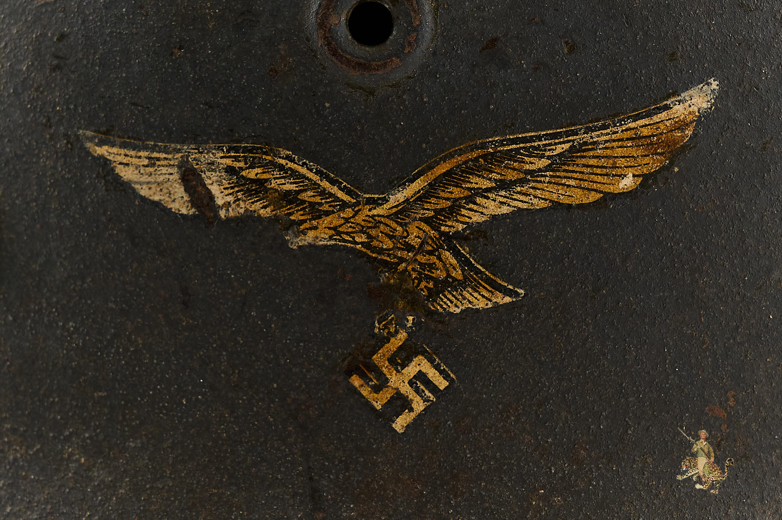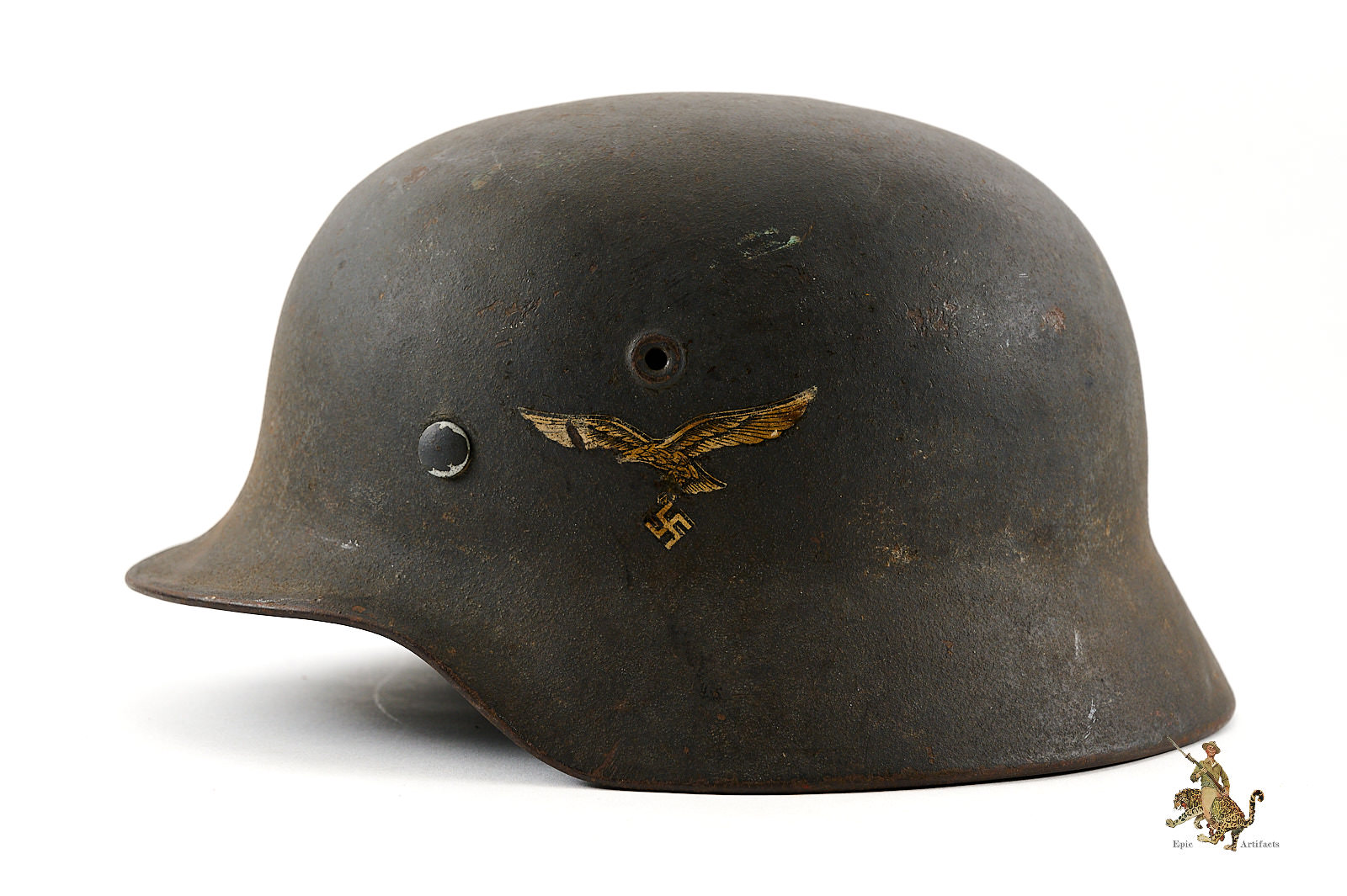 Product Description: A well-preserved example of the M40 Luftwaffe Single Decal Helmet – EF66, featuring its original textured blue-gray combat paint, showing scuffs, minor corrosion, paint loss, and handling marks consistent with age and field use. The Luftwaffe decal remains 90% complete, with nice detail, showing a small area where decal has scratched away.
