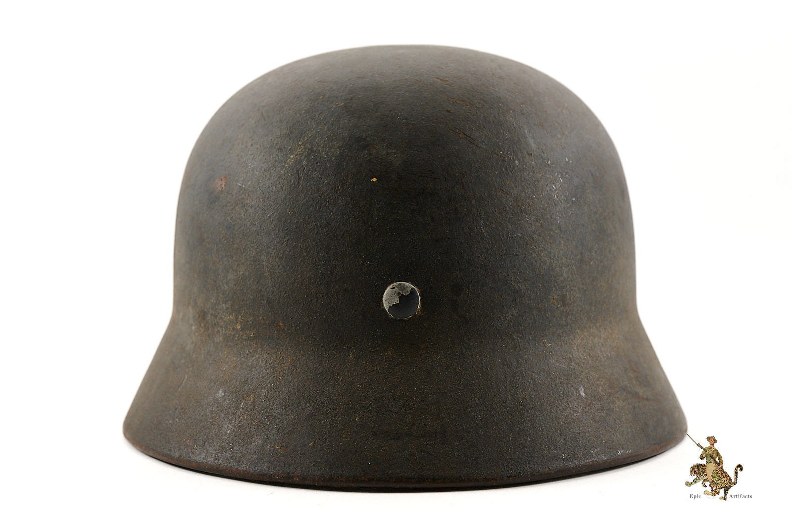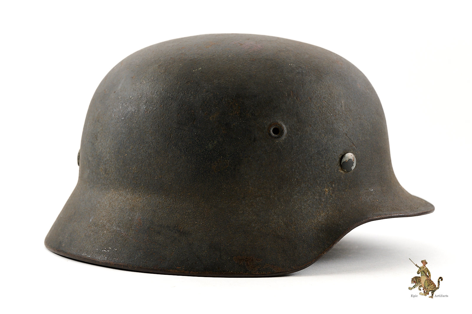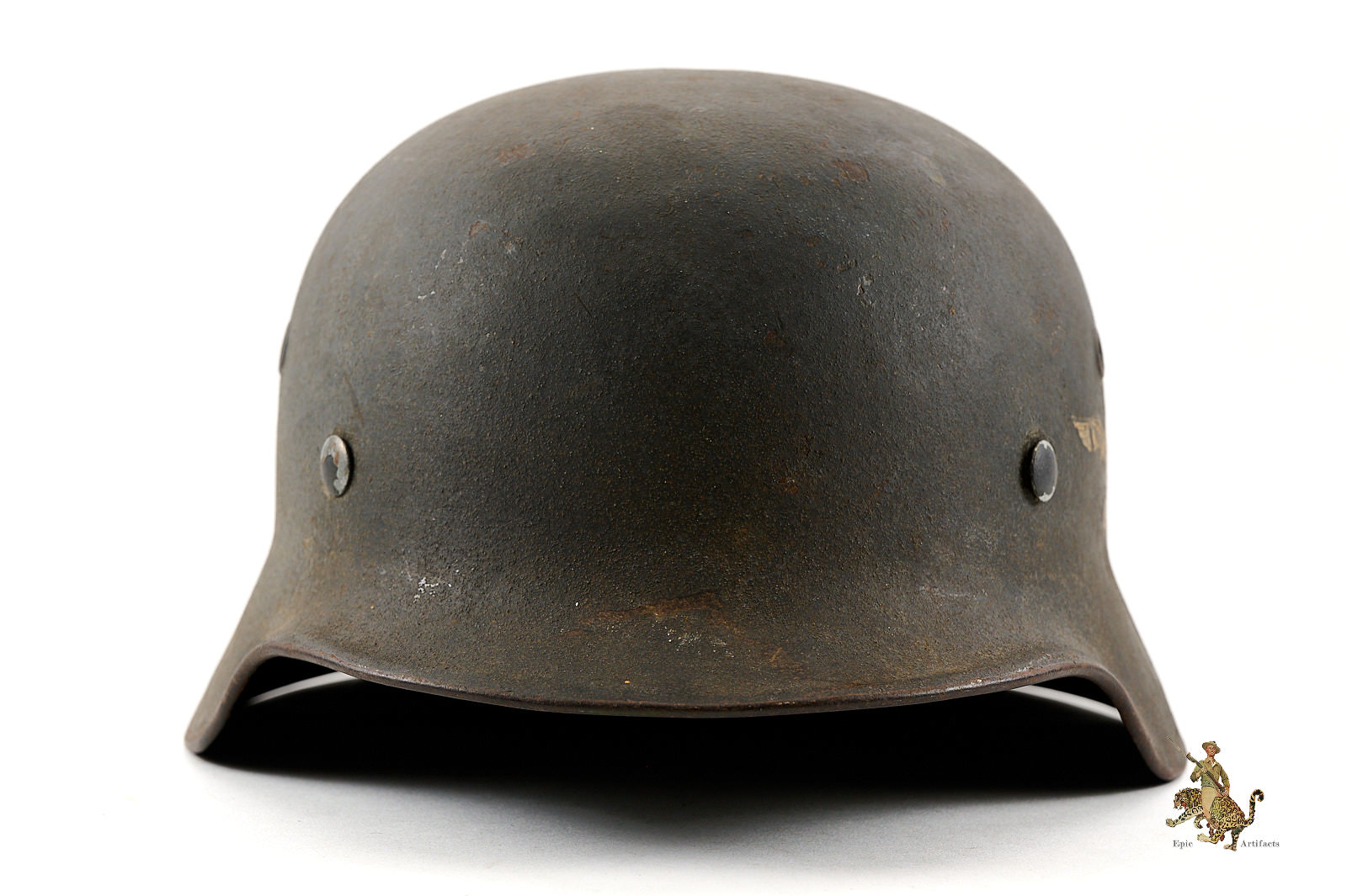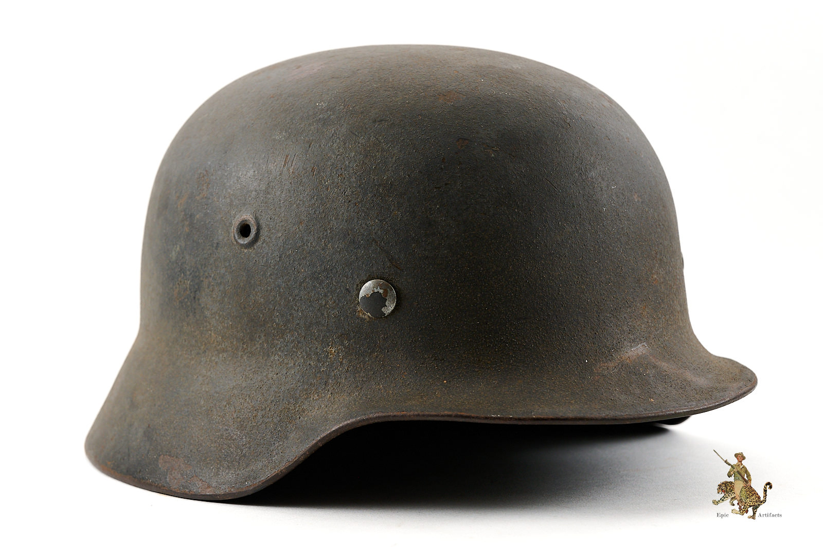 Historical Description: When the German Army first marched into war in 1914, it went to the front lines wearing the traditional “Picklehaube” helmets. The war soon developed to necessitate the need for an improved headgear to protect the wearer. The German Army developed the M16 helmet in 1915 and began issuing it in mass quantity to its fighting troops in 1916. The M16 underwent changes to bring about the next model, the M18. Both the M16 and M18 saw use by the German Army during WW1, as well as the interwar years by the Reichswehr and Freikorps. In 1931, a new liner system was developed. The M16 and M18 helmets were in mass supply right up to the time the Nazi Party took control of the German government. During Adolf Hitler’s rearming of the German military in the early 1930’s, the M16 and M18 helmets saw extensive refitting with the newer liner system, fresh paint, and the addition of a centralized decal system for the newly formed Wehrmacht’s respective branches. Decals were generally placed on each side of the helmet, one side being the branch and the other the national colors shield or party shield. In 1935, the M35 helmet was introduced. This new design was lighter and more streamlined than the older style helmets and is what the world now recognizes as the iconic helmet of the German Military. M35 helmets can most easily be identified from the separate rivet ventholes and rolled edges. With the outbreak of war, some changes were made to bring in a new model, the M40. The changes made to this new model was the use of a more matte field grey finish and the vent holes were now integral to the helmets shell. In 1940, the national colors decals and party shields were ordered to be removed. It should be noted that many M35 helmets were brought up to date by repainting them with the matte field grey finish and/or other modifications if necessary. These refitted helmets are what collectors now term “reissue helmets”. The next model helmet to evolve was the M42. The model M42 has the same features of the M40 with the exception of the edges of the helmet not being rolled and remain flared. This was to speed up production and lower cost as the war dragged on and the German economy began changing to a total war economy. In 1943 all decals were ordered to be removed from combat helmets.