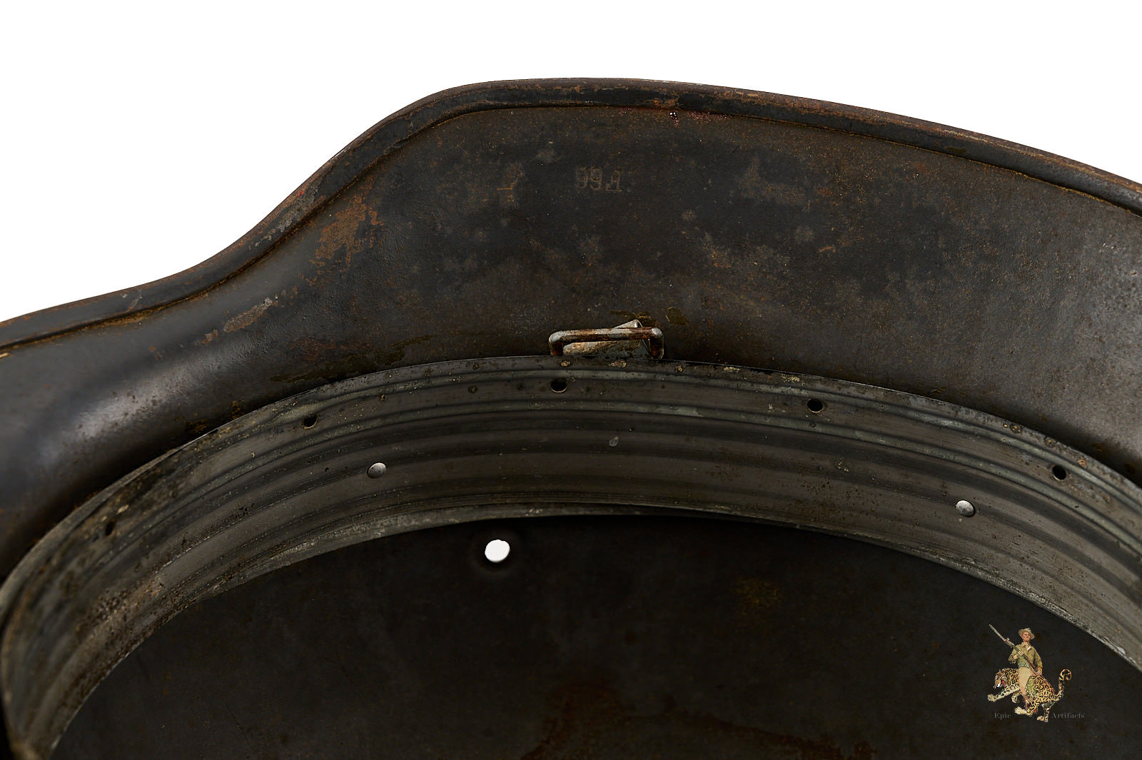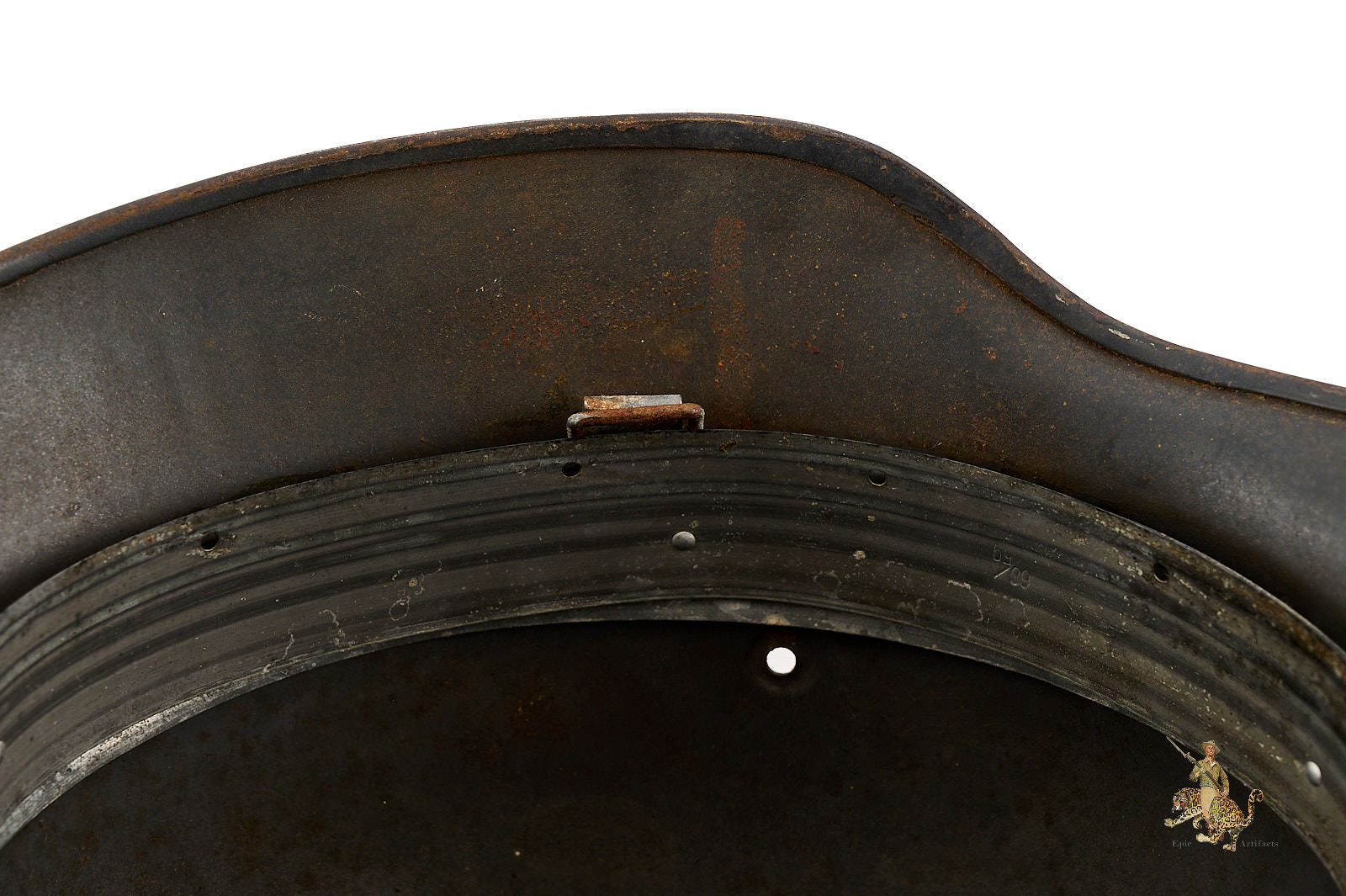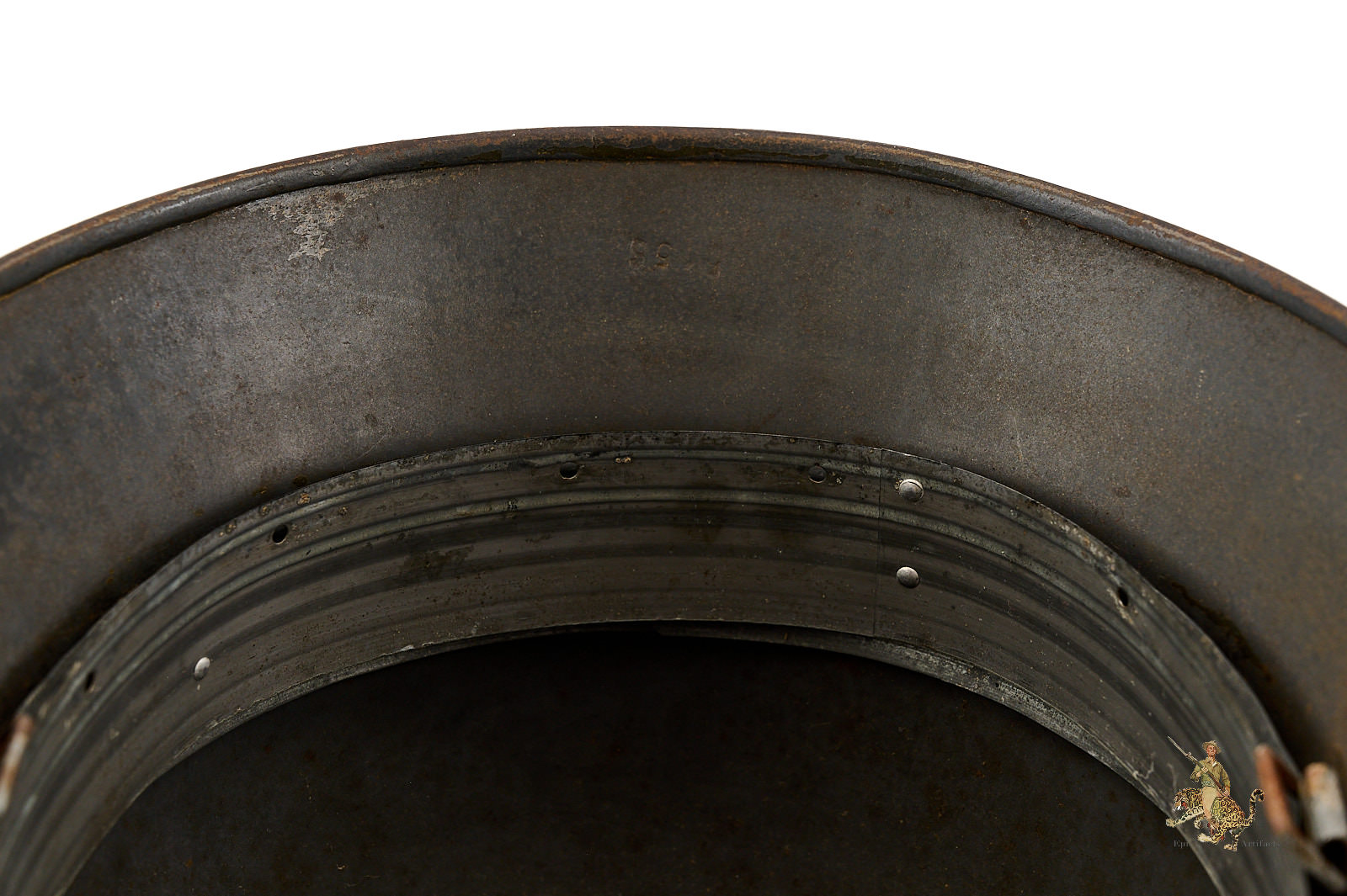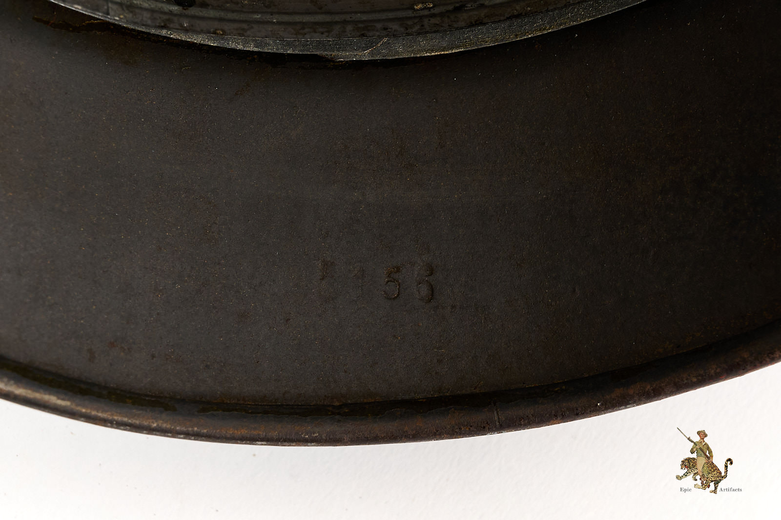The shell is stamped with lot number 5156and bears a EF66 marking. All three liner pins remain intact, with a clearly defined and untouched dust ring. The leather liner is missing, but original aluminum ring is intact..