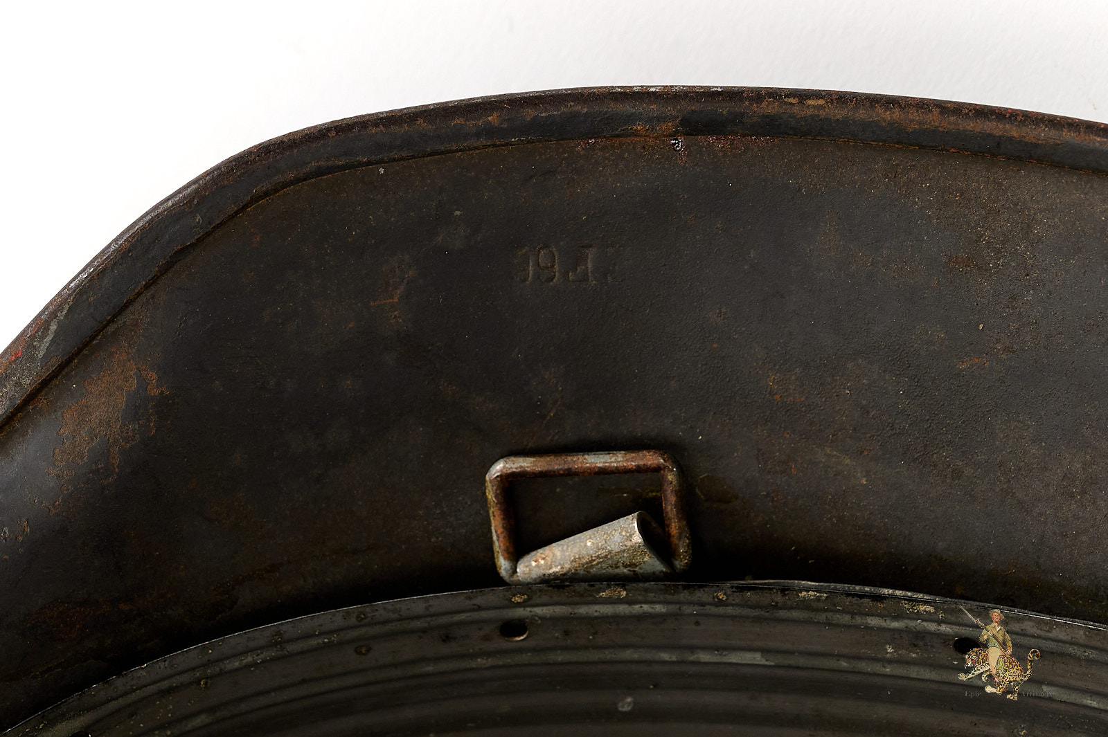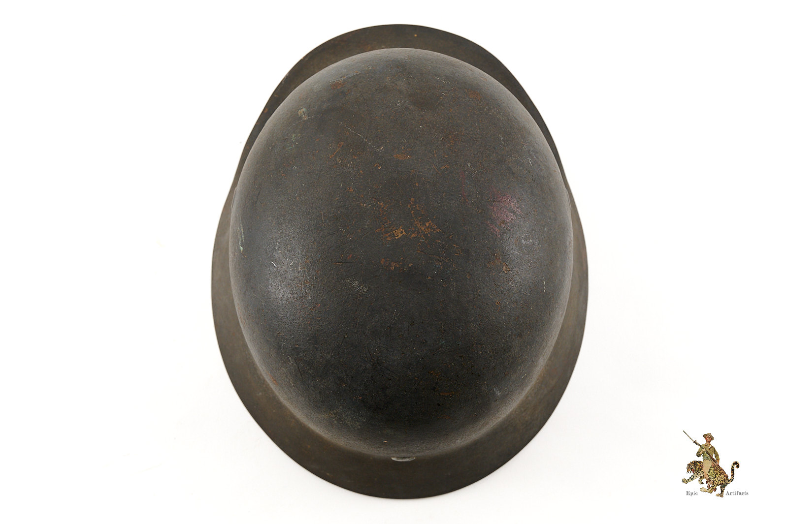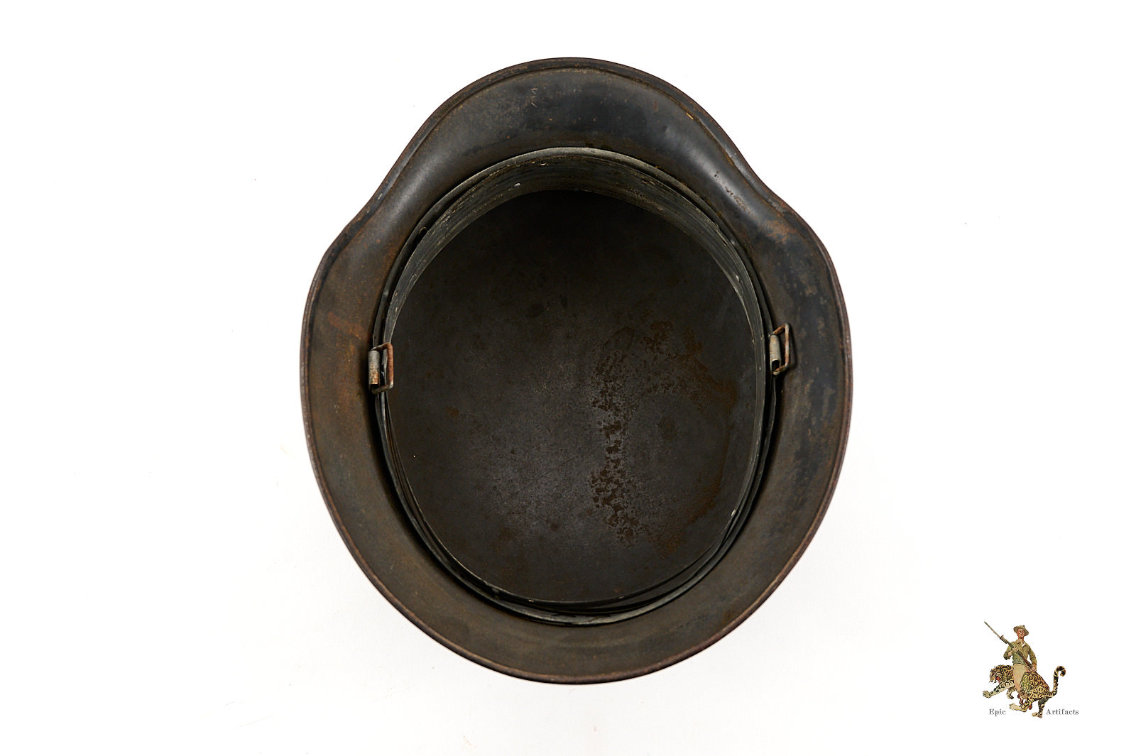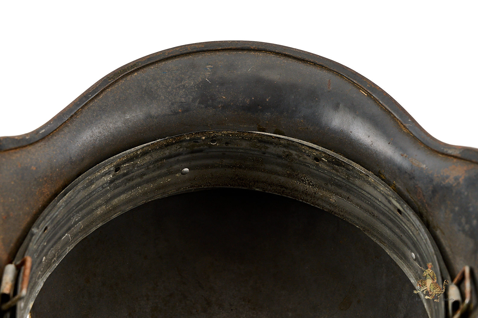 The shell is stamped with lot number 5156and bears a EF66 marking. All three liner pins remain intact, with a clearly defined and untouched dust ring. The leather liner is missing, but original aluminum ring is intact..