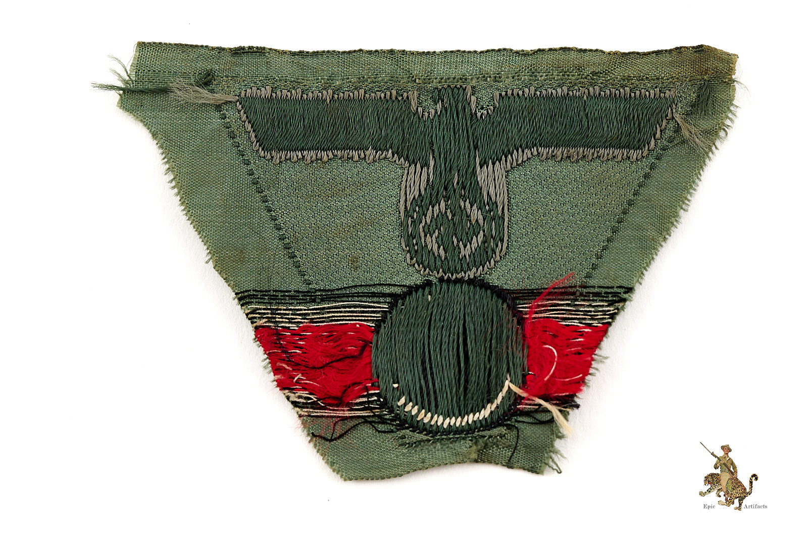 Historical Description: The German Armed Forces (Wehrmacht), as formed in 1935, and as they existed until the end of World War 2, consisted of the Army (Heer), the Air Force (Luftwaffe) and the Navy (Kriegsmarine). The Waffen-SS fell under the command of the Wehrmacht during the war. Each of these branches of service had a unique eagle design that was worn on both the formal dress and parade uniforms, and the field uniforms, of the members of that branch. These eagles were worn on soft headgear, including service and field caps, as well as on the uniform jacket. In the Heer, the Luftwaffe, and the Kriegsmarine, this eagle was worn on the chest of the tunic; collectors have termed these “breast eagles.” The Heer and the Luftwaffe generally used the same eagle style, though variations in color of the eagle or the backing distinguish between the two. The Luftwaffe used their own flying eagle emblem. The Waffen-SS sleeve eagle (and cap eagle) had wings that came to a distinctive tapered point. The cap, breast and sleeve eagles used by the various military branches were manufactured in many variations. There were machine-woven and machine embroidered versions, usually used by officers and NCOs. Hand-embroidered bullion wire eagles were typically for officers. There were metal eagles, for caps, or for uniforms that were intended to have detachable insignia. There were even eagles embroidered on camouflage fabric, intended for use on special field uniforms. There were also eagles in specific colors for use on tropical uniforms. Some of these eagles were mass-produced and are still common today. Others were, and are, very rare.