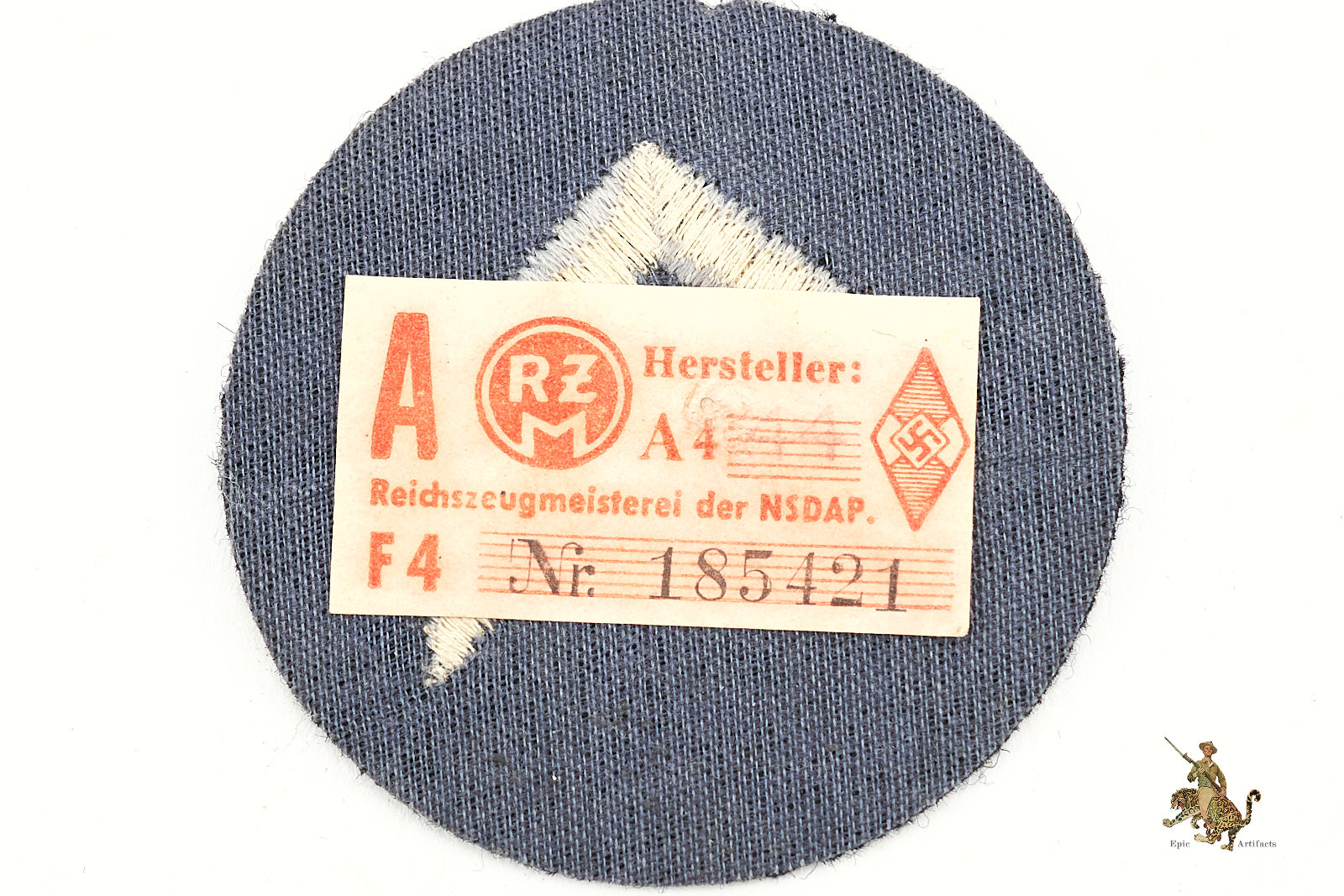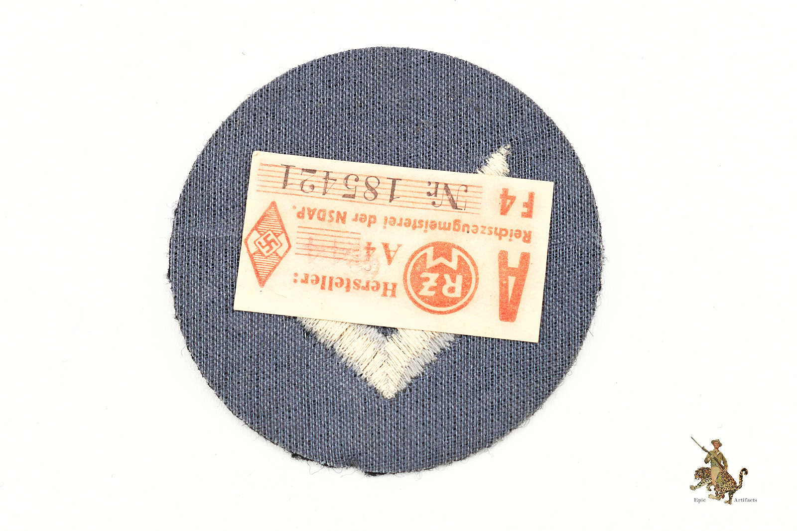 Product Description: A Marine-HJ/DJ rank insignia, designated for a Marine-HJ “Oberrottenführer” or DJ “Oberhordenführer”, worn on the upper right sleeve of the uniform. The insignia consists of a 60mm diameter very dark navy blue wool disk, with machine-embroidered dual “V” chevrons in silver-grey thread, denoting an intermediate leadership rank. The reverse features a protective black ribbed fabric backing, with an intact RZM tag. This example remains in excellent condition, with only minor signs of age.