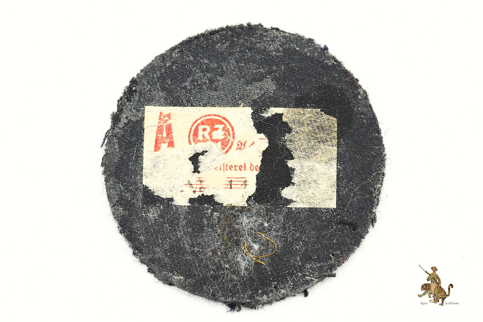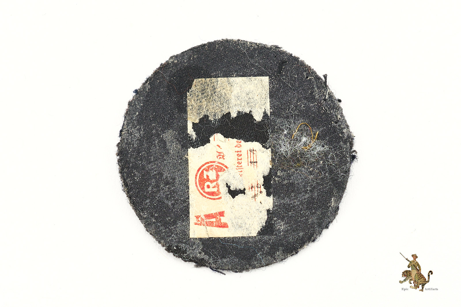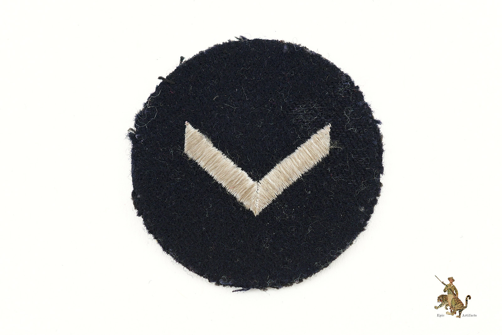 Product Description: A Marine-HJ/DJ rank insignia, designated for a “Hordenführer”, worn on the upper right sleeve of the uniform. The insignia consists of a 60mm diameter very dark navy blue wool disk, with a machine-embroidered silver-grey “V” chevron denoting rank. The reverse features a protective black ribbed fabric backing, with a partial RZM tag still intact. This example remains in excellent condition, with only minor signs of age.