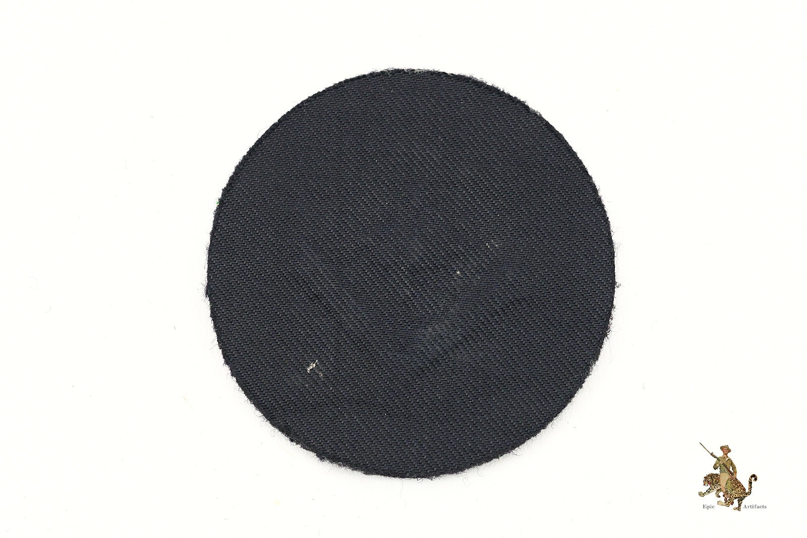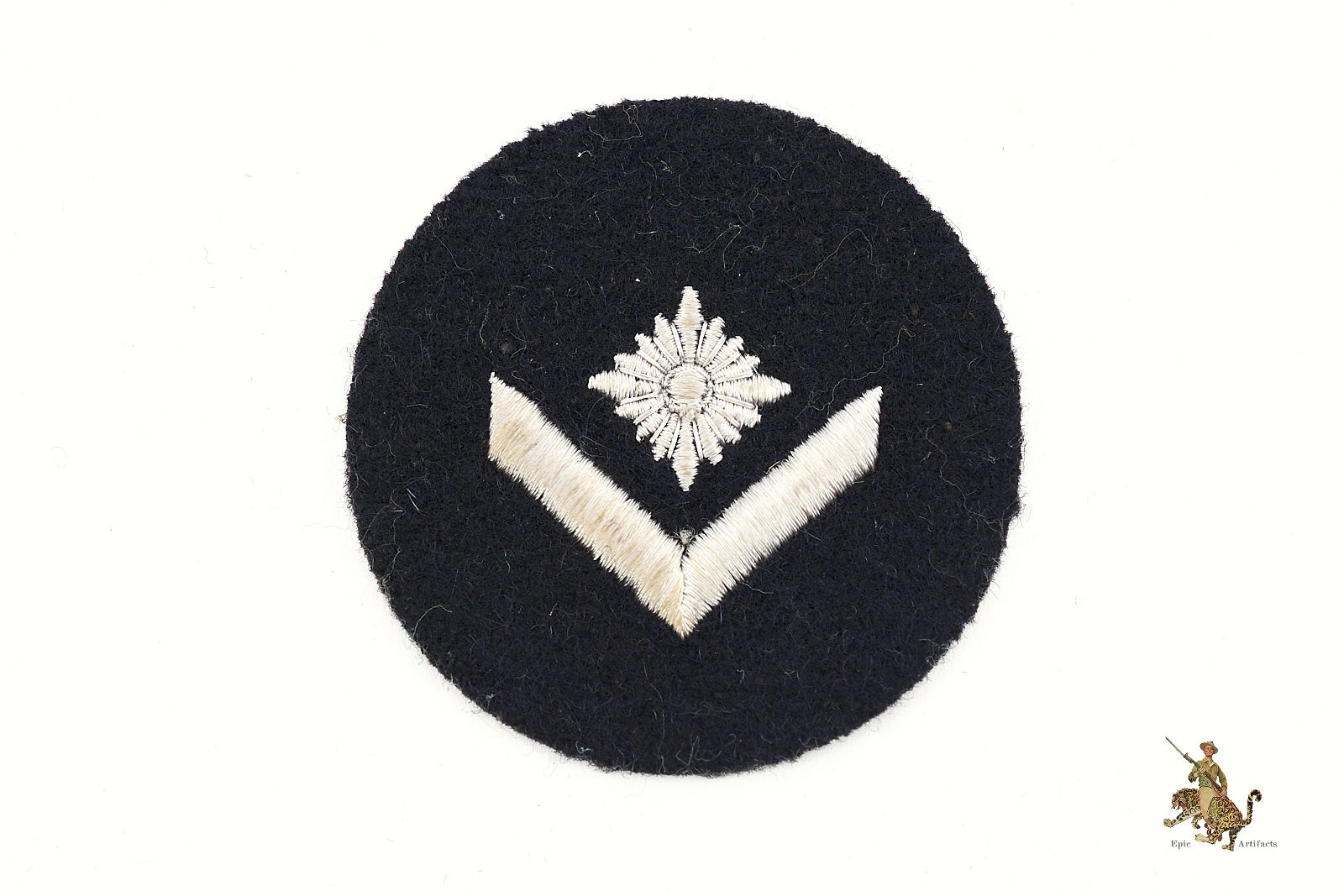 Product Description: 1938 pattern, revised sleeve rank insignia consists of a roughly 60mm diameter navy blue wool base with a machine embroidered rank chevron and pip in silvery/grey threads to the center. The reverse of the insignia has a protective black oilcloth backing. The insignia signifies the ranks of Marine-HJ Oberkameradschaftsführer, and DJ-Oberjungenschaftsführer.