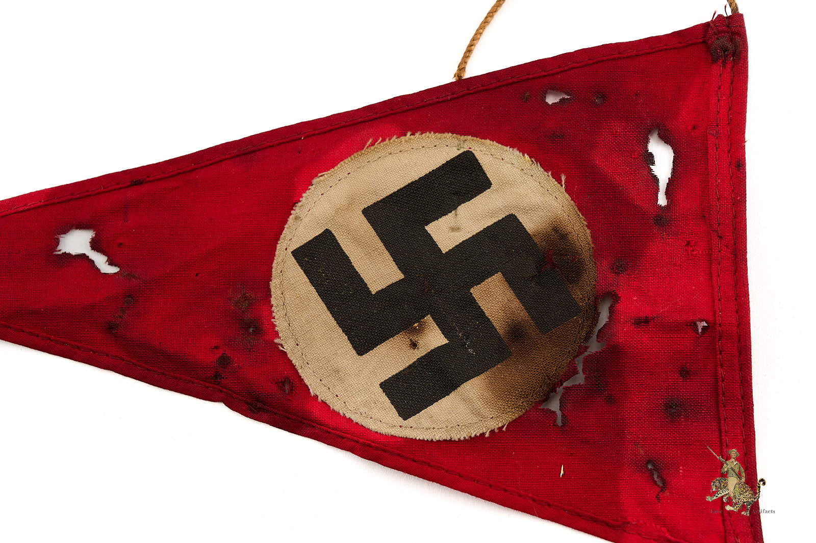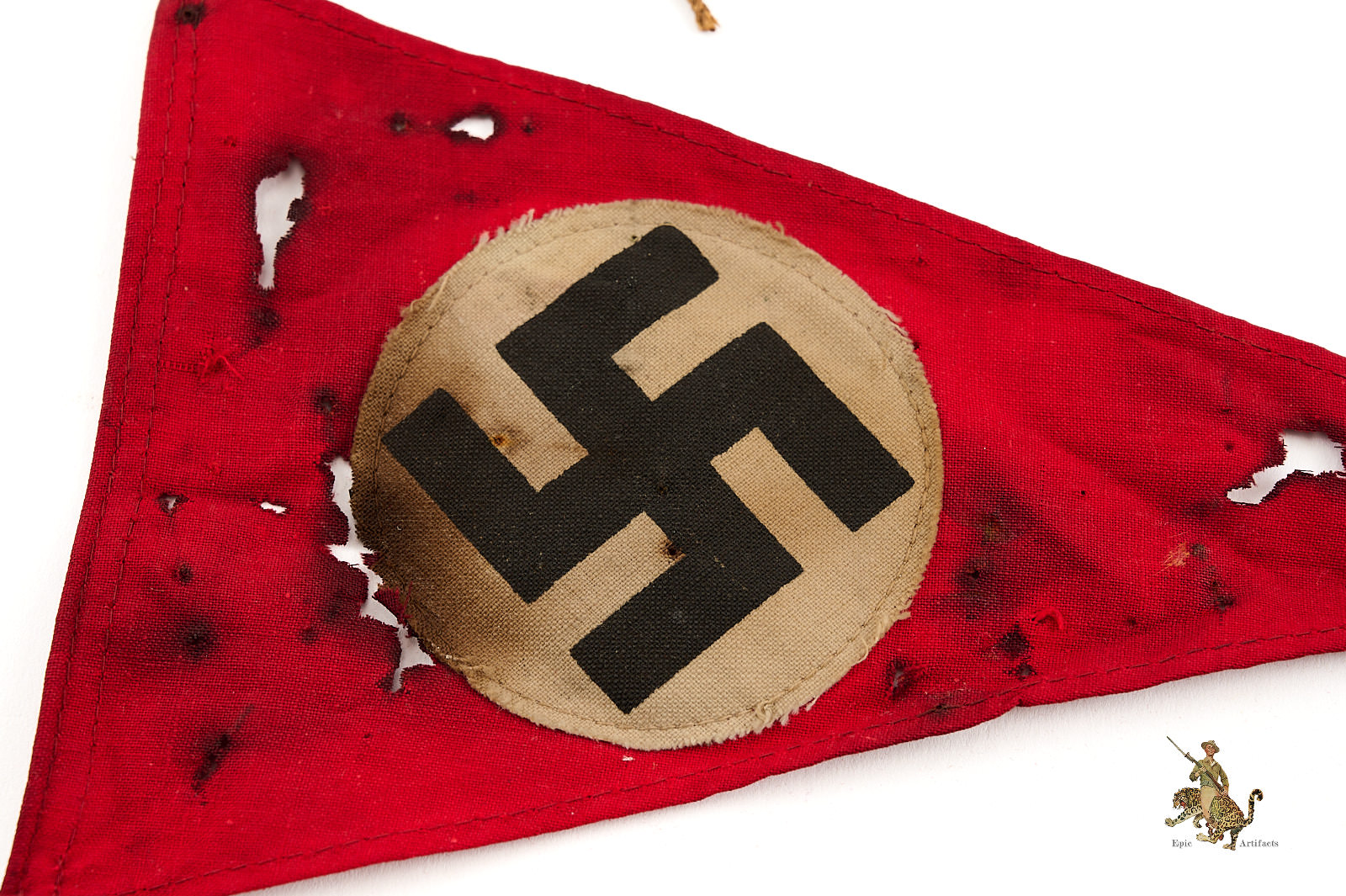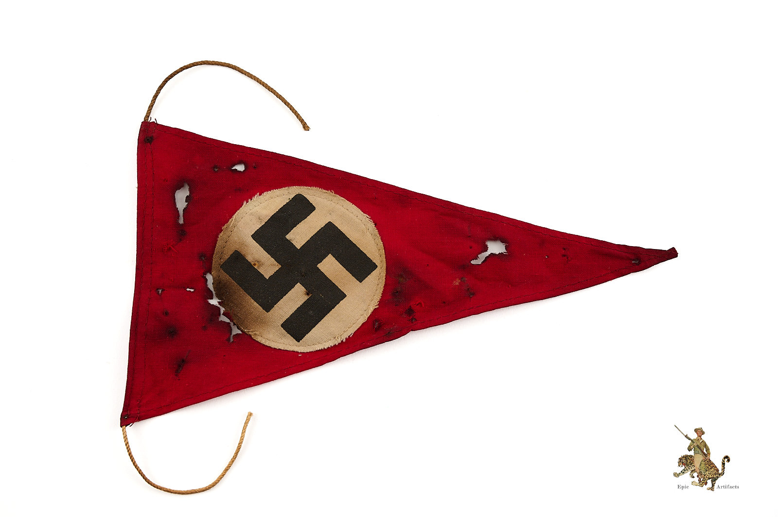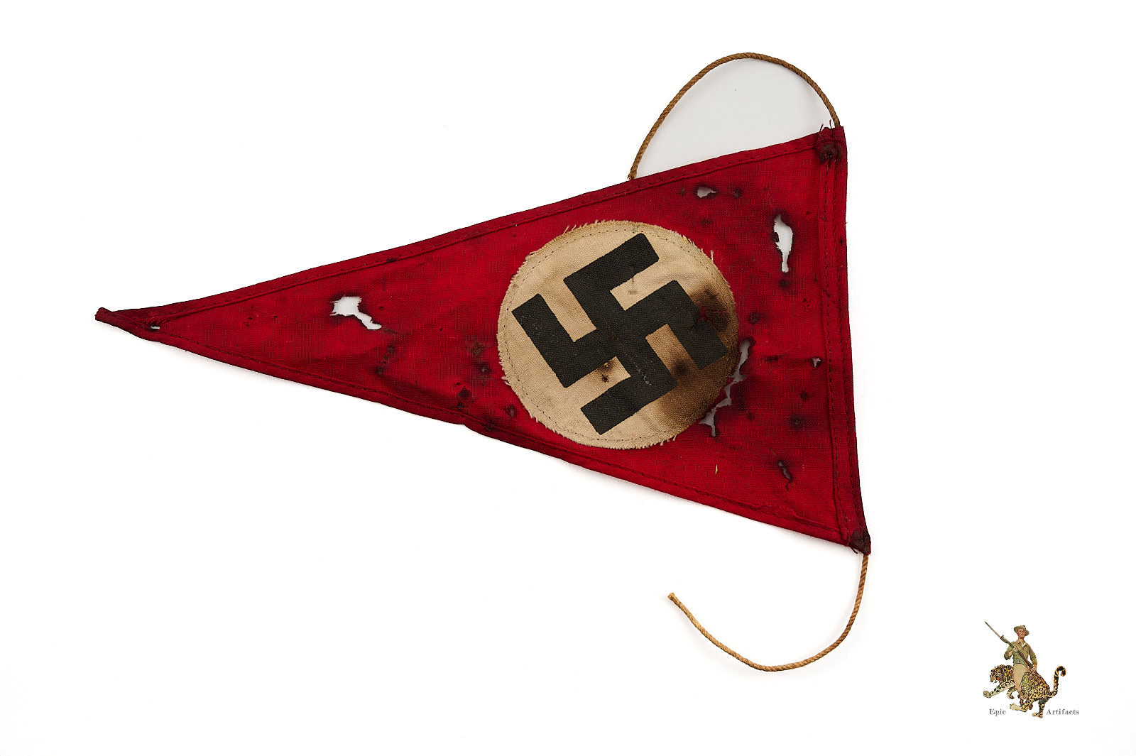 Product Description: This Mini NSDAP Pennant 5.5″ x 9.5″ is made of a typical, thin cotton fabric, which retains original red color. The edges are finished with machine stitching. The hoist end has a narrow rope extending beyond the corners of the pennant; this may have been one of a string of similar pennants, of the type used to decorate German streets during Nazi rallies and parades. Both sides of the pennant feature a machine stitched white fabric roundel with a printed black German swastika emblem. The fabric of this pennant shows staining and wear. Some sort of oil has stained this pennant throughout causing the fabric to break down and caused holes to present. This NSDAP Pennant is a nice displayable size, and makes for an eye-catching display object. It’s in good condition with notable flaws as stated.