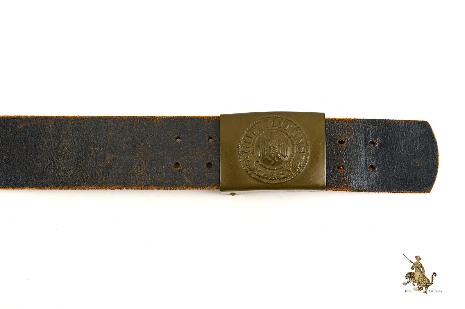 Historical Description: The belt buckle was an important part of the regalia worn by all uniformed military, civil, political, and paramilitary organizations during the Third Reich. The belt (“Koppel”) was part of the uniform and would always be worn while on duty. The belt buckle (“Koppelschloss”) was generally specific to each organization, with many organizations having separate belt buckles for officers and for enlisted personnel, sometimes with different colors and finishes to further denote specific purposes. The buckles were adorned with various mottos and designs specific to the organizations for which they were intended. Many designs used the German national eagle emblem, in a variety of forms. Belt buckles were worn with uniforms ranging from finely tailored officer parade uniforms, to the issue uniforms of enlisted soldiers in combat. Generally speaking, most German belt buckles of the Third Reich were made with two prongs on the reverse, to allow the buckle to be worn and adjusted on a belt. The buckle had a catch that would mate with a hook on the belt, when worn. The earliest Third Reich buckles were often made of brass, or nickel silver. Later, aluminum became very common, and was used on private purchase as well as enlisted buckles of the German military, with or without a painted or plated finish. After WWII began, most enlisted military buckles were steel. Nazi belt buckles were popular souvenirs for Allied troops who served in Europe. Some types were made by the millions and remain quite common today. Others were made in limited numbers and are very rare.