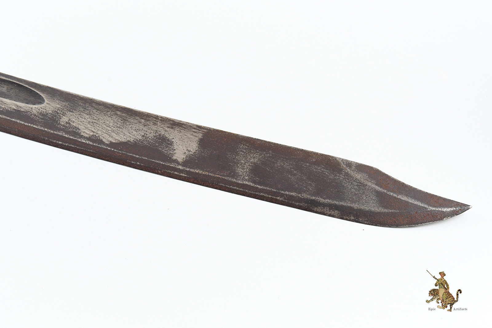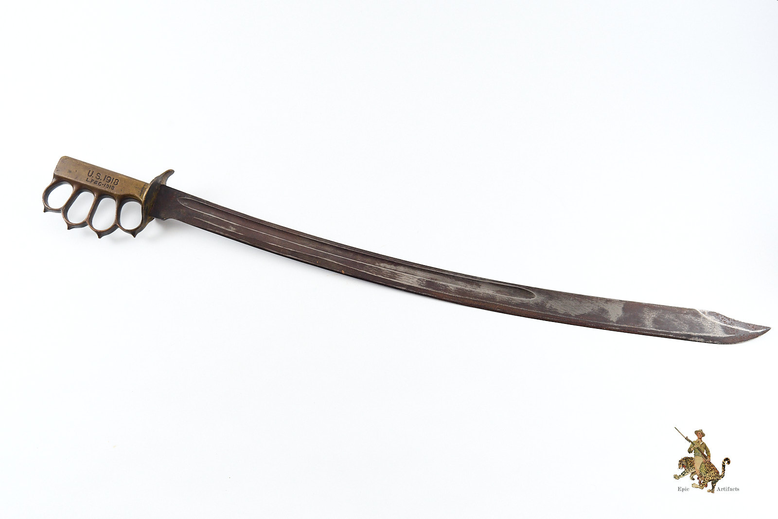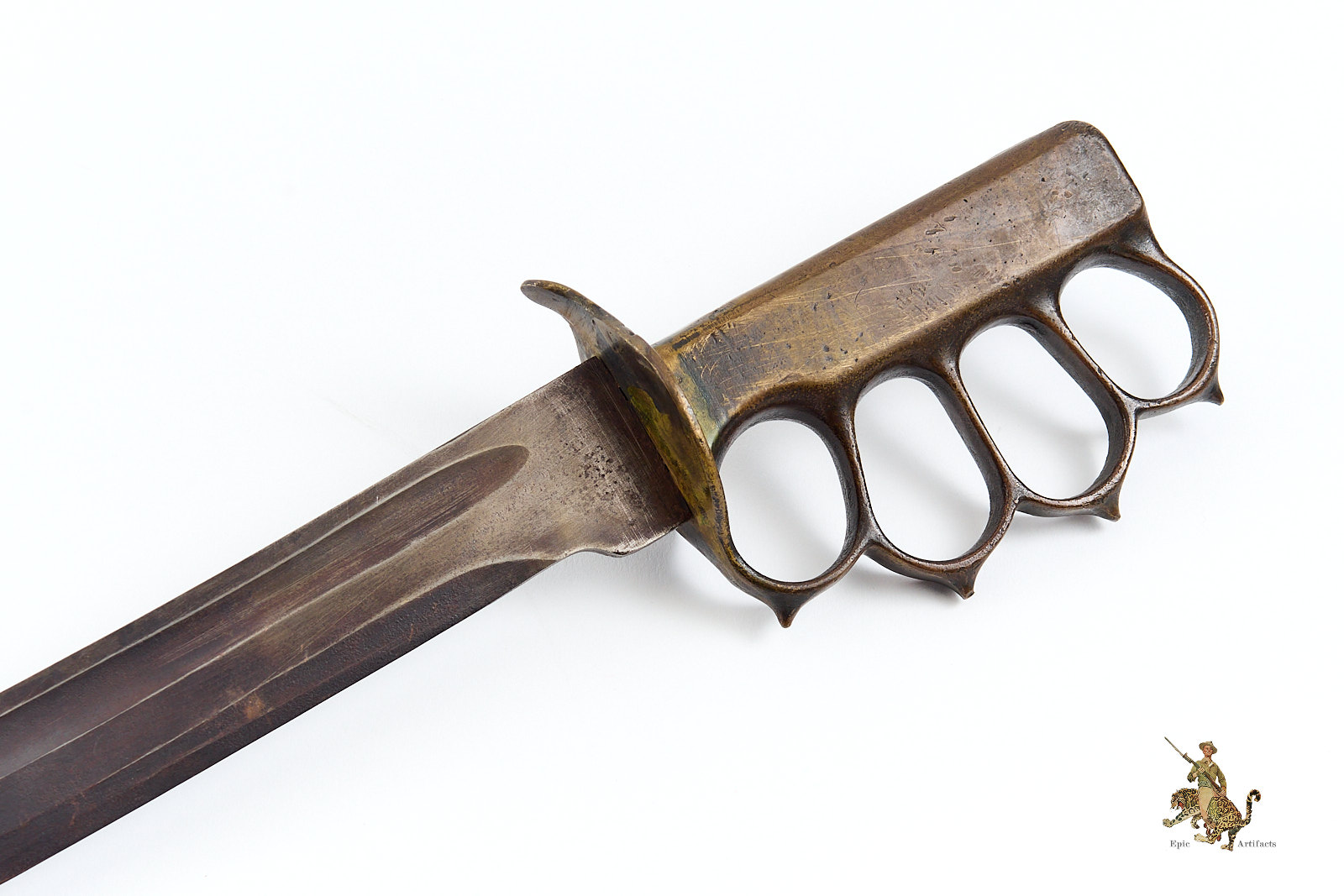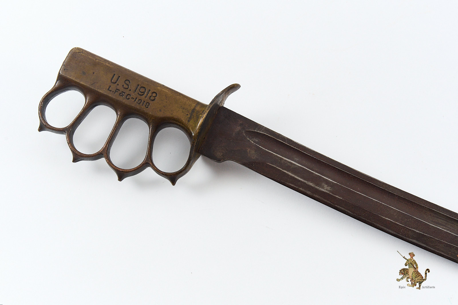Product Description:  An intriguing and highly individual example of wartime ingenuity, this M1918 Mk1 L.F.& C. Knuckle Duster Trench Art Sword represents a compelling fusion of standard-issue military equipment and trench art adaptation. The piece measures approximately 29.5 inches overall, with a 25-inch blade that exhibits visible corrosion and wear consistent with age and service, lending the surface a pleasing and even patina.