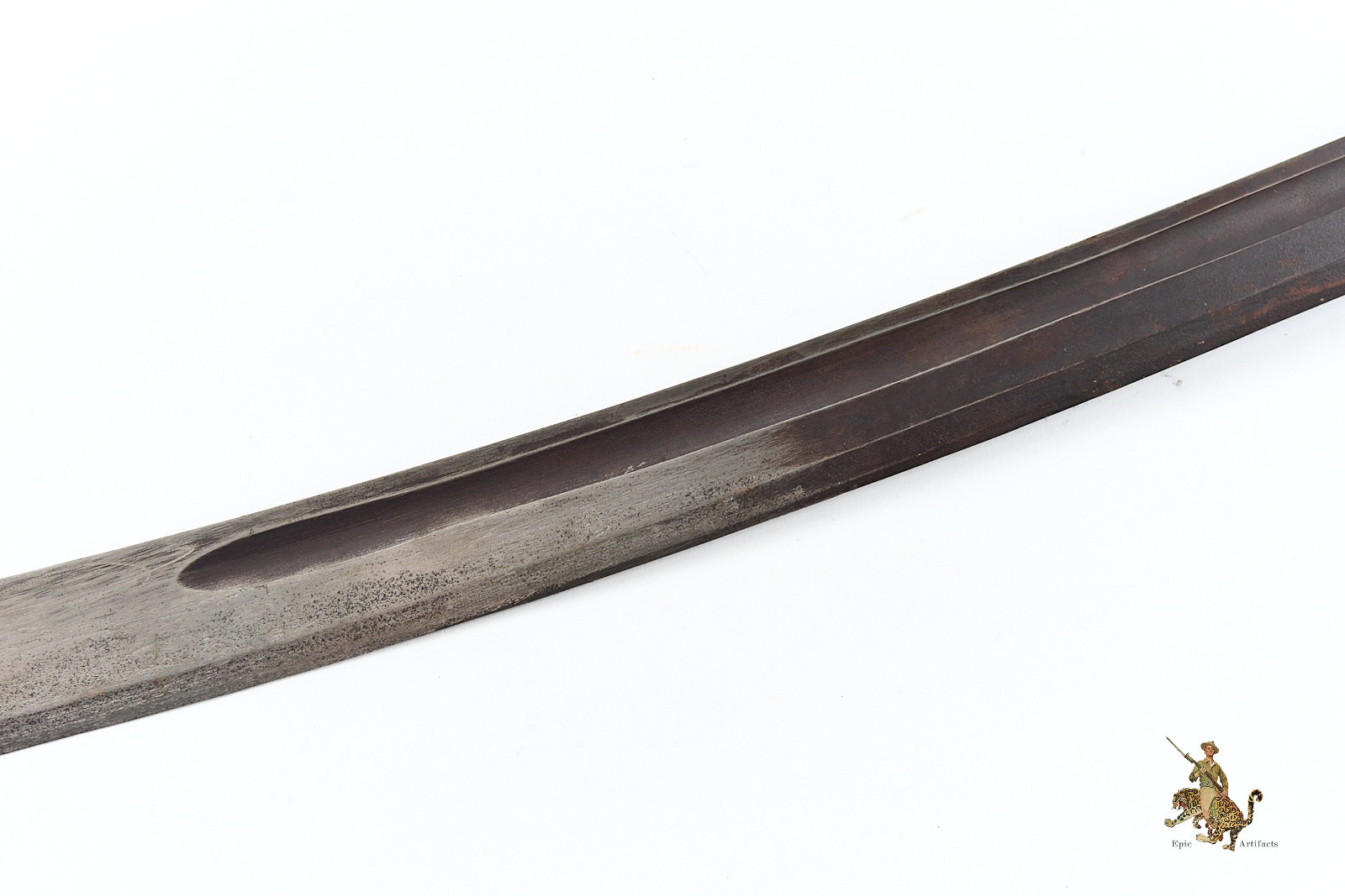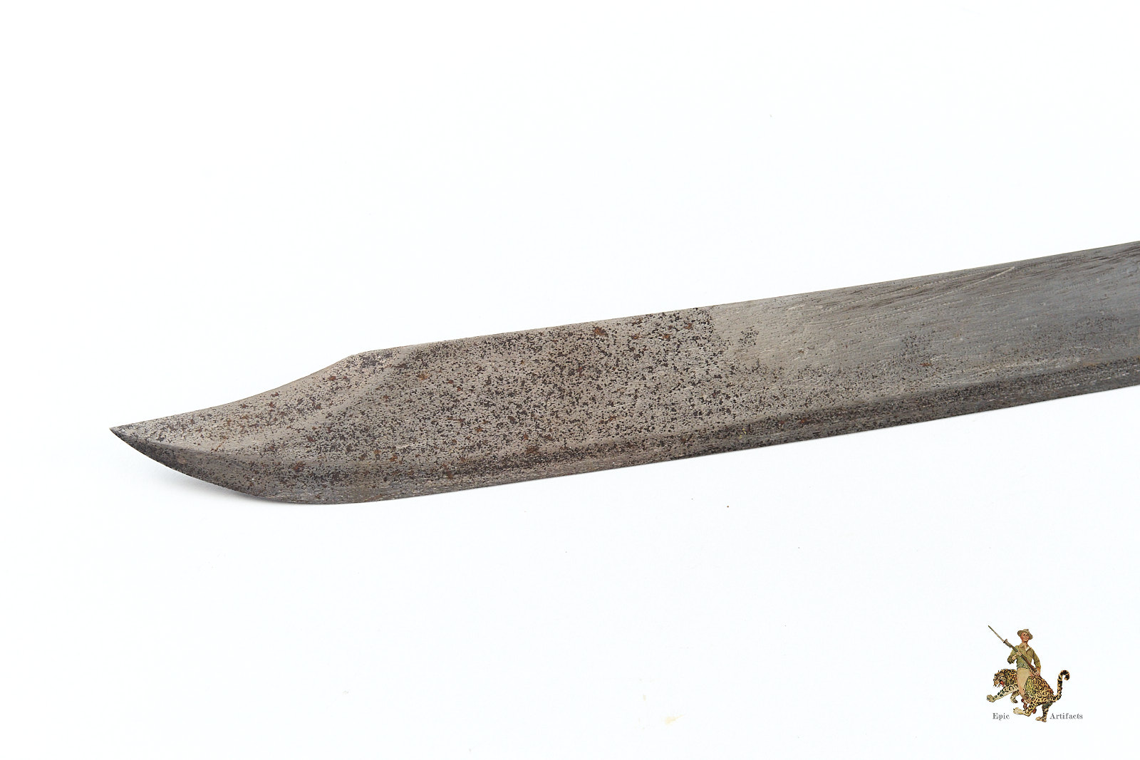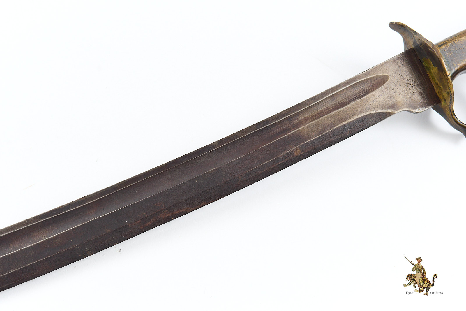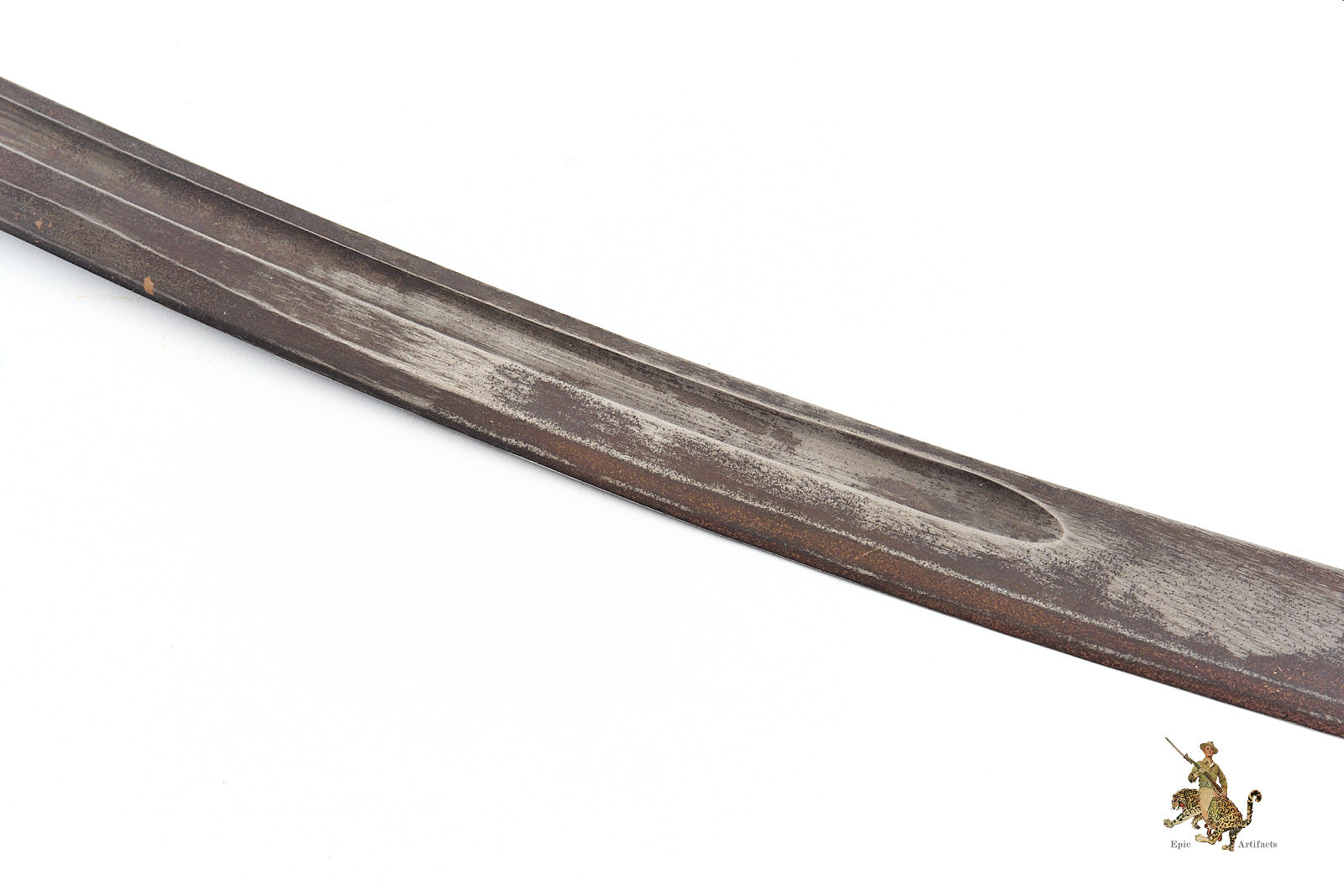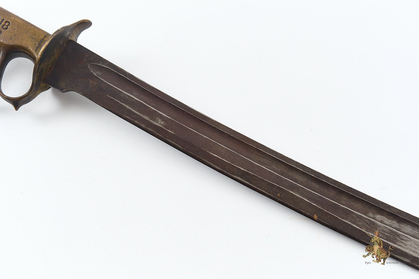 Product Description:  An intriguing and highly individual example of wartime ingenuity, this M1918 Mk1 L.F.& C. Knuckle Duster Trench Art Sword represents a compelling fusion of standard-issue military equipment and trench art adaptation. The piece measures approximately 29.5 inches overall, with a 25-inch blade that exhibits visible corrosion and wear consistent with age and service, lending the surface a pleasing and even patina.