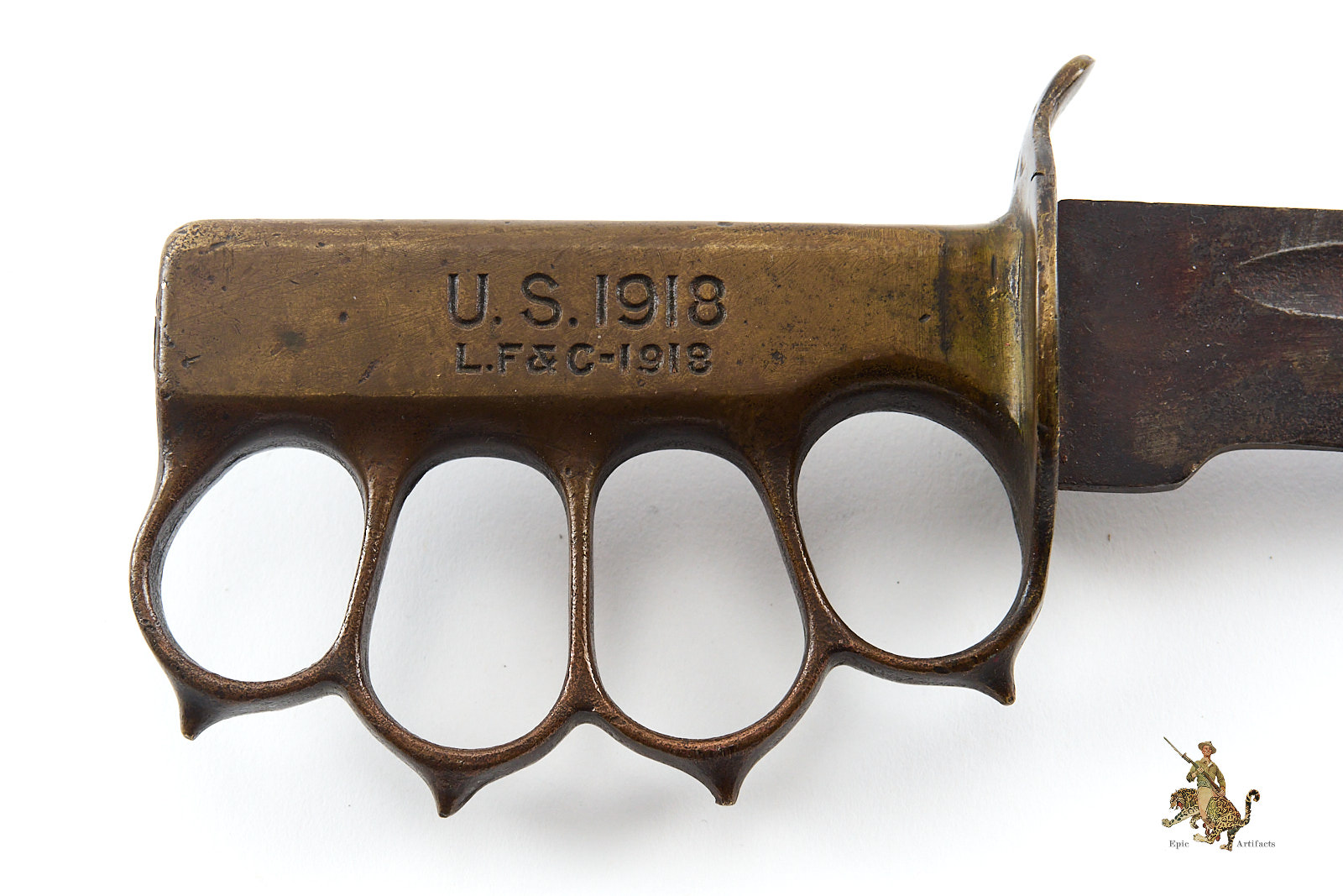 Historical Description: The first official U.S. trench knife adopted for service issue was the U.S. M1917 trench knife. It was designed by Henry Disston & Sons and based off examples of trench knives that were in service with the French Army at that time. The M1917 featured a triangular stiletto blade, wooden grip, metal knuckle guard, and a rounded pommel. The M1917 proved unsatisfactory in service, and a slightly improved version, the M1918, was adopted within months. Despite this, the M1918 is almost identical to the M1917, differing primarily in the construction and appearance of the knuckle guard. Usable only as stabbing weapons, the M1917 and M1918 frequently suffered broken blades. Their limited utility and general unpopularity caused the AEF to empanel a testing board in 1918, to test various trench knives and select a replacement.