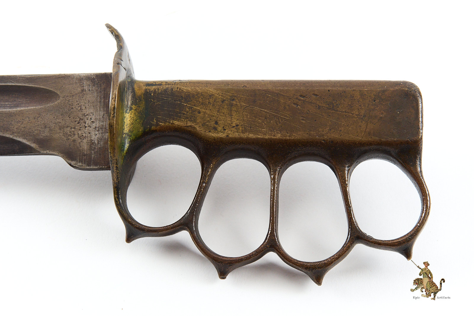 The blade has been affixed, likely by soldering or a comparable period method, to an original Mk1 L.F.& C. knuckle duster hilt, creating a striking and unconventional hybrid form. The absence of the end nut further underscores its improvised character.