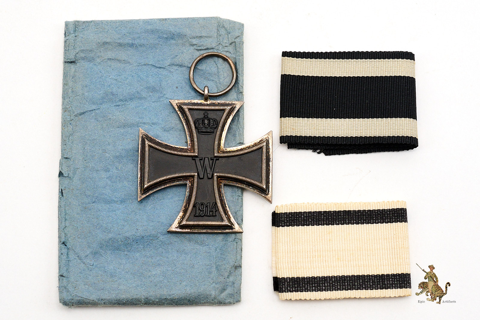 Product Description: This Non-Combatant Imperial EK2 is a nice and very attractive example of a relatively scarce Iron Cross variant. The cross has a great look, with virtually all of the original, factory applied black paint still intact on the iron core. The core paint has slight luster and still looks as it did when it was new. The frame features crisp and well-defined beading, with no evident wear. The frame has light, even age patina, with smooth surfaces and typical darkening. The suspension ring is intact, with even toning that matches the frame, and is stamped with the maker mark. This set comes with both the standard and Non-Combatant ribbon, which is the less commonly seen non-combatant style with a broad white central stripe. The ribbon is crisp and clean, with slight, normal age toning to the white fibers. This set also comes with its original packet which is a nice bonus. This Non-Combatant Imperial EK2 is a handsome award, that remains in excellent + condition.