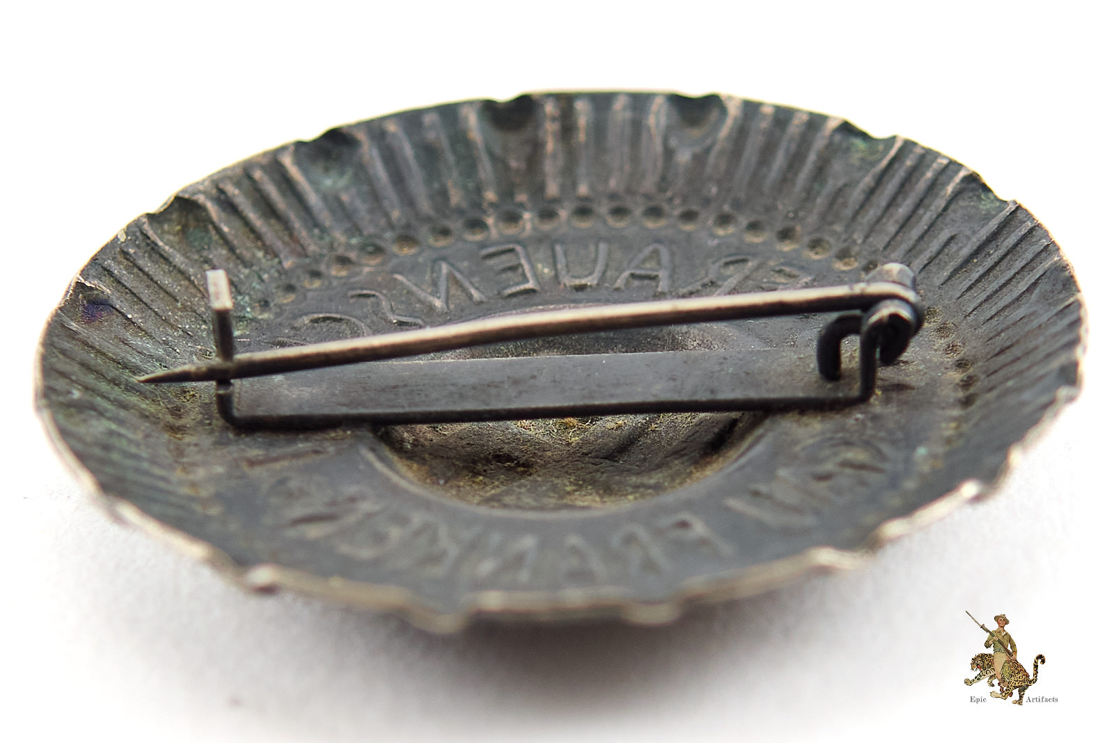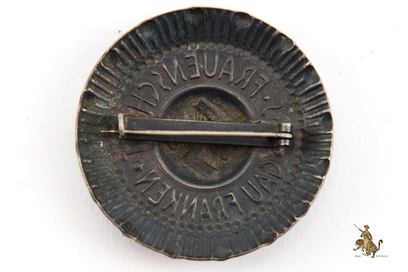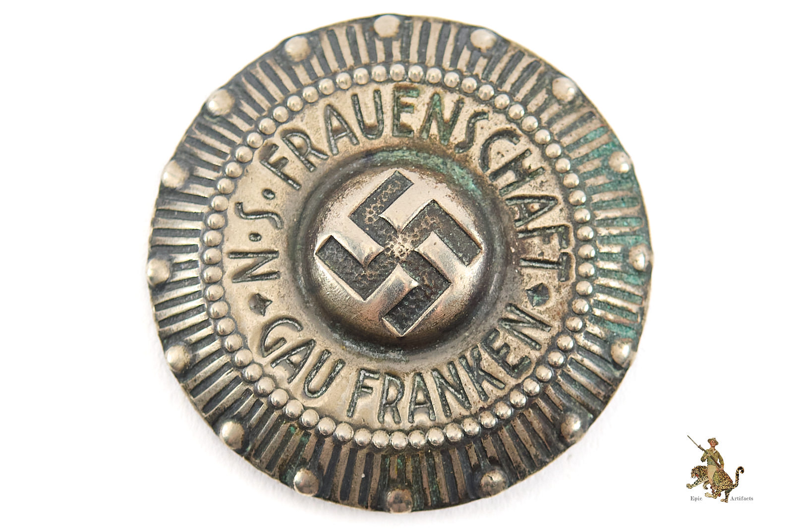 Product Description:  An N.S. Frauenschaft Gau Franken Brooch (Nazi Women’s League Badge), a well-preserved original example of organizational insignia from the Third Reich period. The piece retains its original pin and catch, both in good working order, and bears no maker’s mark. The finish remains bright with only minimal signs of handling or age. Overall, this N.S. Frauenschaft Gau Franken Brooch is in excellent plus condition, representing a fine and authentic example of National Socialist women’s association regalia.
