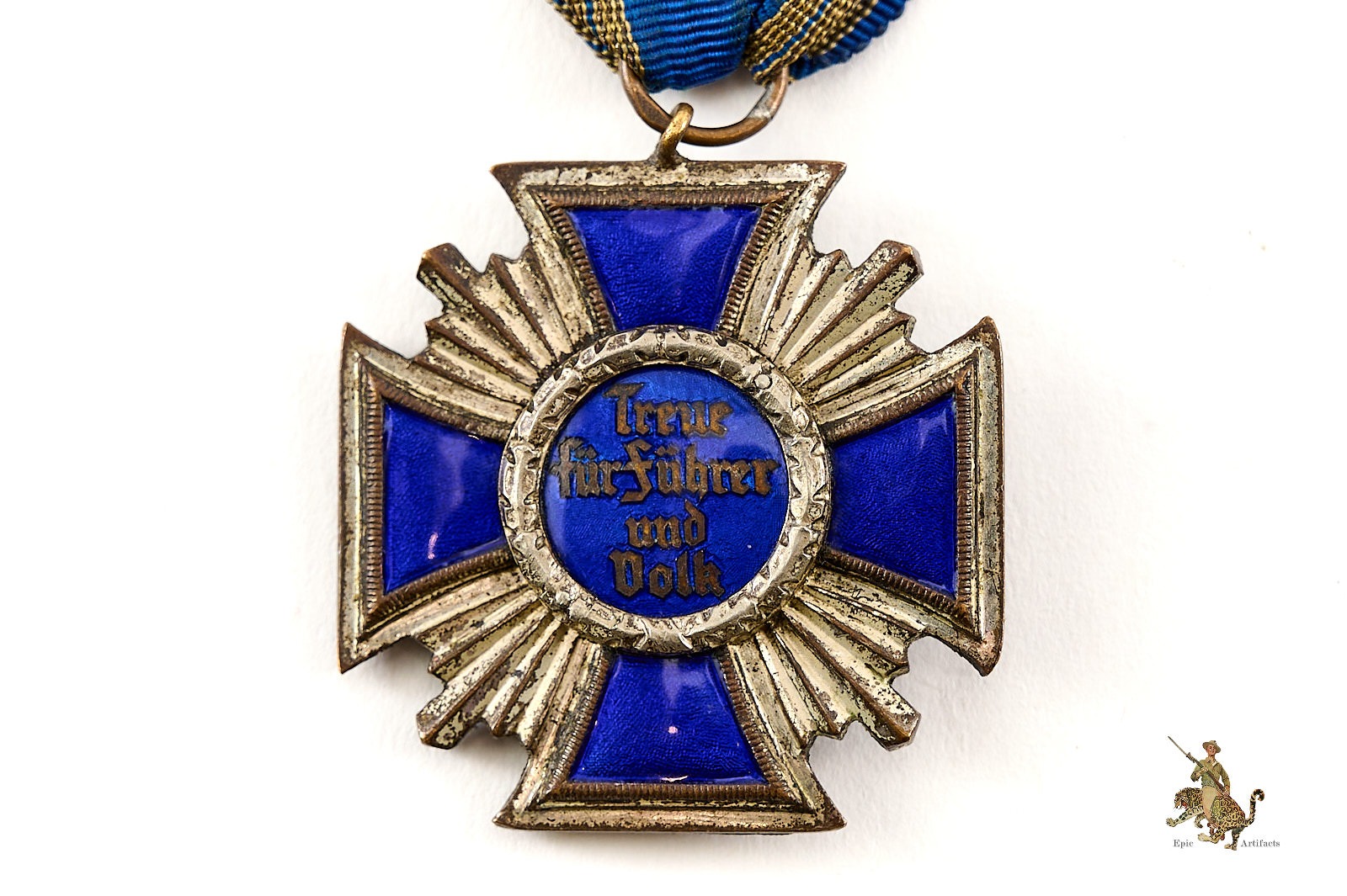 Historical Description: Prior to WWII, the German military and civil authorities instituted a wide range of Long Service Awards to reward personnel for years of service. These awards were used by all branches of the German military, as well as civil and political organizations such as the police, the customs service, and the National Labor Service (RAD). There was also a general Long Service Award for civil service. Each of these awards was issued in the form of a medal that was suspended from a cornflower blue ribbon. Many of these were made in different grades denoting a specific number of years of service. They were worn on the uniform in the form of ribbon or medal bars, and up to two long service awards could be worn at the same time. In most cases, a device affixed to the ribbon bar would denote for which service the award had been issued; sometimes the medals themselves had devices on the ribbons, either in the form of pinned-on metal emblems, or else hand or machine embroidery applied drectly to the ribbon. Some German Long Service Awards were very widely awarded, others were made and issued only in small numbers.