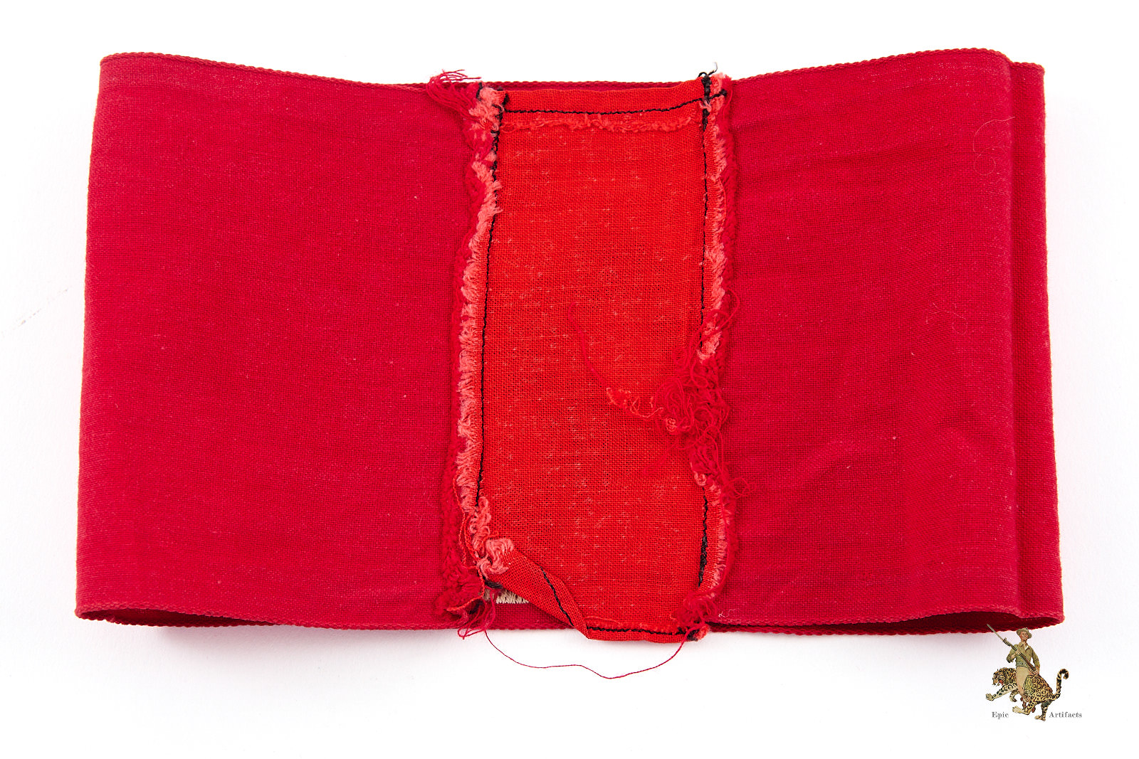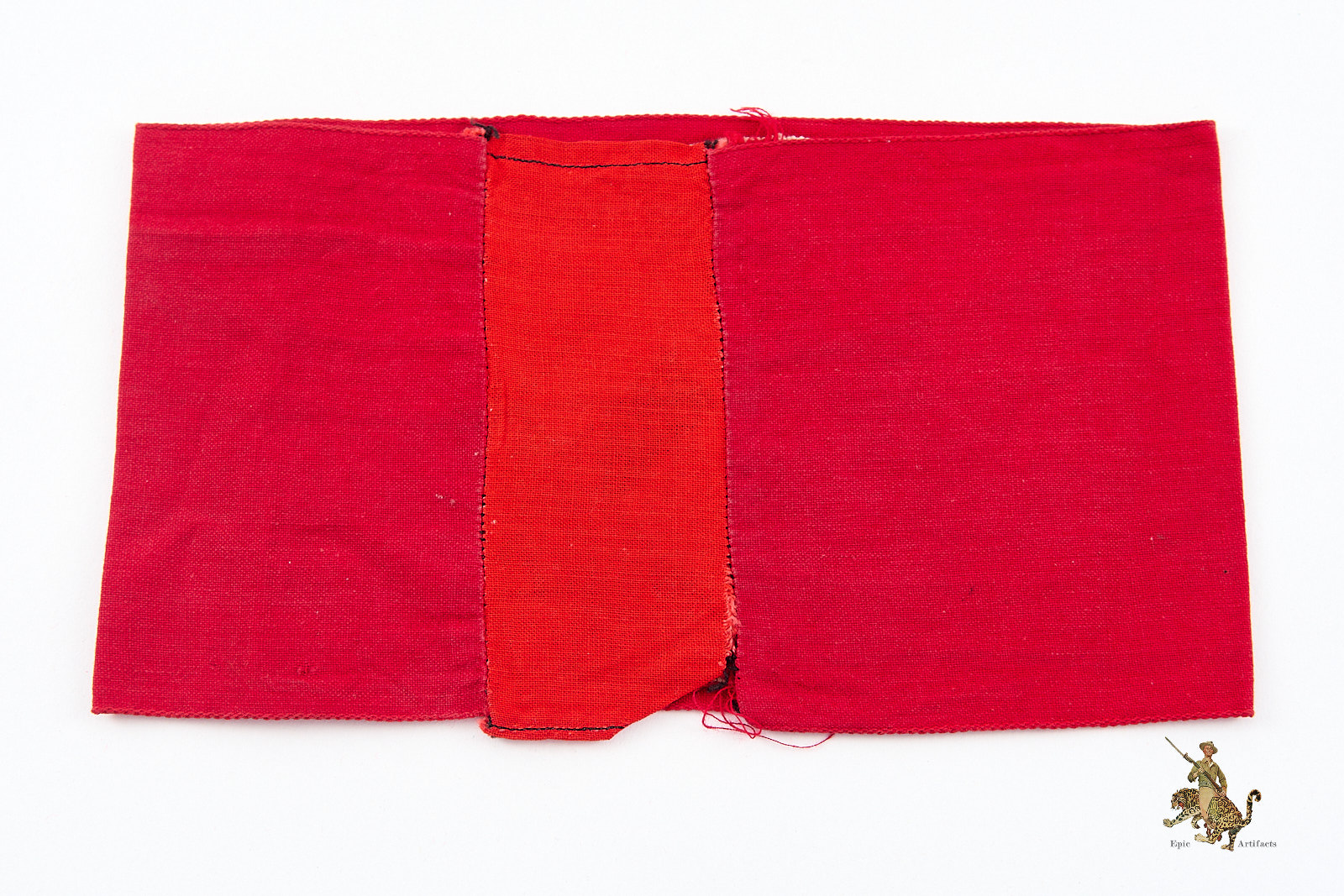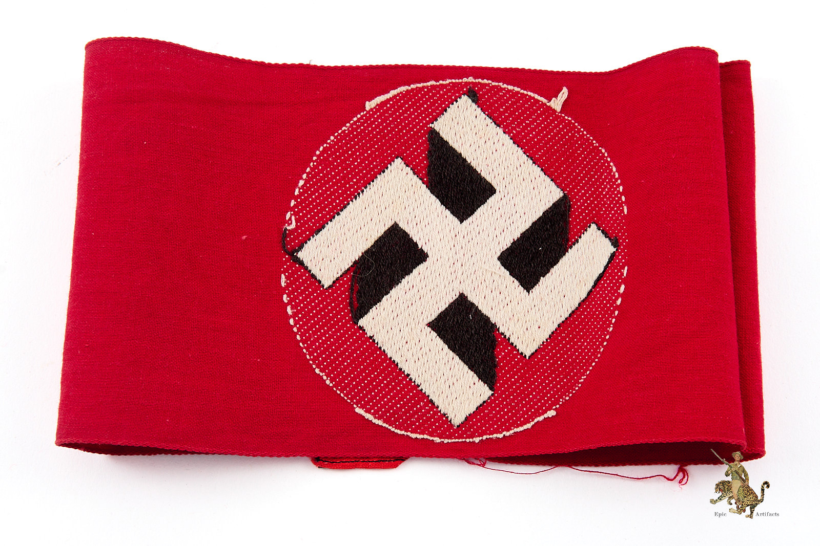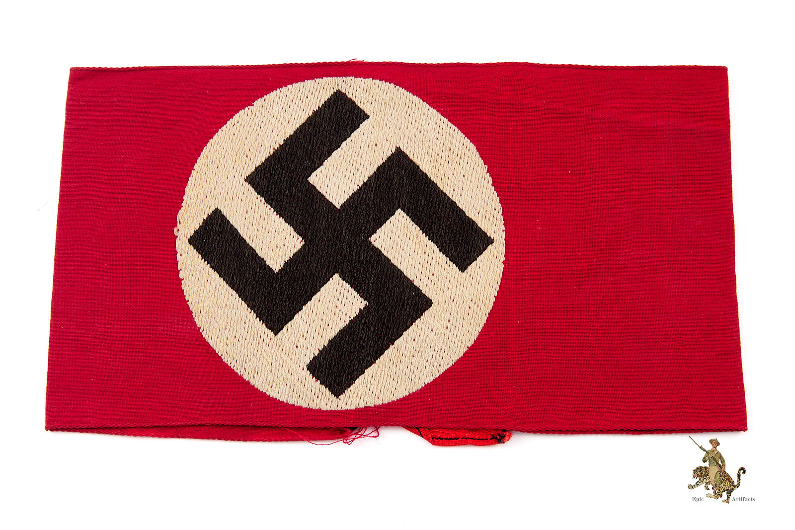 Product Description: This is an outstanding example of an NSDAP Bevo Armband – Multipiece. This pattern of NSDAP armband was machine woven as a single piece of fabric. The red cotton backing fabric of the woven emblem forms the body of the armband. The front of this attractive armband features a perfectly woven white roundel with black swastika. It’s fresh and pristine, with colors that remain as bright as they were when new. The short edges of this armband should be factory machine sewn together in the reverse, as this would have been when issued, but there has been an additional piece of fabric added to lengthen the overall diameter to fit a larger sleeve. The fabric is crisp and clean throughout, with minor soiling from age and wear. This NSDAP Bevo Armband rates in excellent condition.