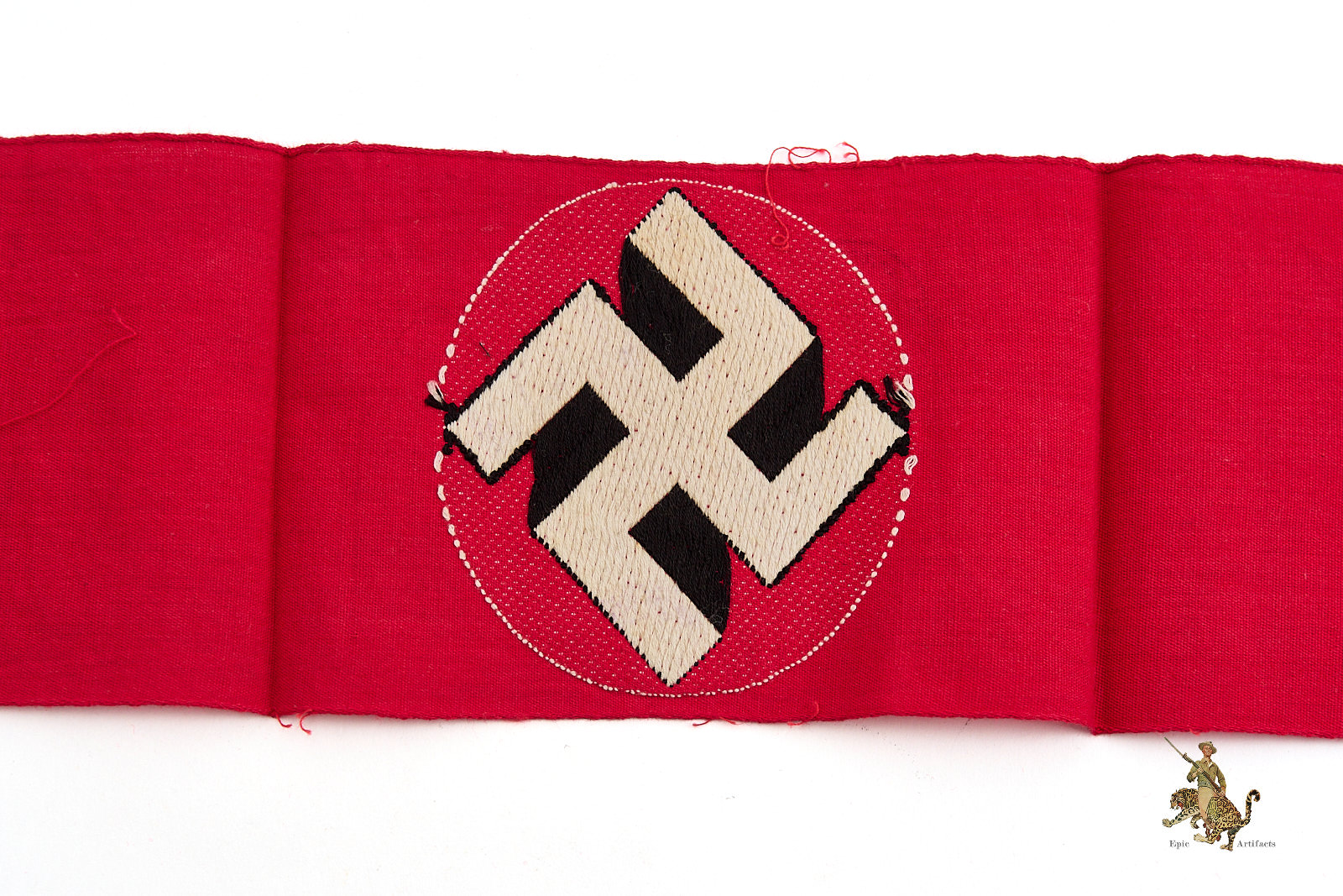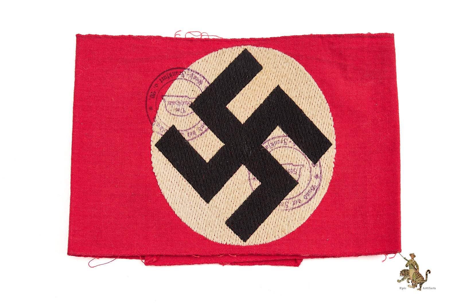 The armband is produced on a red cotton backing that serves as the foundation for the finely executed woven central roundel. The white disk and black swastika are sharply rendered through the BeVo weaving process, with crisp definition and vibrant, well-preserved colors that remain striking to the eye. Two clear and fully legible ink acceptance stamps appear along the center of the armband, further confirming its period issue.
