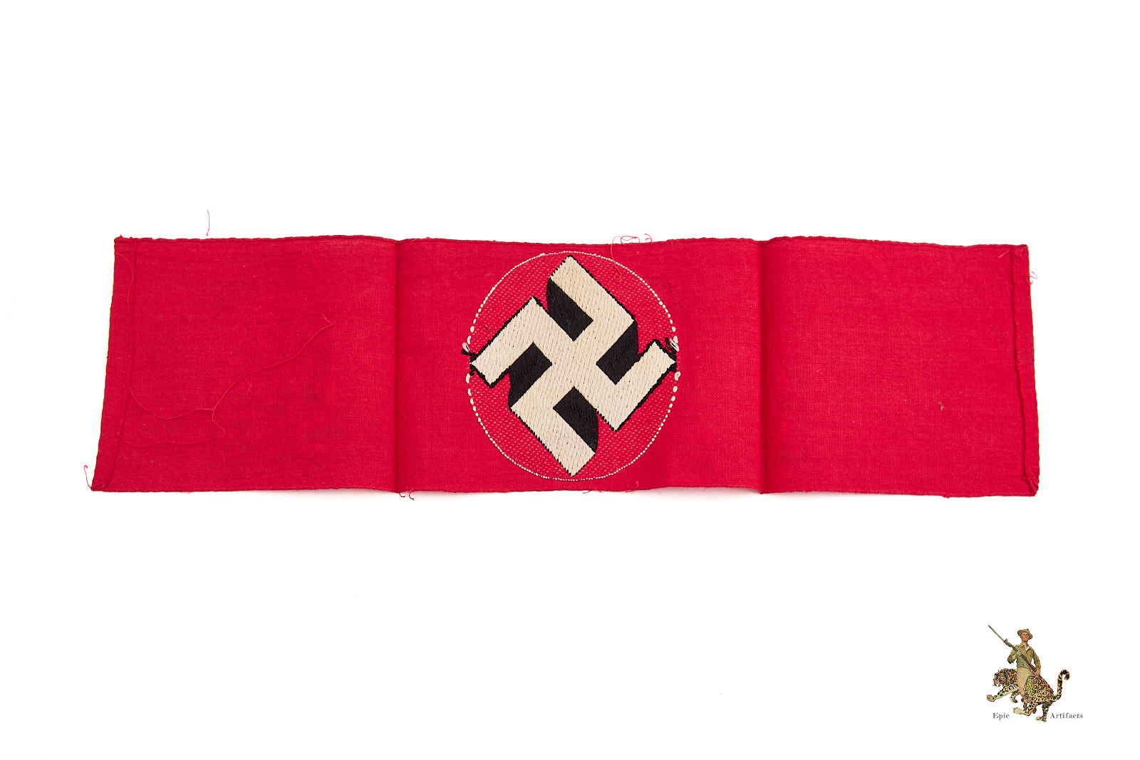 Historical Description: Nearly every military, civil, political, and paramilitary organization in existence during the Third Reich used armbands. Armbands were worn on military and civilian uniforms and also on civilian clothes, from suit jackets to work clothing. They were used to denote membership in organizations, to indicate a specific role or function of the bearer, and as insignia of rank. Many organizations would change the design of their armbands over time, which added to the variety produced. These were manufactured in countless variations, ranging from simple printed bands to elaborately hand-embroidered pieces of the highest quality. Some Nazi armbands were worn by all members of large organizations and were made by the millions. Others were intended for use at a specific time and place and were unique. Many types were made in very limited numbers. Some bore metal insignia or special identifiers that indicated the wearer’s rank, unit affiliation, or nationality. Armbands were sometimes but not always marked with ink stamps by the issuing authorities.