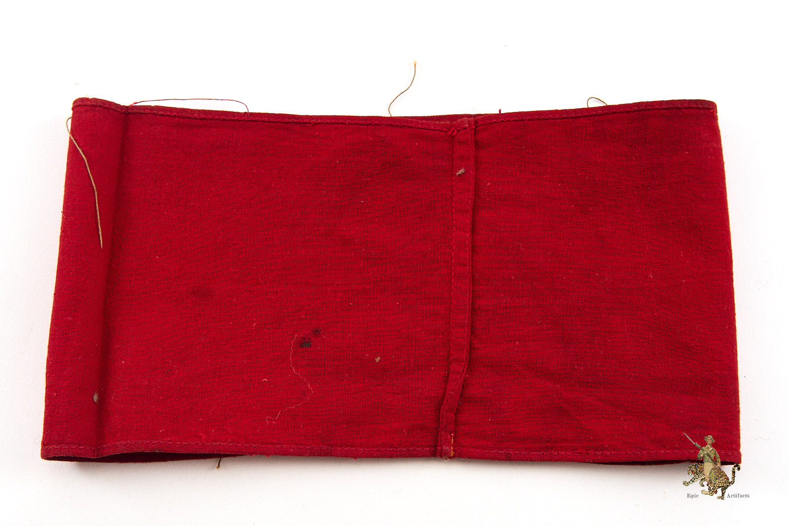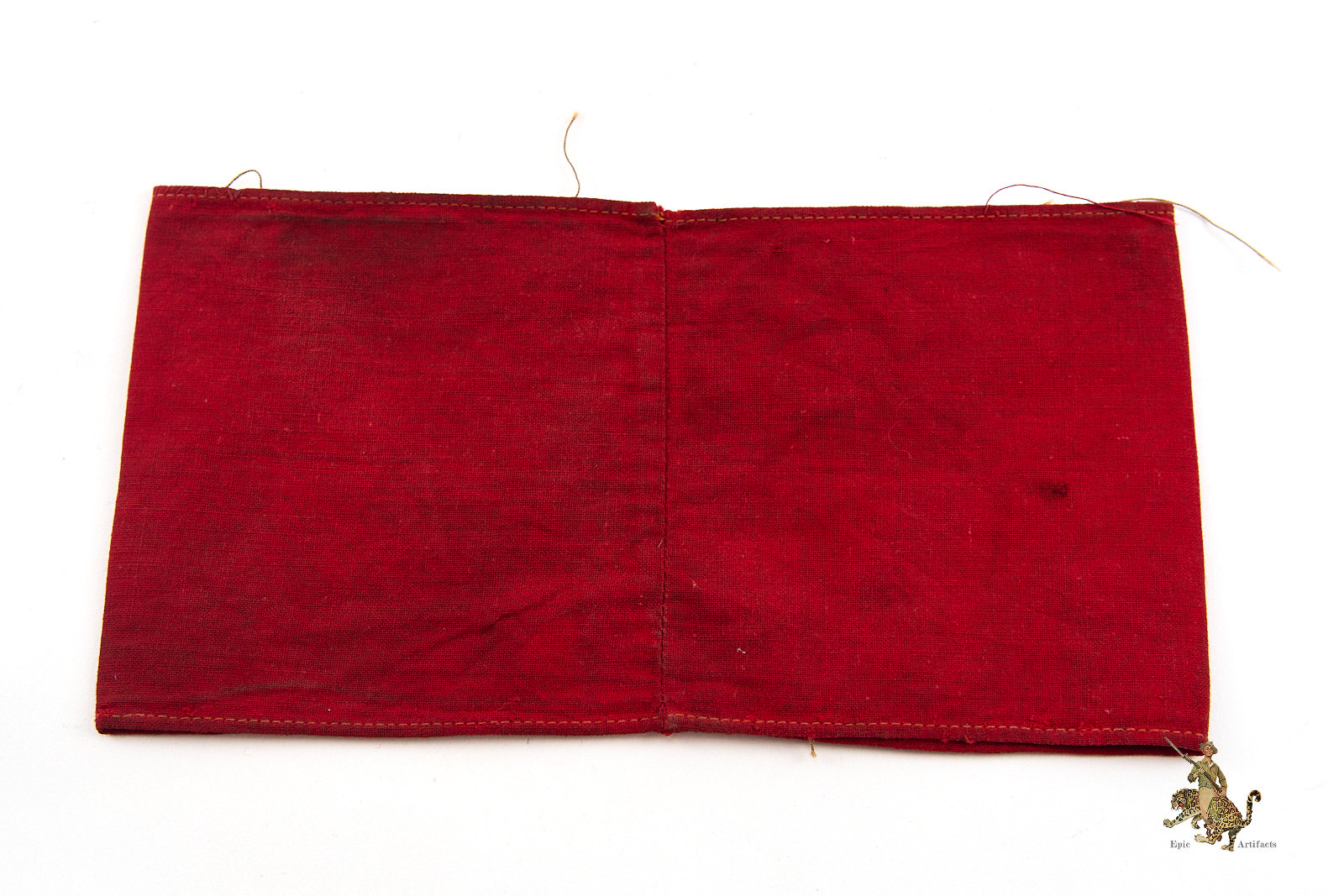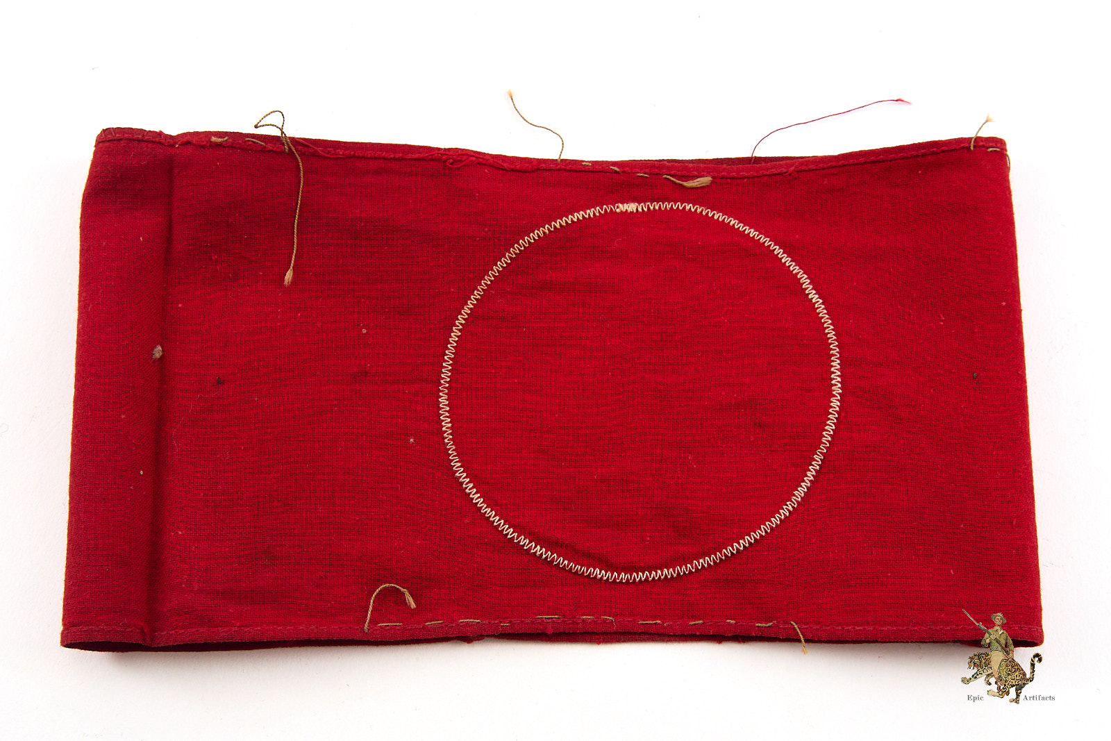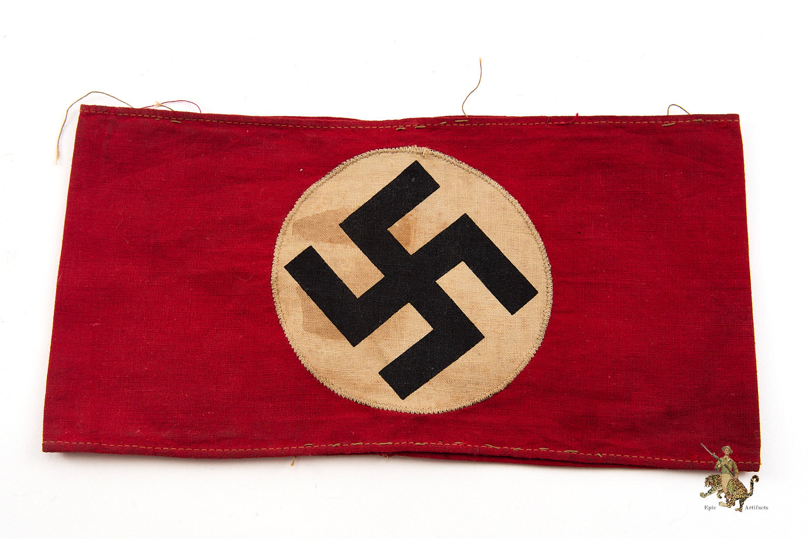 Product Description: A well-preserved example of the NSDAP Cotton 2-Piece Printed Armband, removed from its original tunic and retaining visible thread remnants consistent with prior attachment to the sleeve. The printed roundel, separately applied, is secured by zig-zag stitching, as typically encountered on period examples. The top and bottom edges are neatly machine stitched, with the ends folded over and finished with machine stitching. The cotton exhibits honest field wear, including discoloration and surface rubs, with no holes or tears observed. Overall condition reflects careful use rather than damage. An excellent field-worn example of the NSDAP Cotton 2-Piece Printed Armband, notable for its integrity and clarity of printed detail.