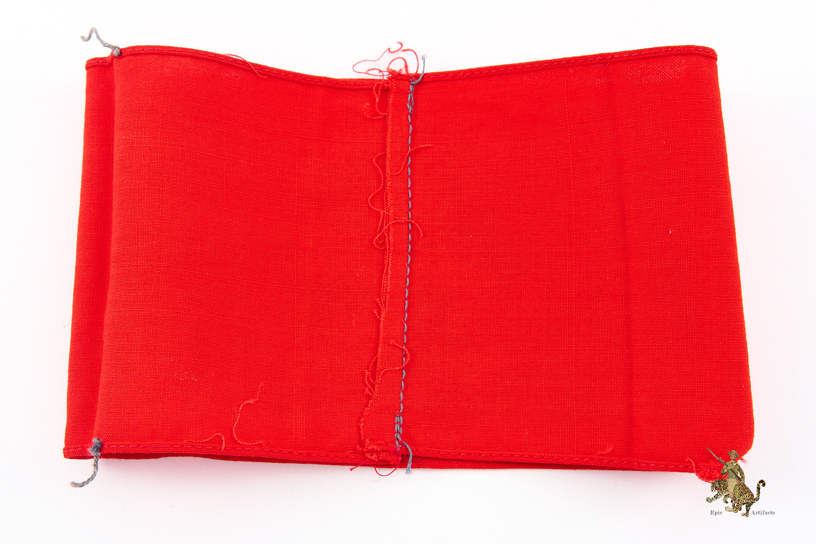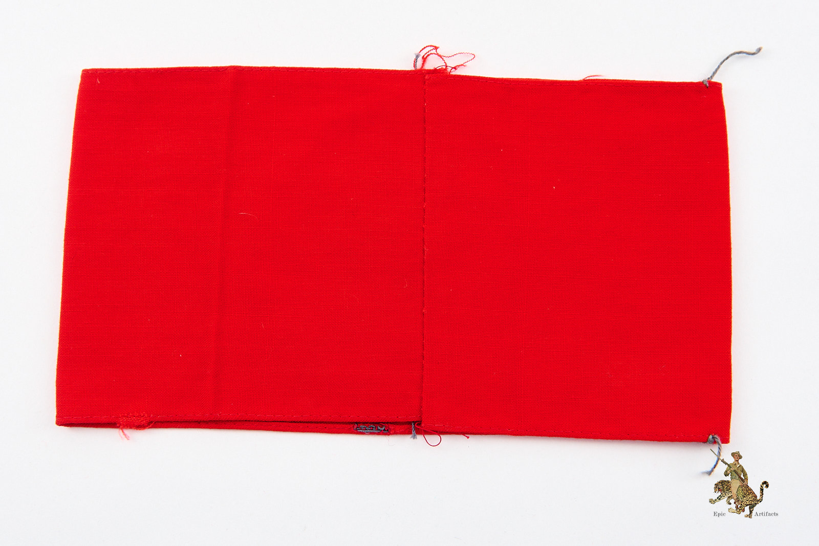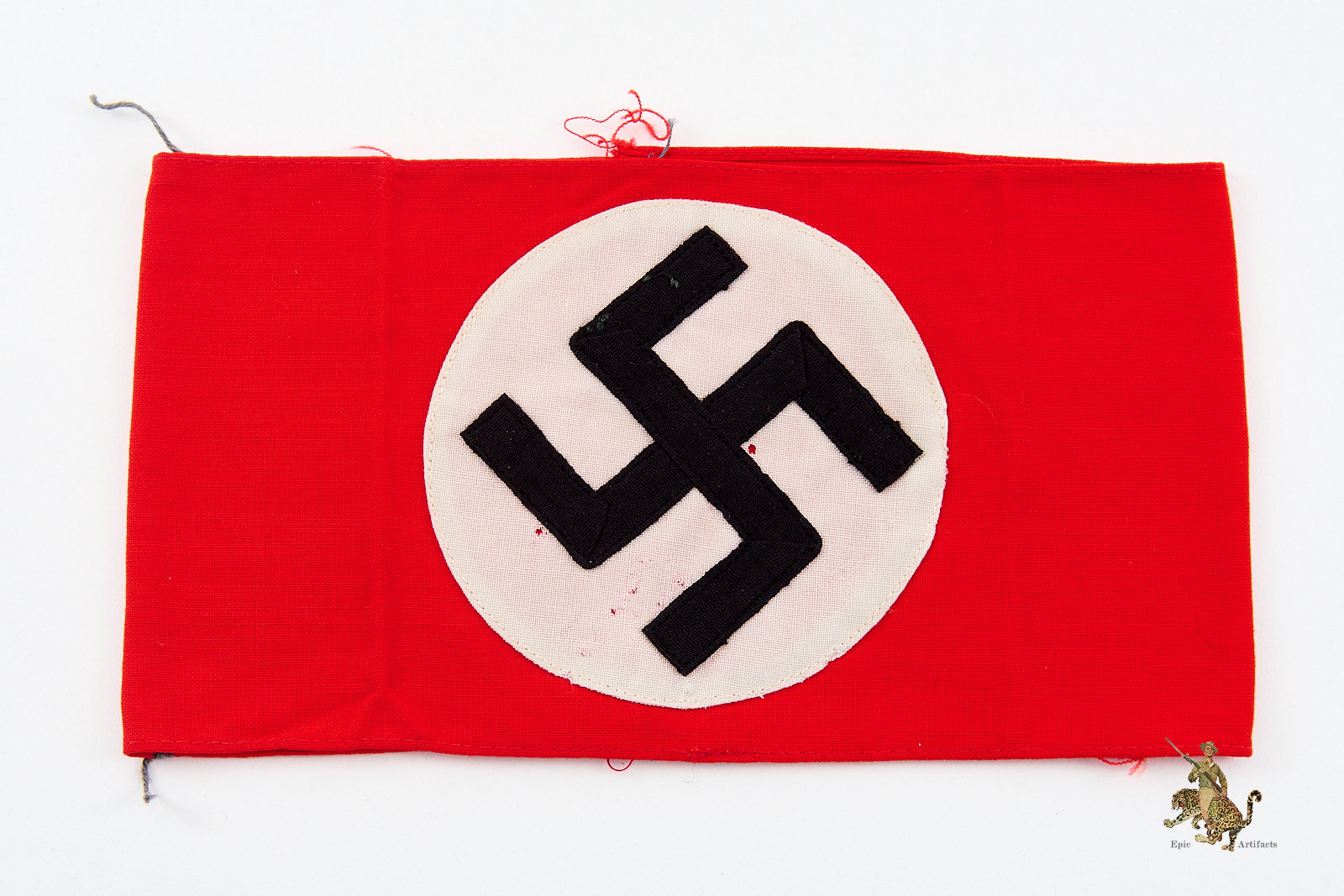 Product Description: An original NSDAP Cotton 3 Piece Armband – RZM Tag – Tunic Removed, presented as a strong and representative example displaying clear evidence of authentic period use. Constructed of red polished cotton, the armband features a separately applied white cotton roundel bearing a precisely formed black cotton swastika, each element neatly machine-stitched to the body in the characteristic manner of regulation manufacture.