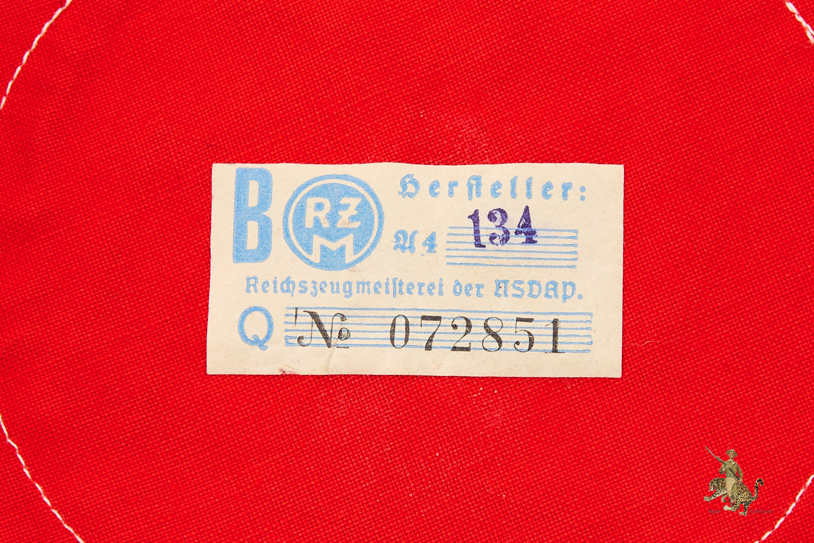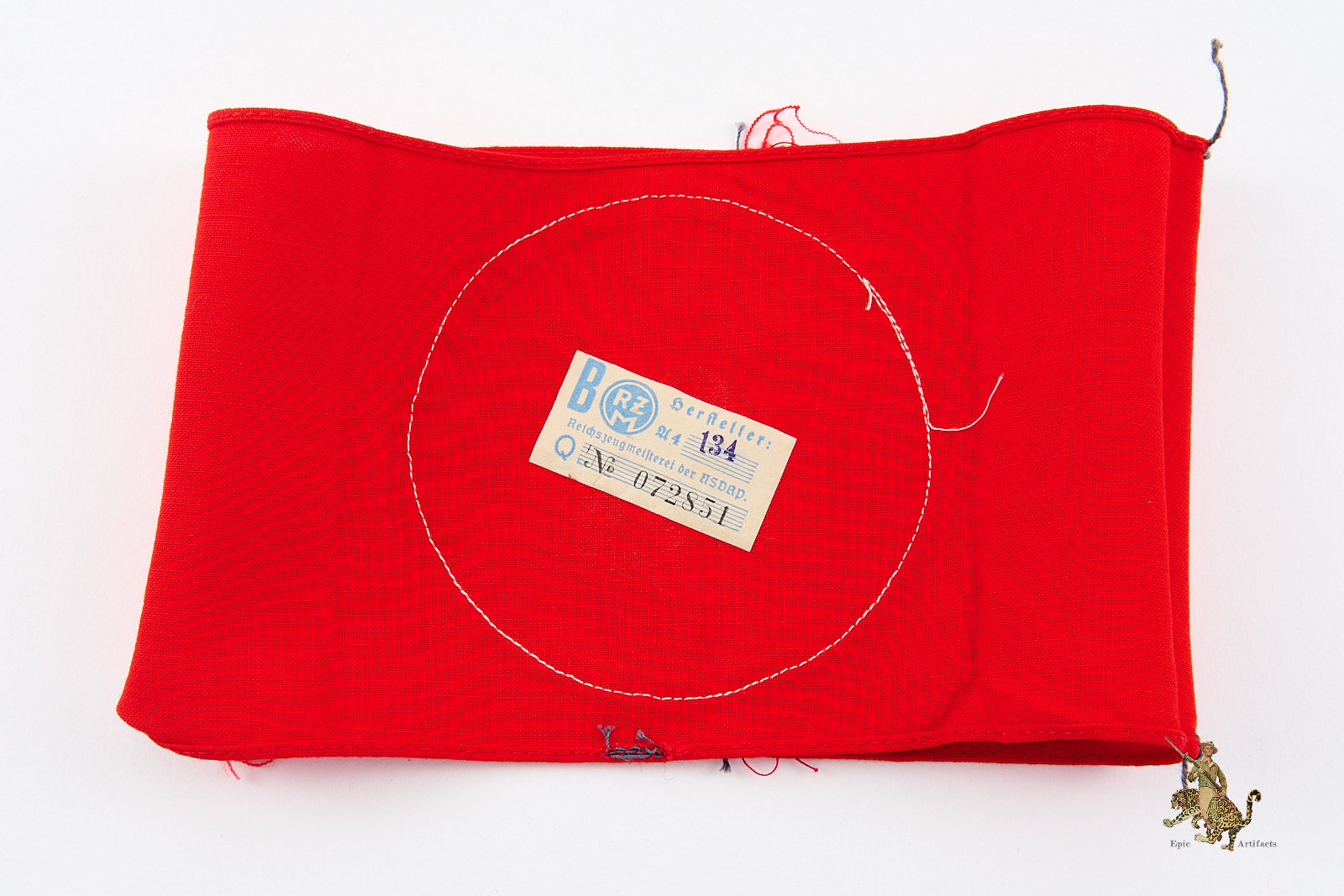 The upper and lower edges remain cleanly finished, while the ends are neatly sewn together. A few loose threads remain at top and bottom of armband, consistent with removal from a tunic. An RZM tag is present on the reverse, marked with maker code A4/134, further supporting its period production.
