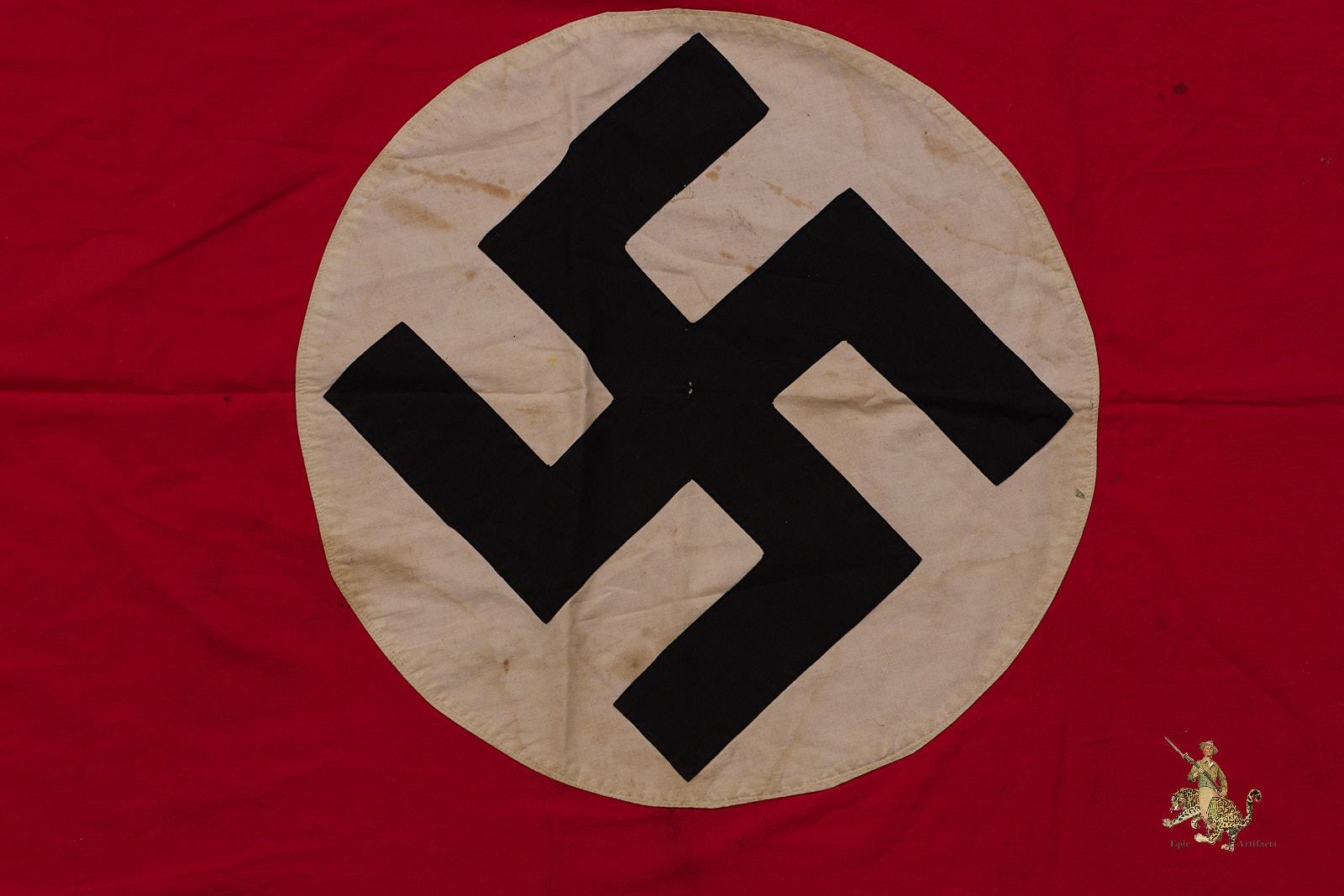 Historical Description: The red flag with white central disk and black swastika was introduced by Hitler in the 1920s as the flag of the National Socialist political party. In 1933, shortly after the Nazis took power, this party flag was recognized alongside the black-white-red Imperial tricolor as one of Germany’s national flags. In 1935, the use of the tricolor flag was discontinued, and between September 1935 and May 8, 1945, the Nazi party flag was the sole national flag of Germany. From its creation in the 1920s through the end of the war, this swastika flag was made and used in endless variations, from the massive banners hung at Party Day rallies to small pennants, bunting flags, and hand-held paper flags distributed along parade routes. These flags, banners and pennants flew from ships, were hung from official and private buildings, and were displayed outside business and private homes. At the end of WWII, the Allied military governments abolished the use of all Nazi symbols, including the national flag. Most Third Reich era German national flags were simply destroyed.