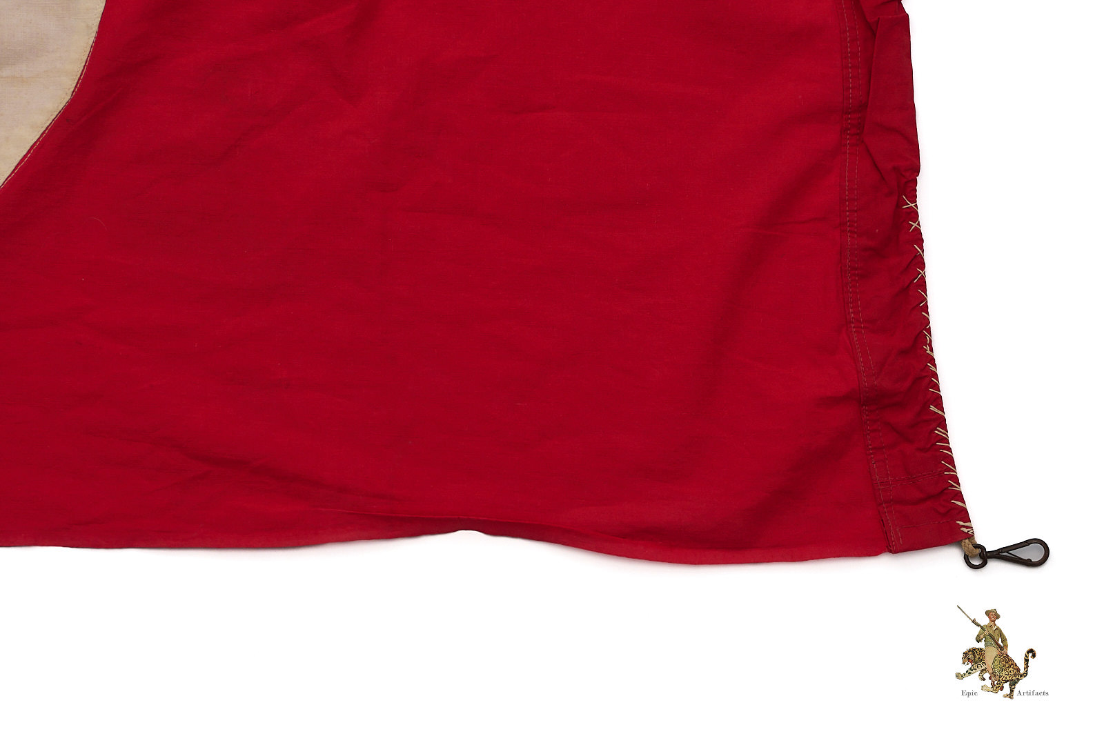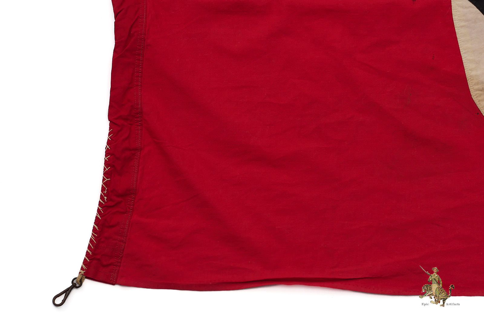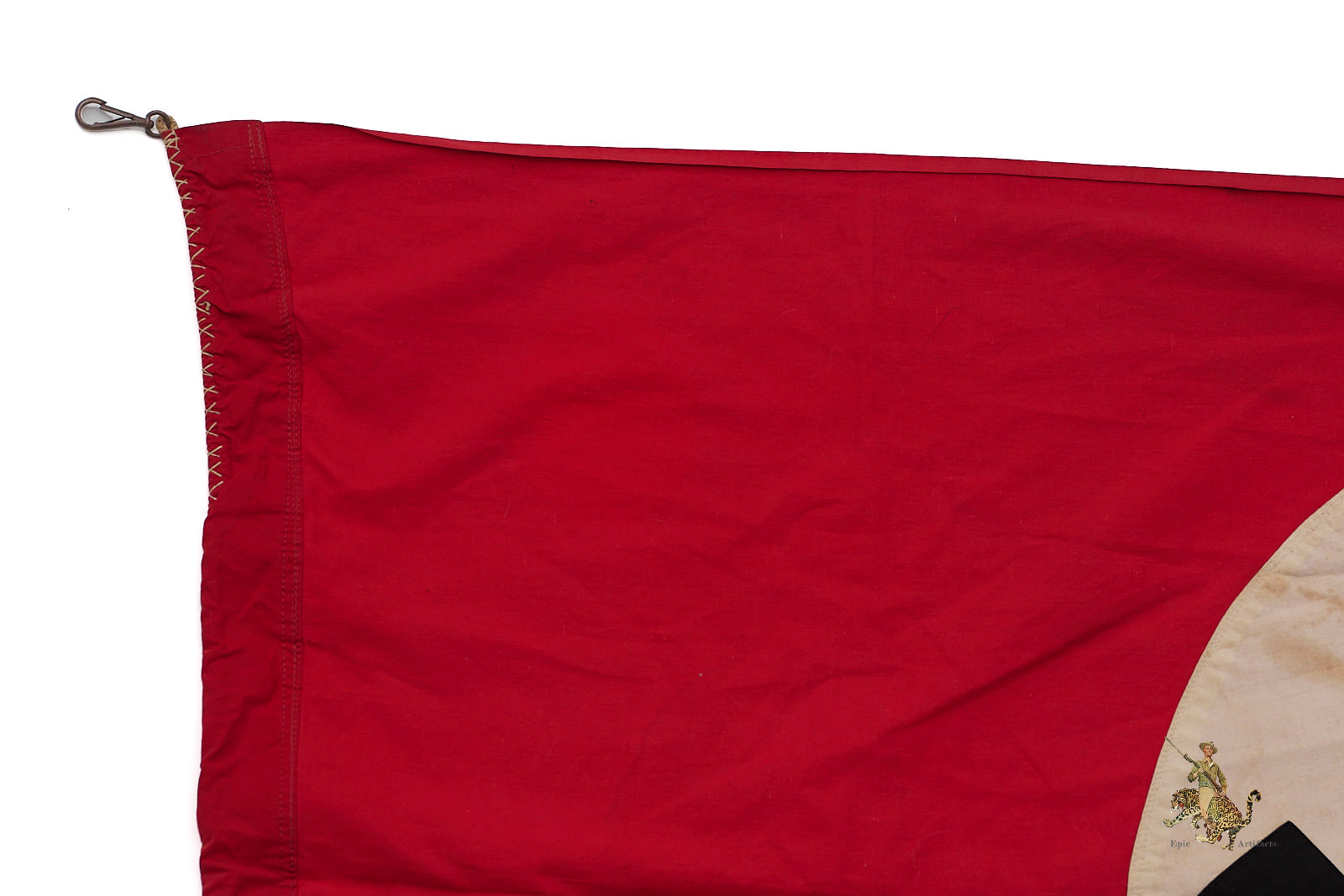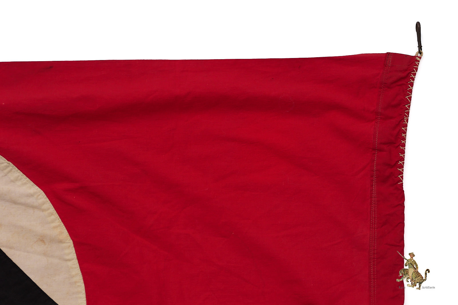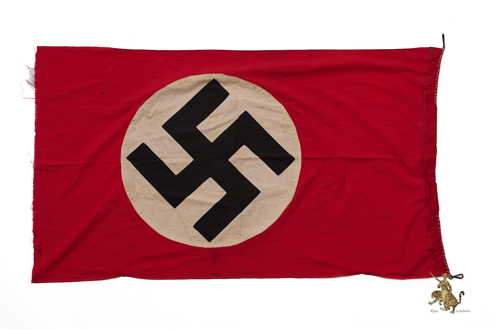 Product Description:  The NSDAP Flag 30″ x 50″ Cut-Off w/ Hooks is a Third Reich–era political textile, presented in excellent overall condition and notable for its practical display modifications. Originally part of a larger banner, the flag has been cut down and now measures approximately 30 by 50 inches, the trimmed end showing evidence of period alteration.